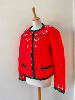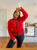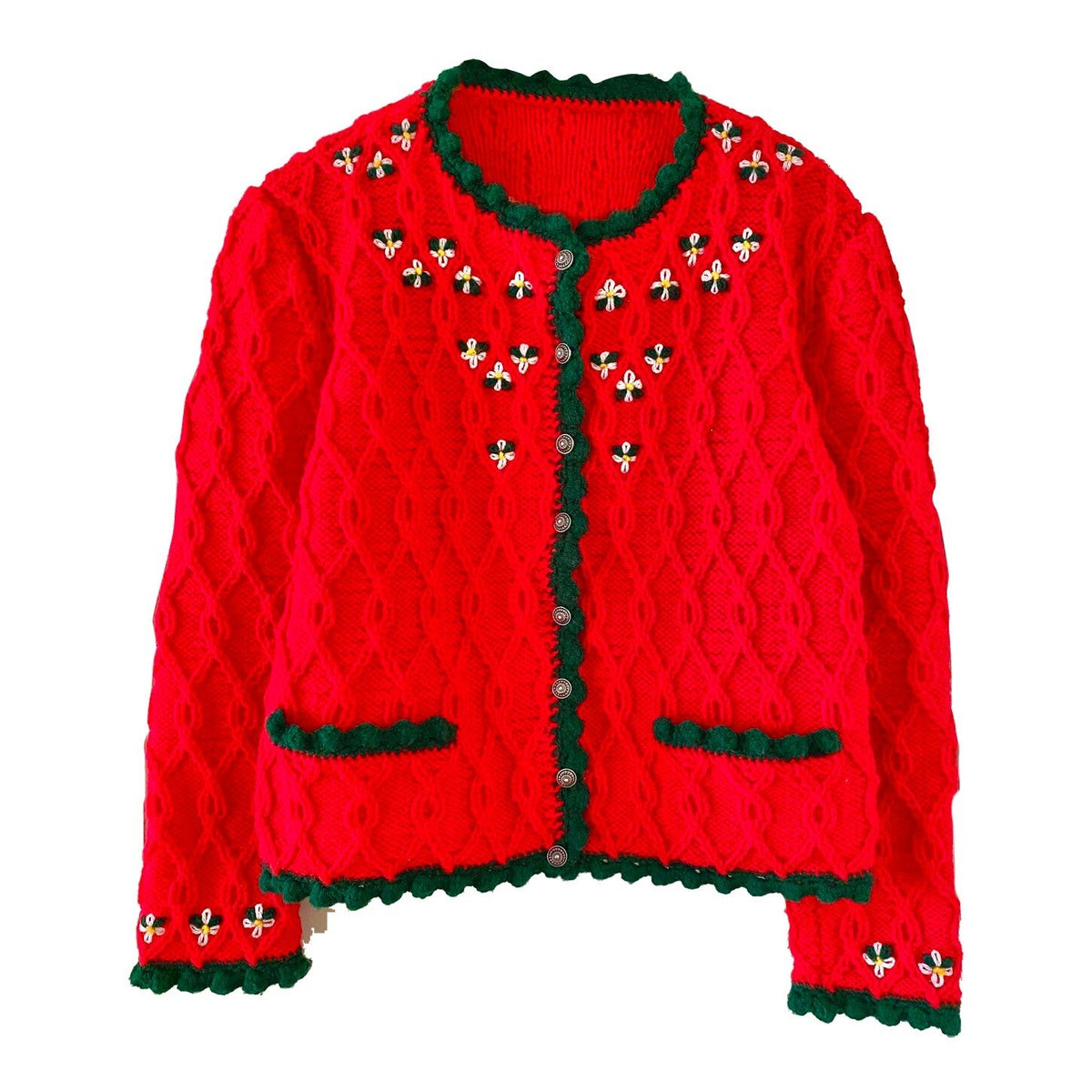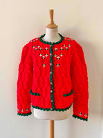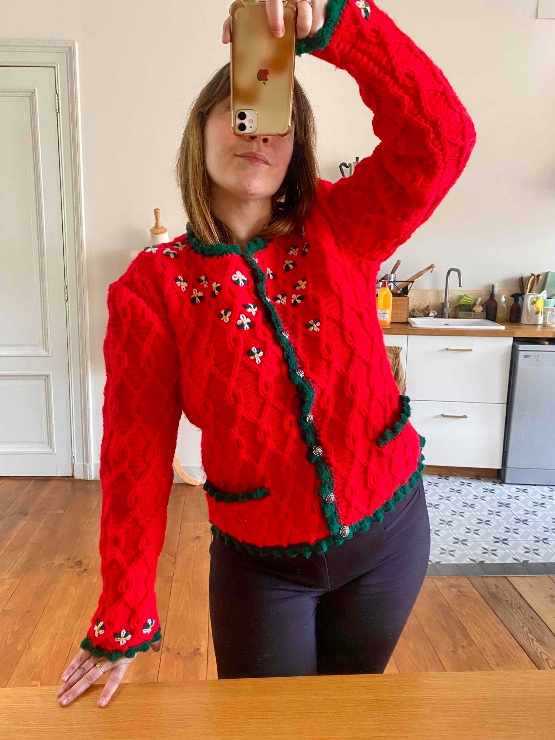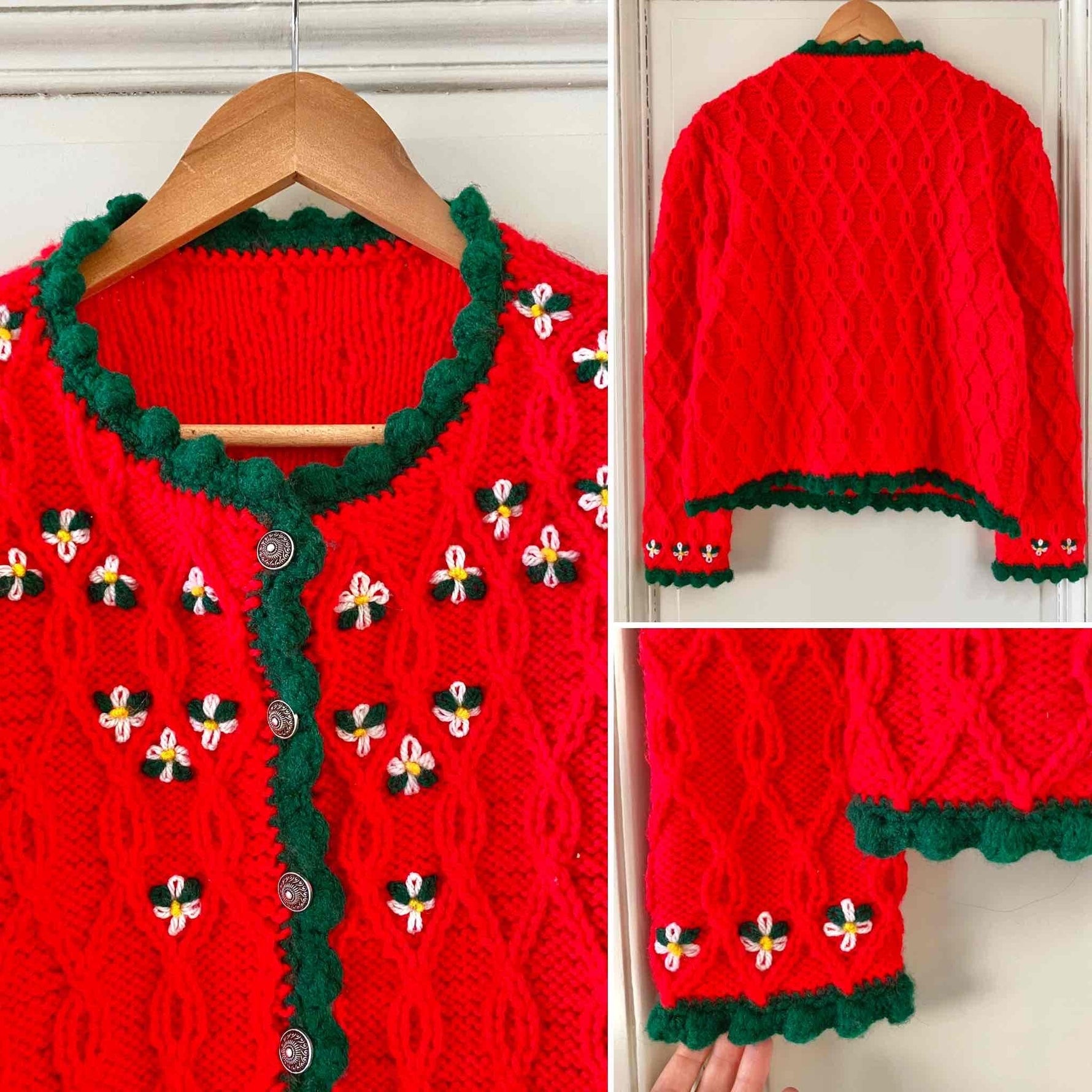 Unit price perAustrian-style cardigan in red wool, with a twisted cable knit pattern and embroidered green pom-pom borders, embroidered with white, yellow and green flowers, silver-colored floral jeweled buttons, size 38/40, shown here on a size 36 mannequin and a size 40 person.