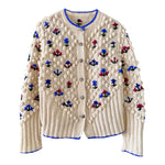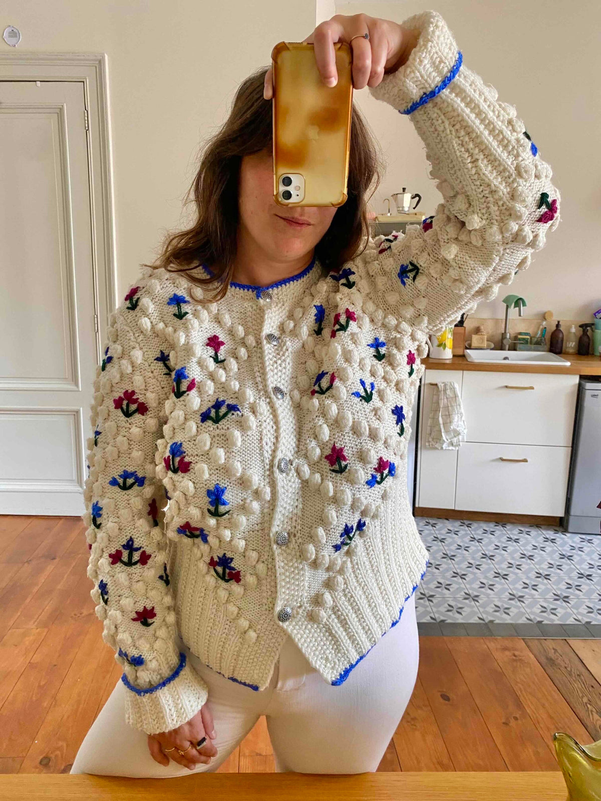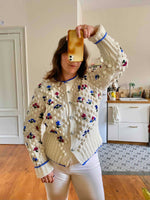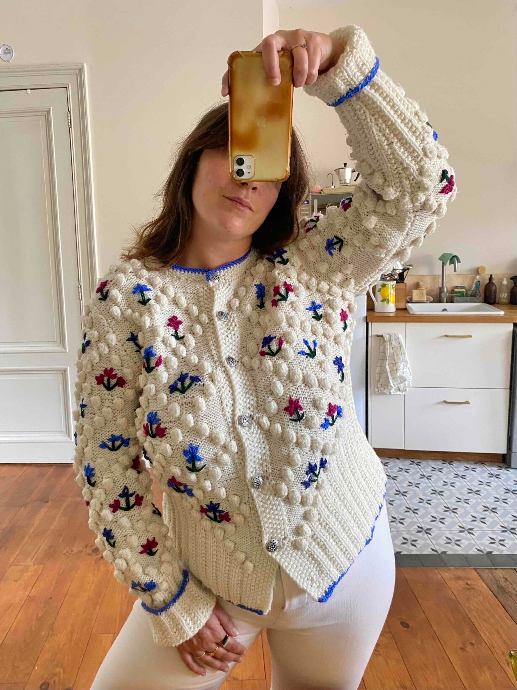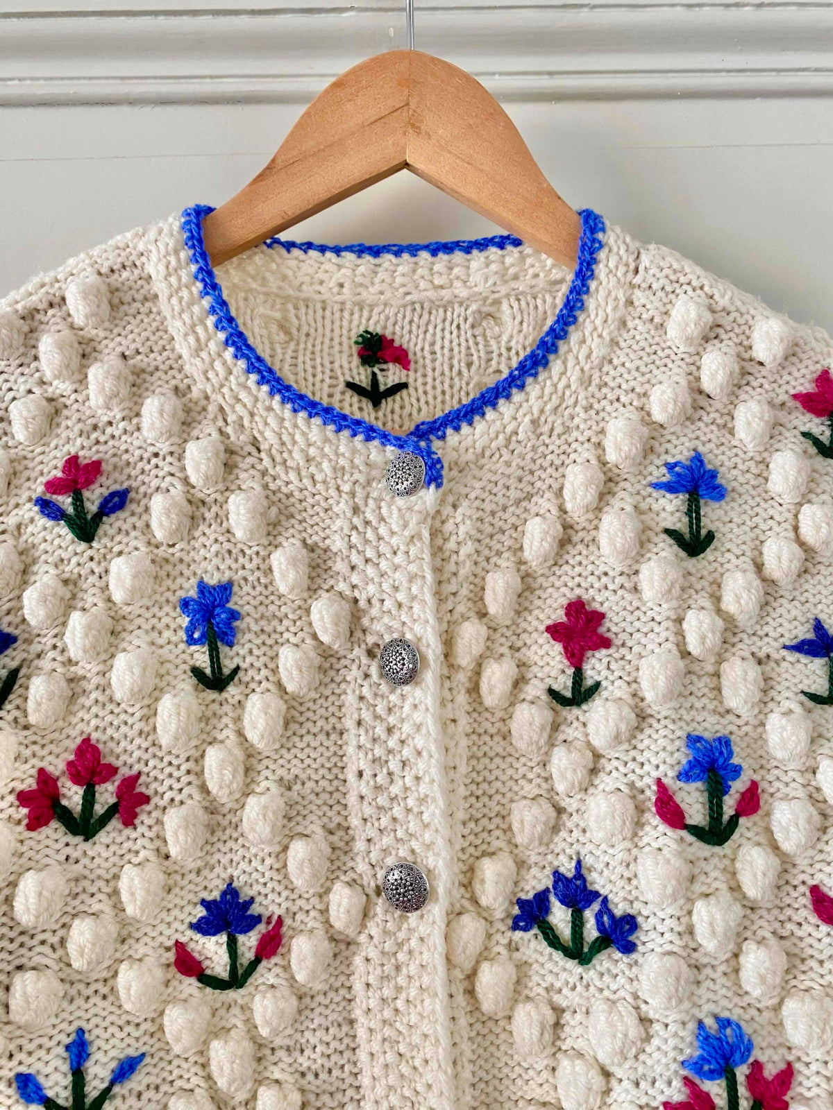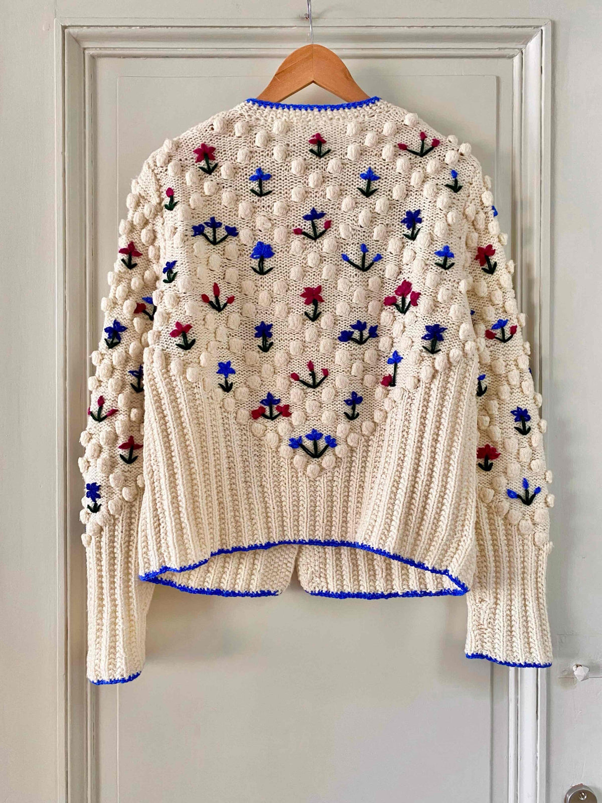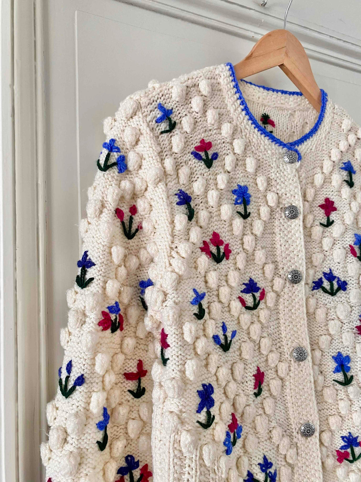 Unit price perAustrian cardigan in ecru wool blend, popcorn stitch with embroidered pom-poms, embroidered fuchsia, periwinkle blue and bottle green flowers, embroidered balloon sleeves, silver-colored floral jewelry buttons, hand-knitted in Austria, size 40 shown here on a size 40 model.