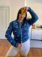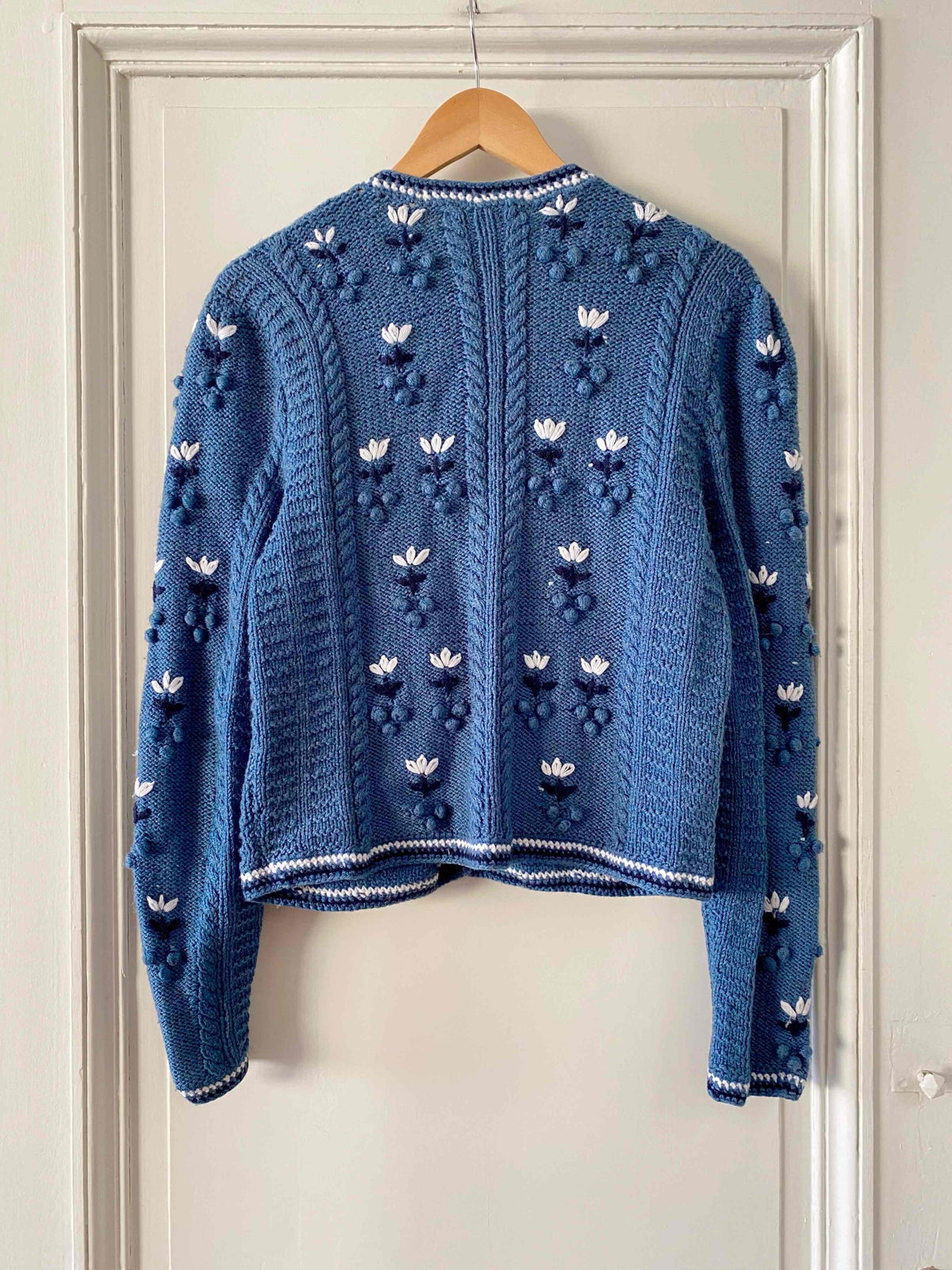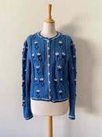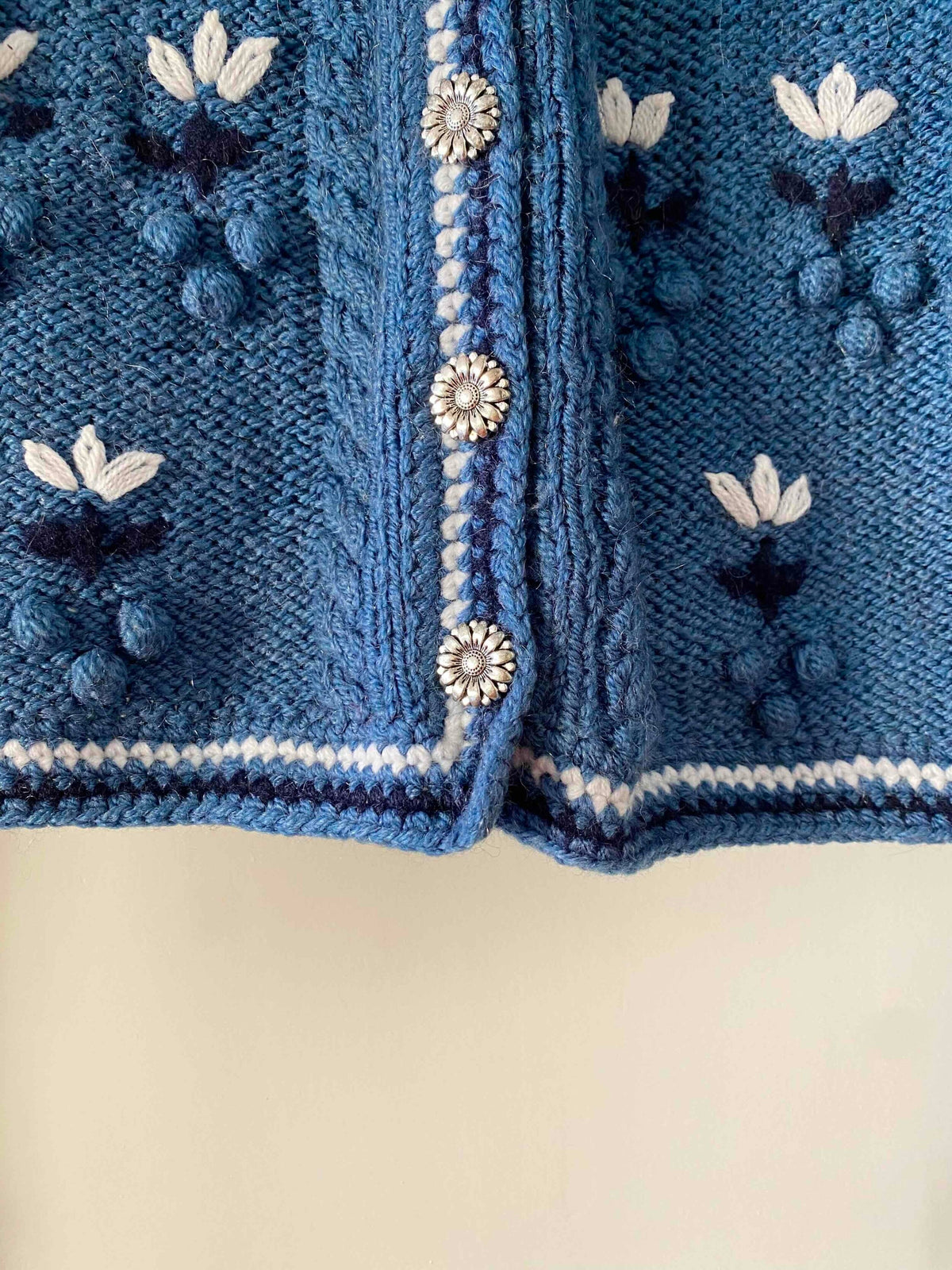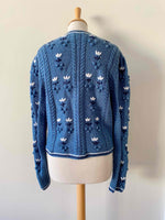 Unit price perAustrian cardigan in periwinkle blue wool, popcorn stitch with embroidered pom-poms, entirely embroidered with white and navy flowers, tricolor crochet edging, silver daisy flower buttons, short length with embroidered balloon sleeves, hand-knitted in Austria, size 38 shown here on a size 36 mannequin and on a size 40 person.