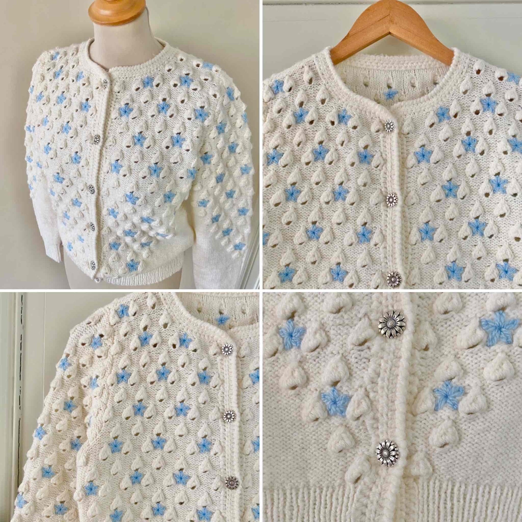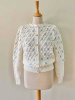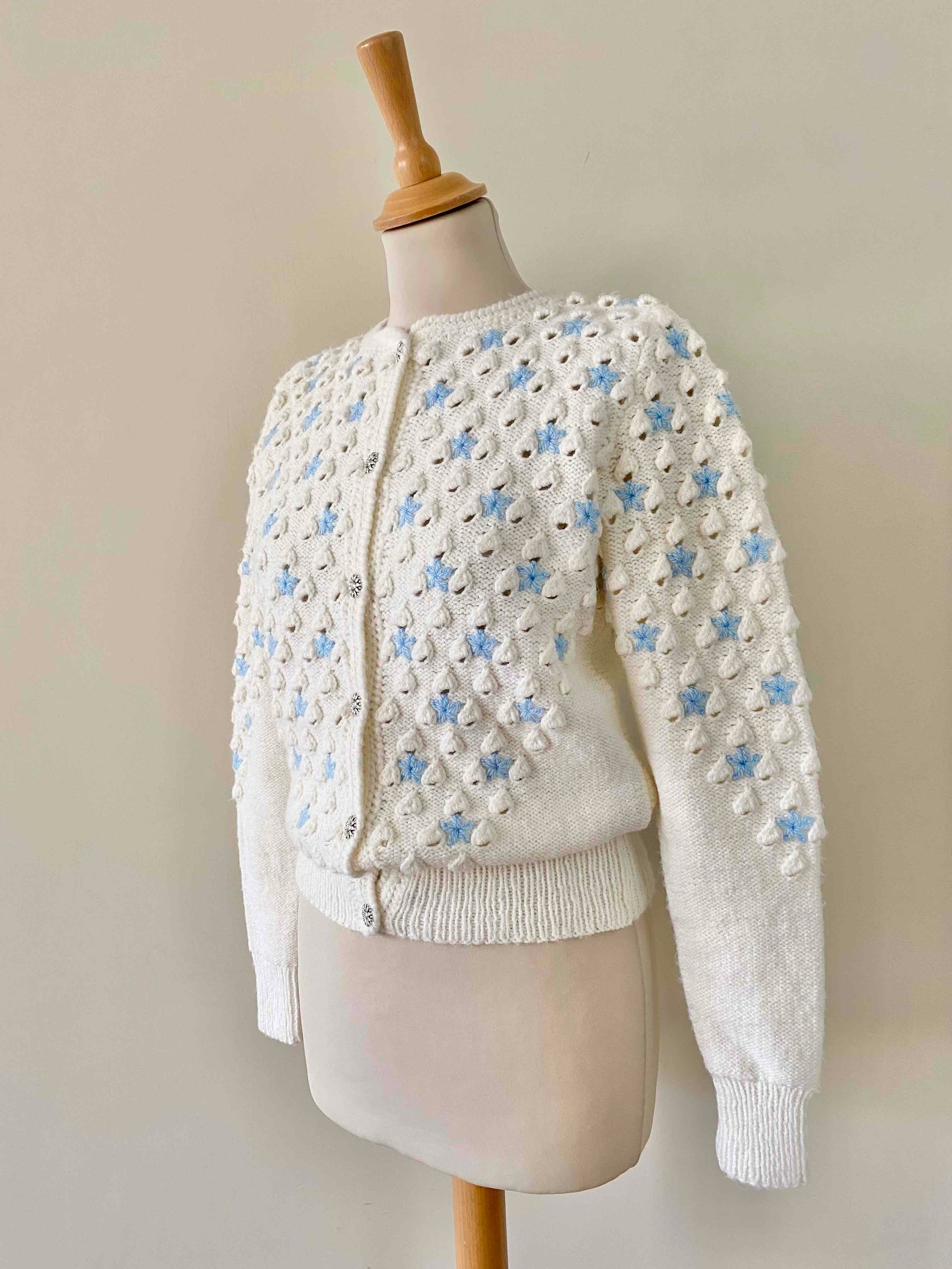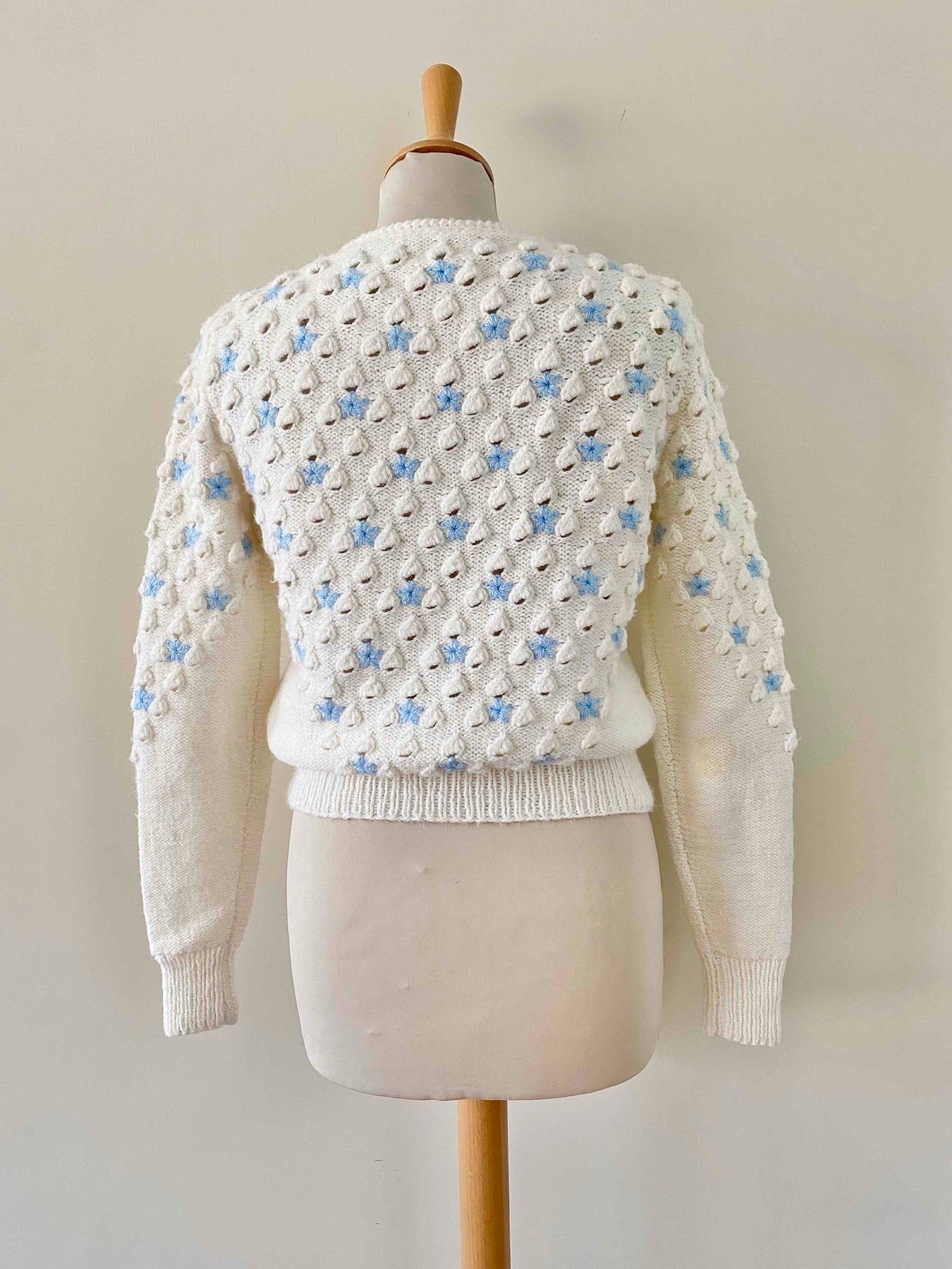 Embroidered, textured, and openwork popcorn knit.