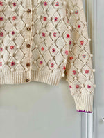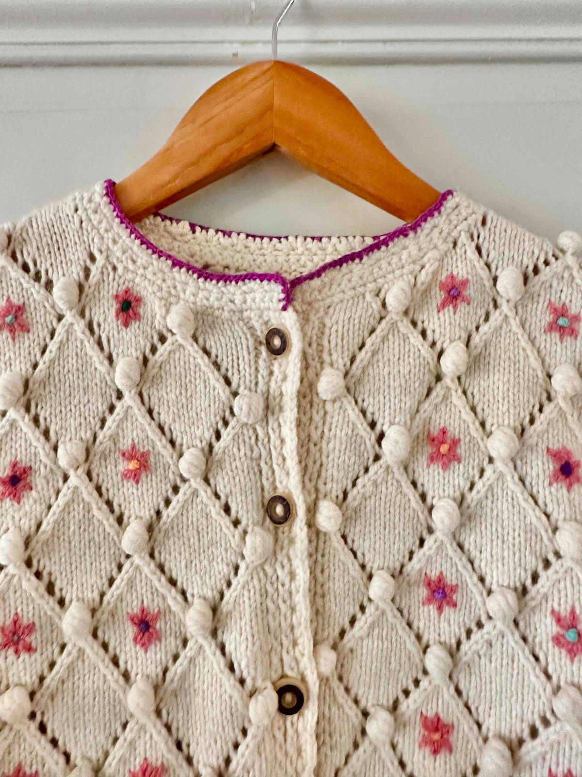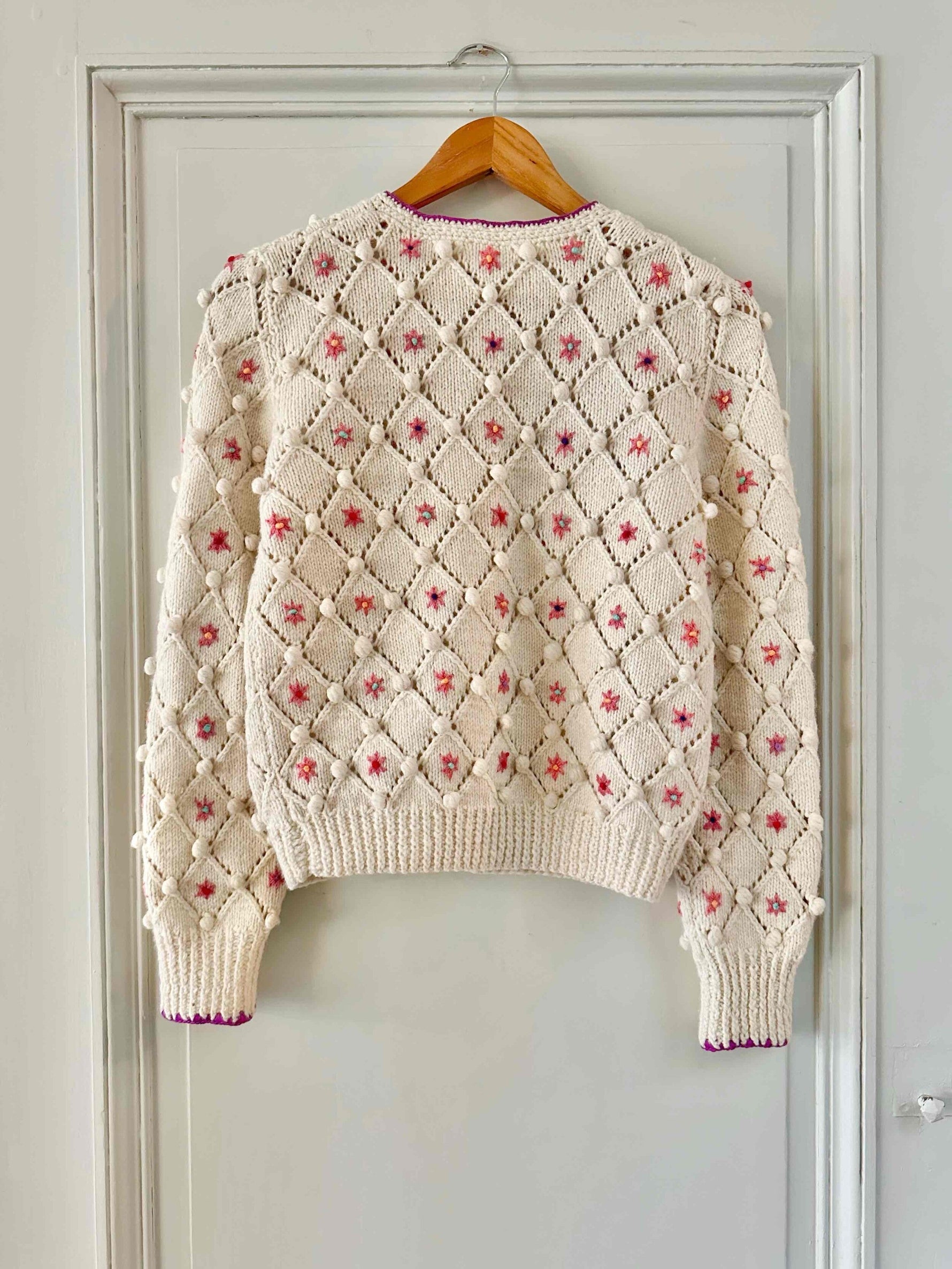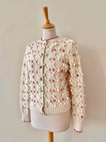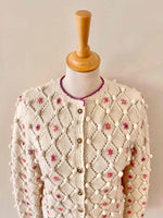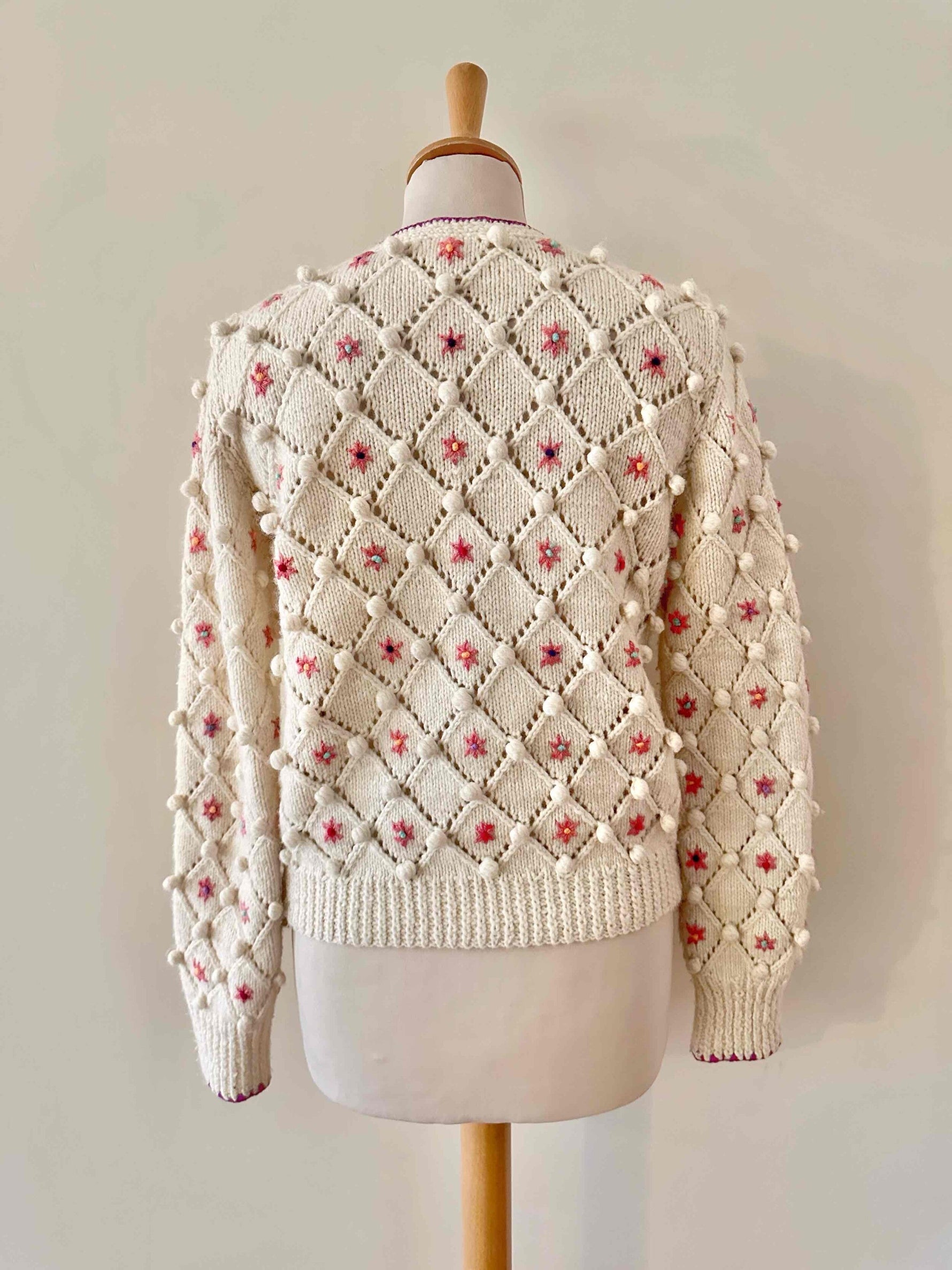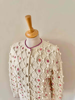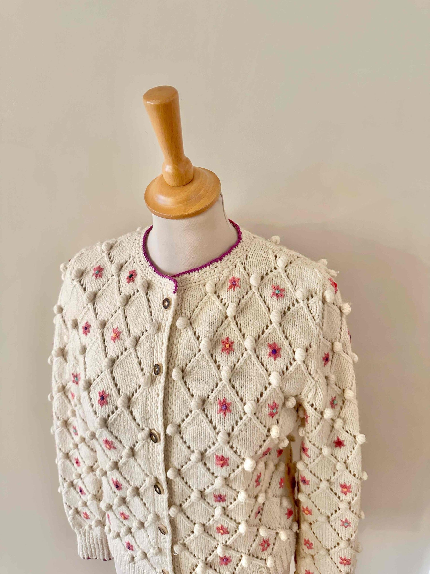 Unit price perAustrian cardigan in pure cream wool, popcorn stitch with embroidered pom-poms and openwork cross-stitch, embroidered with pink flowers with multicolored blue, yellow, and purple centers, purple borders, wooden buttons, knitted and embroidered by hand in Austria, sizes 34 and 36 shown here on a size 36 mannequin.