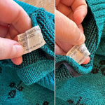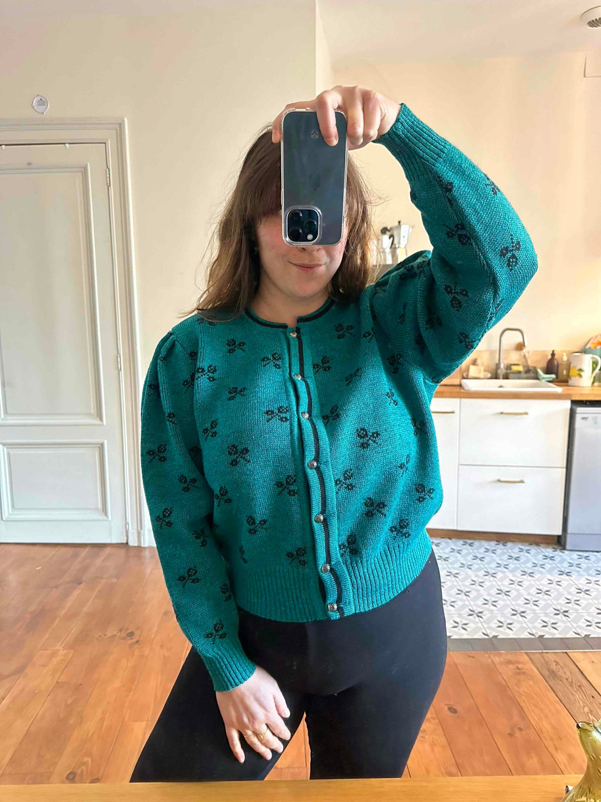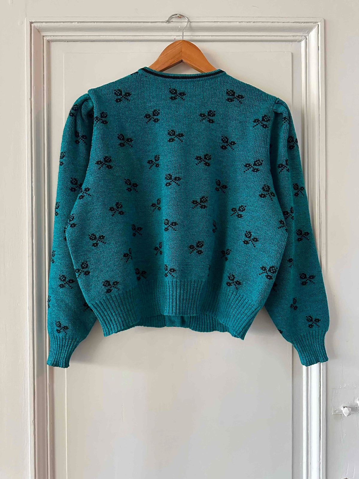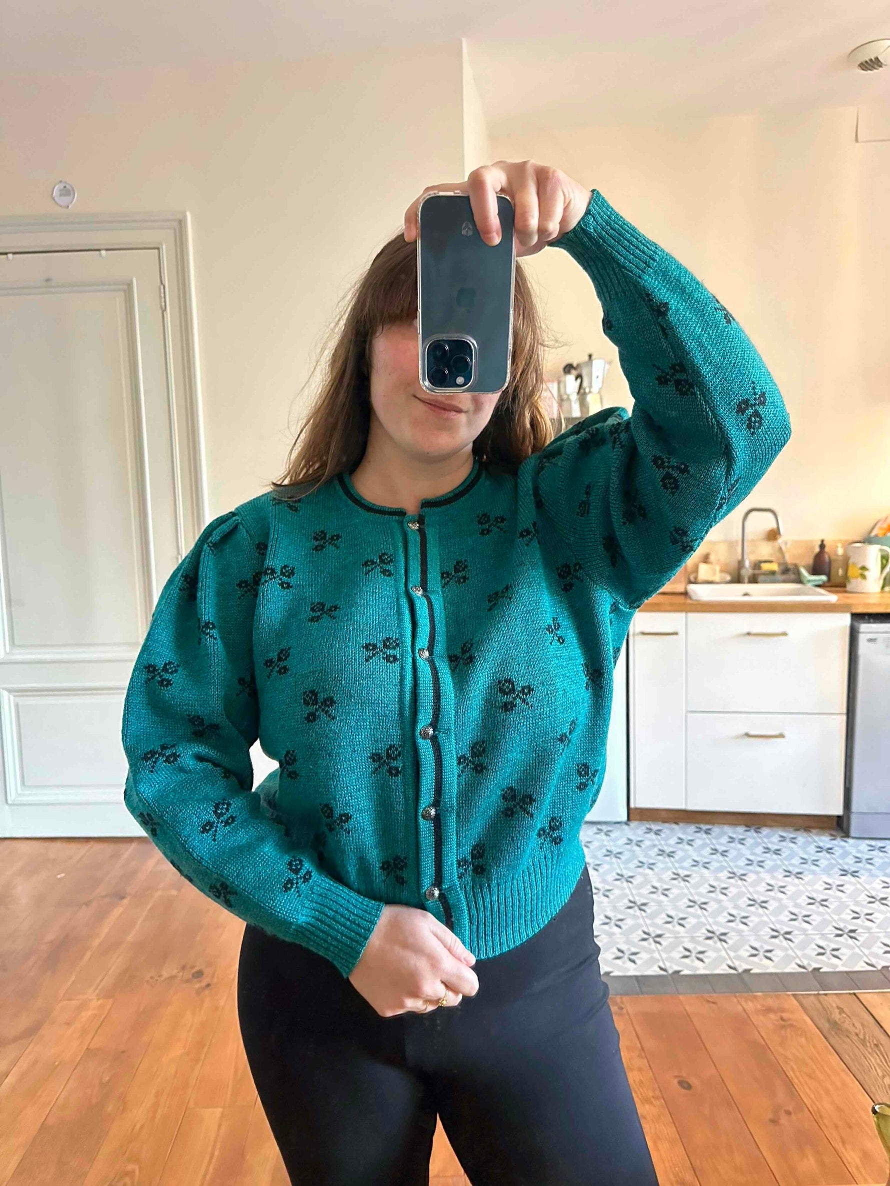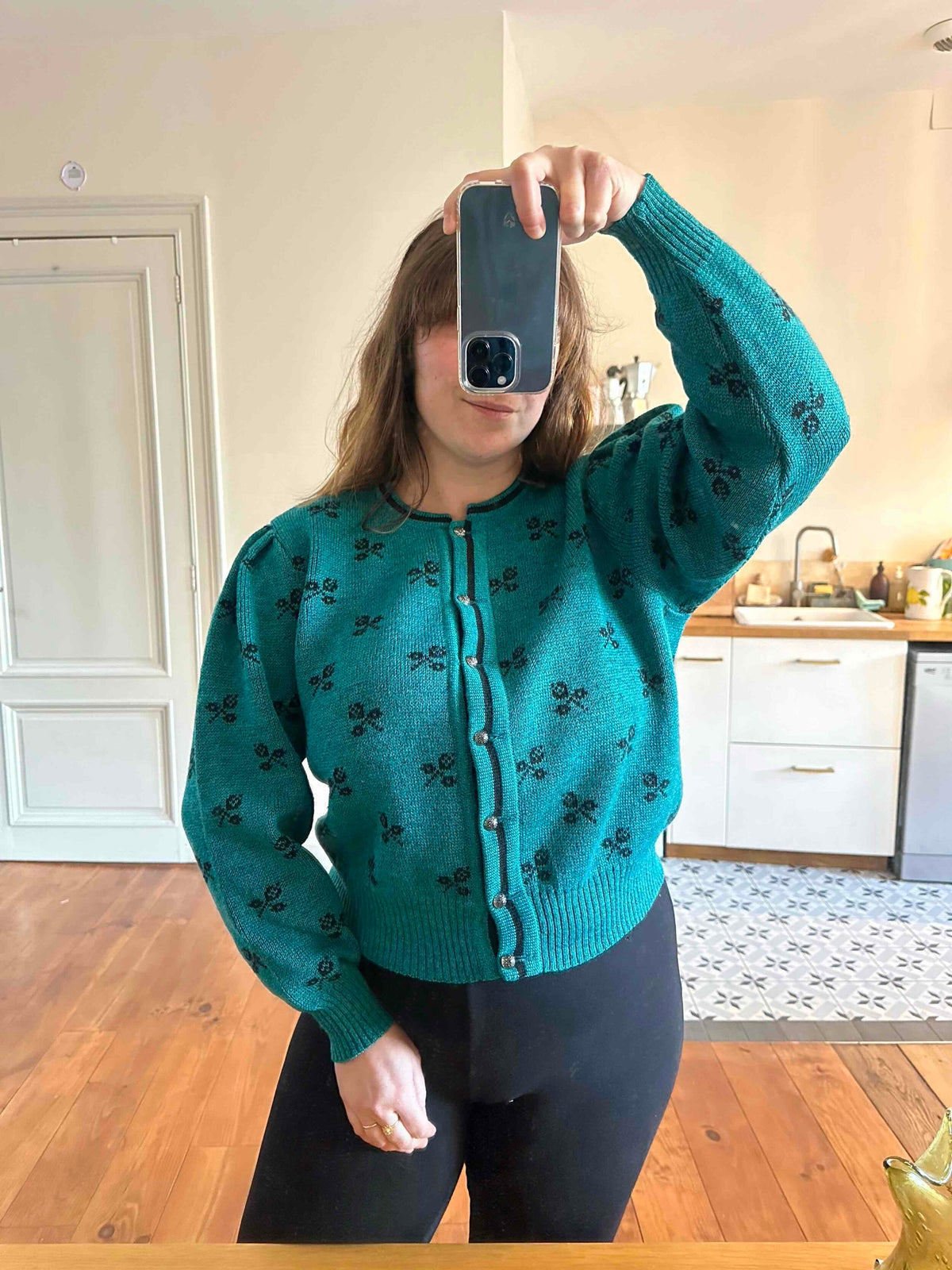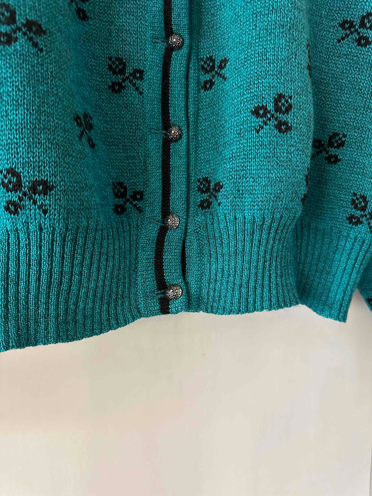 Unit price perAustrian cardigan in pure green-teal wool, with a jacquard pattern of black flowers, balloon sleeves, a short sweatshirt shape, and silver-colored floral jeweled buttons. Made in Italy, sizes 38 and 40 (worn here by a size 40 model).