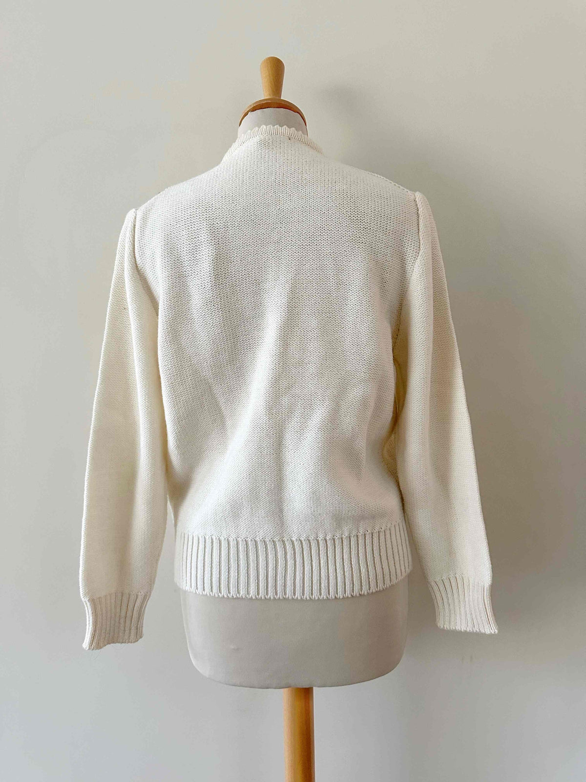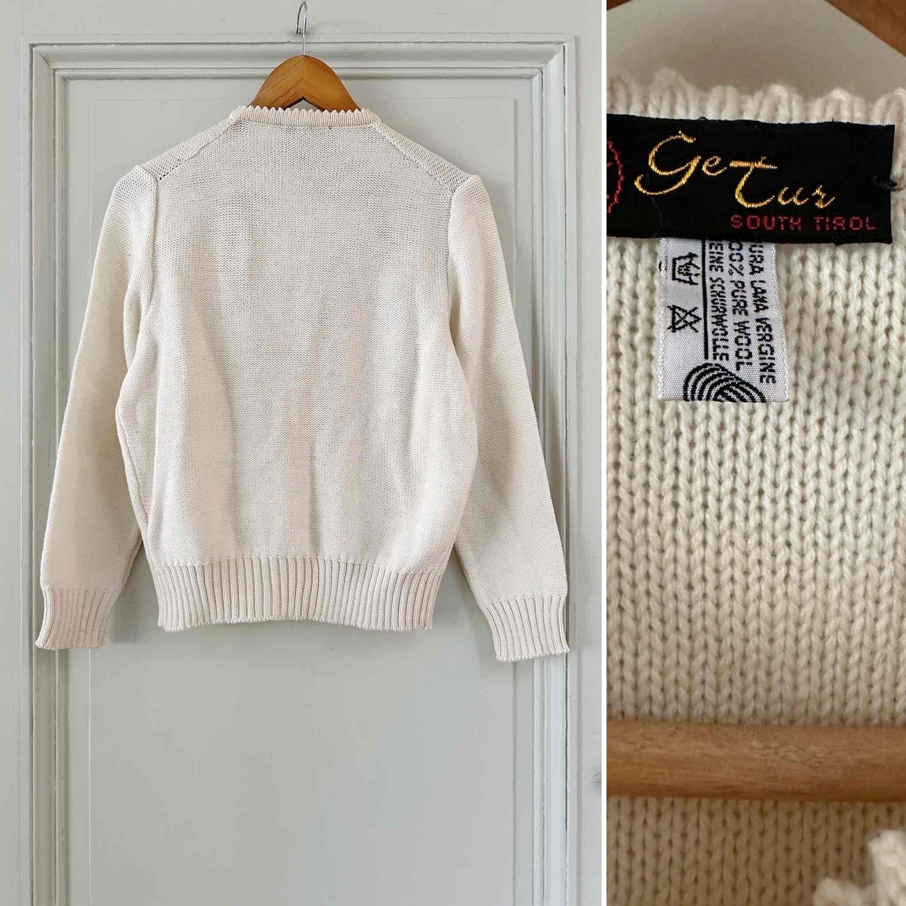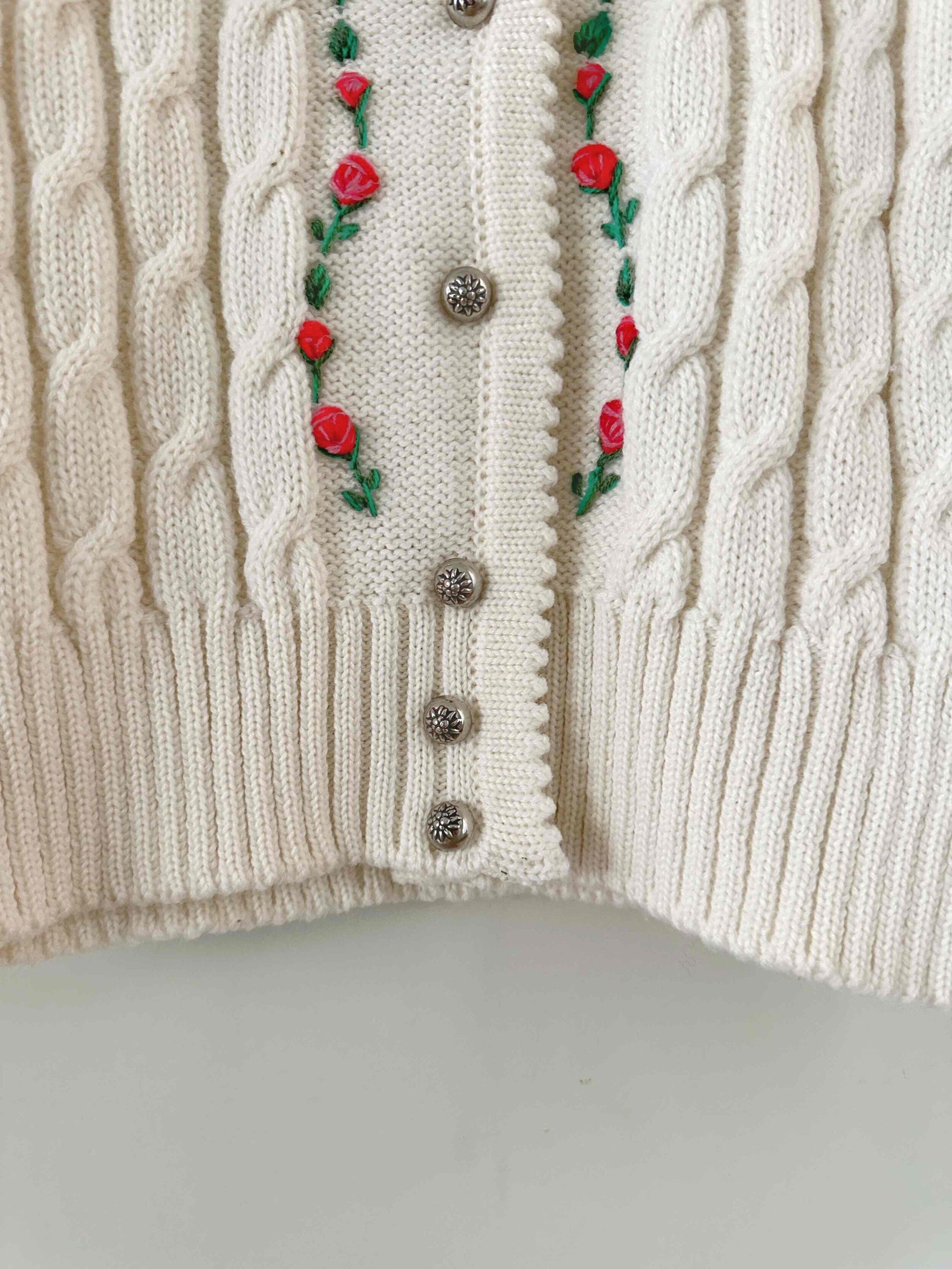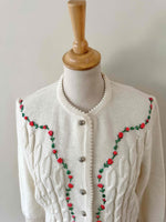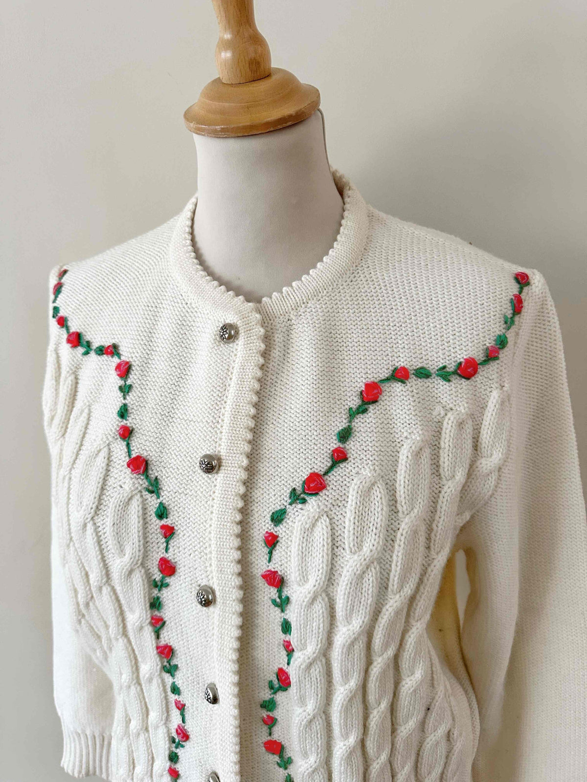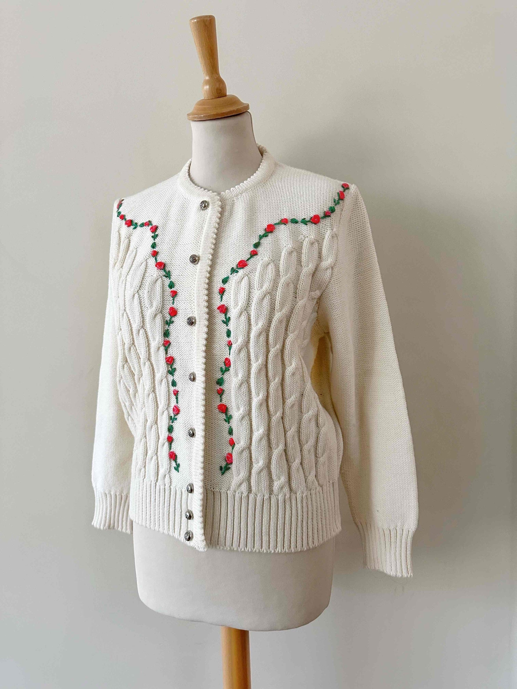 Unit price perAustrian cardigan in pure off-white wool, with a twisted knit and embroidered with flowers in bright red and green stripes, floral silver-colored jeweled buttons, made in Austria, sizes 36 and 38, shown here on a size 36 mannequin.