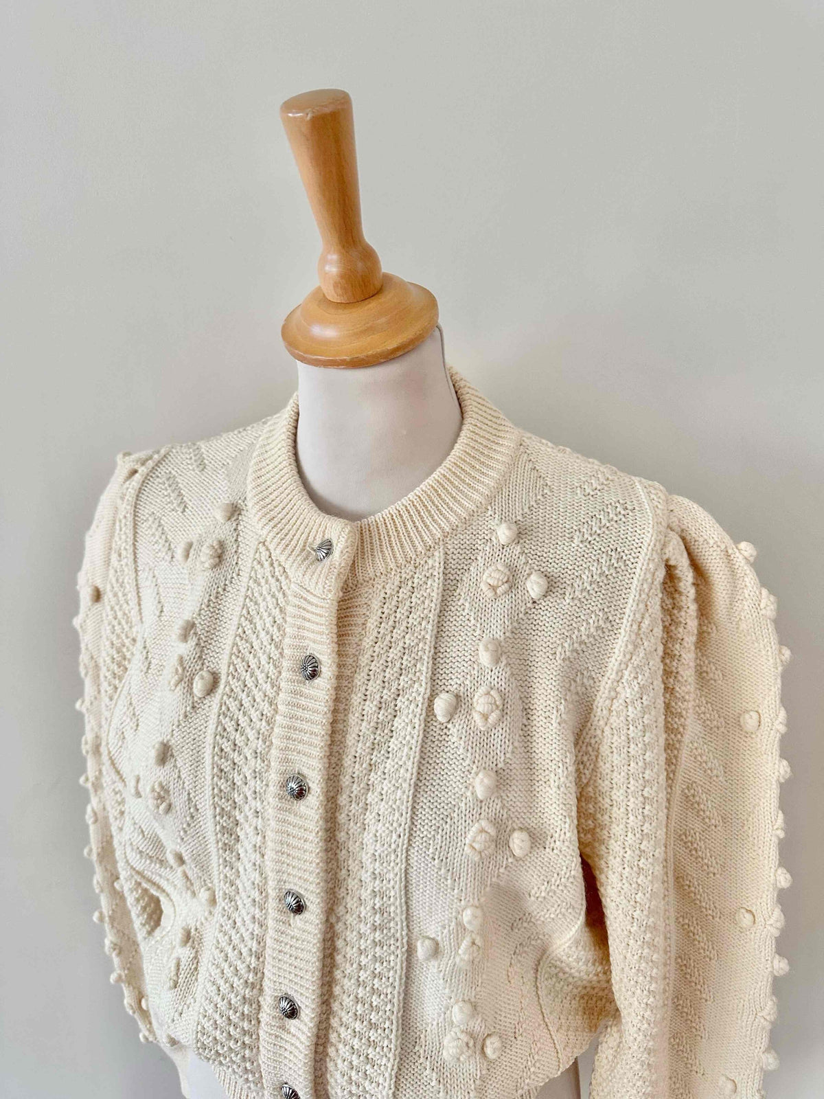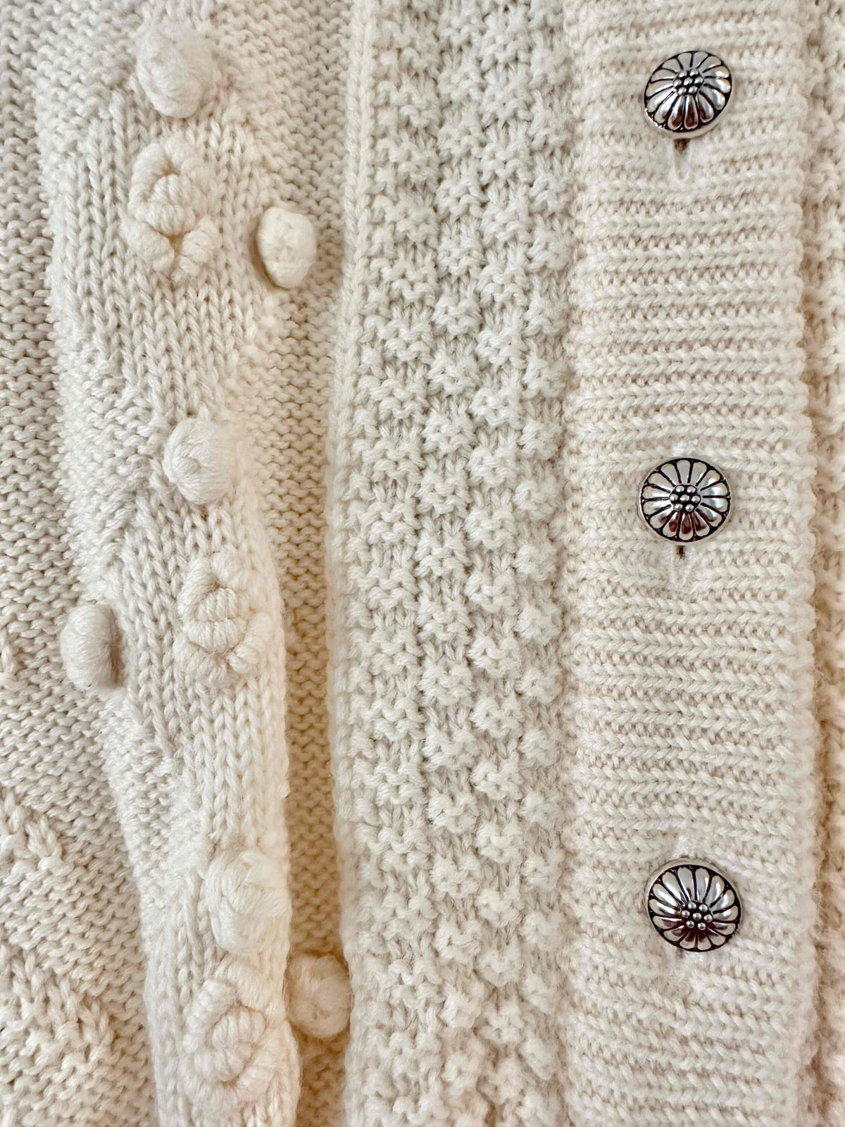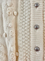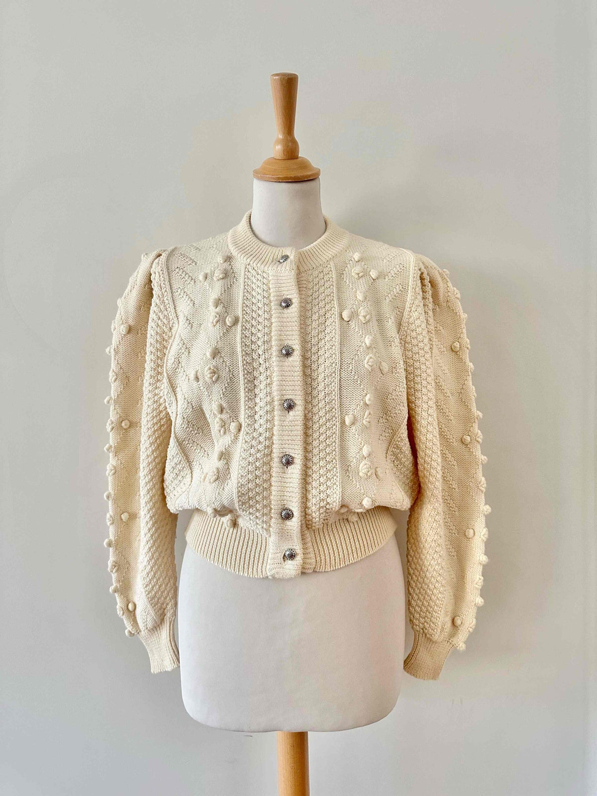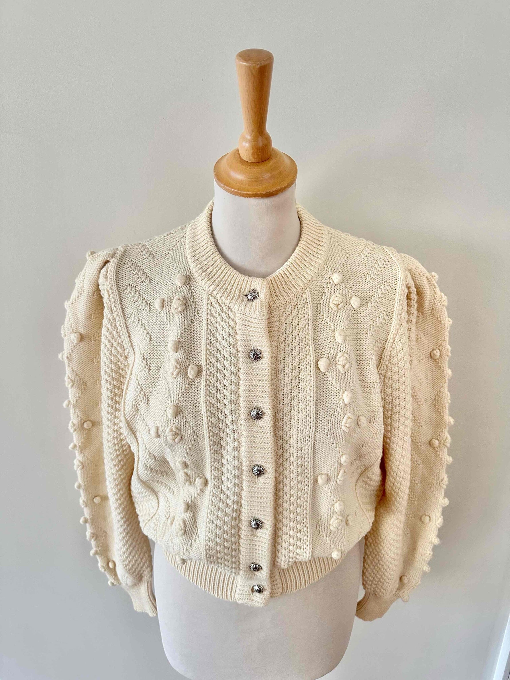 Unit price perAustrian cardigan in pure off-white wool, popcorn knit with embroidered pom-poms, tone-on-tone embroidered flowers, gathered and embroidered balloon sleeves, daisy-shaped silver-colored jewel buttons, cropped shape, made in Austria, size 36 shown here on a size 36 mannequin.
