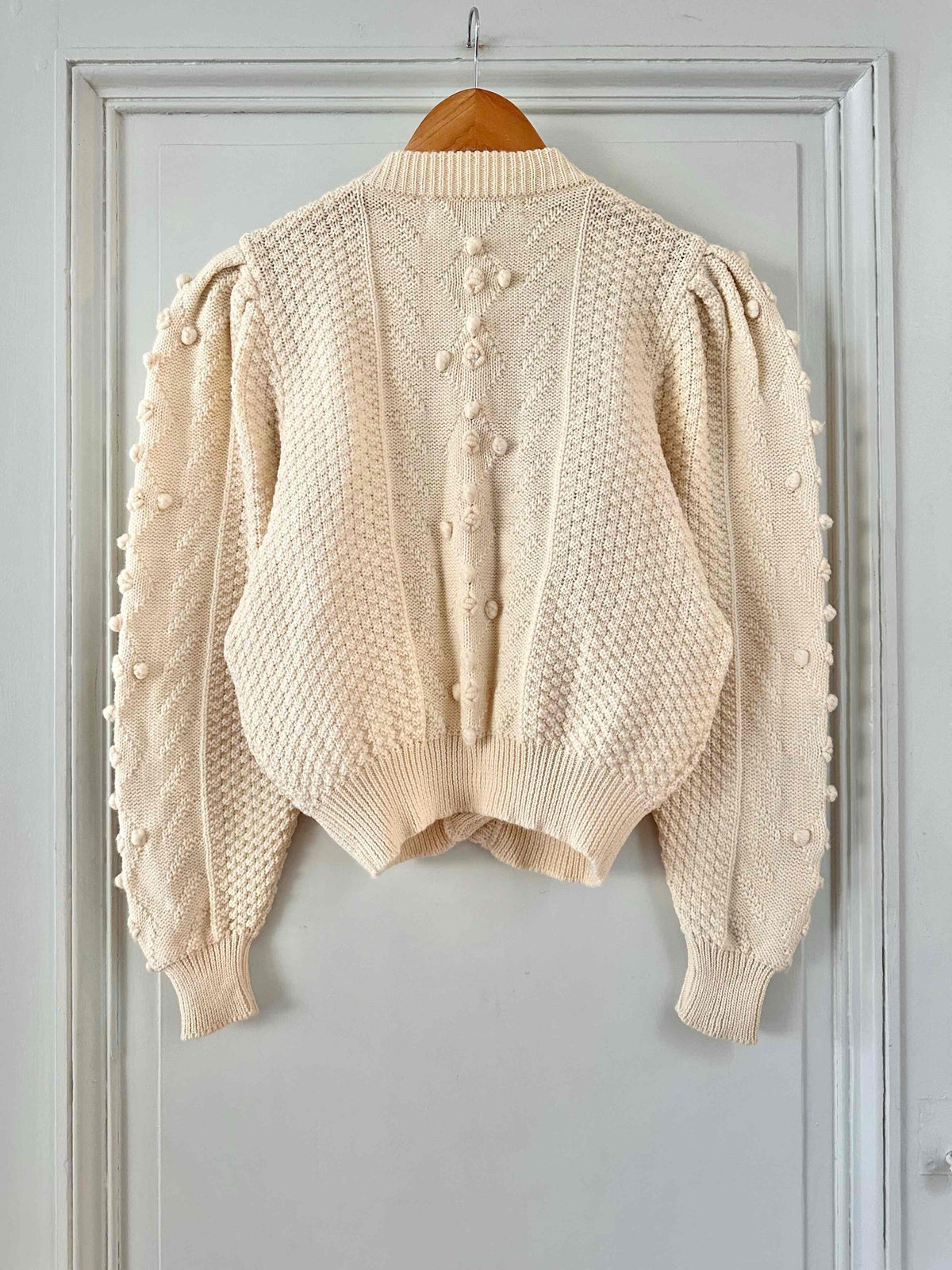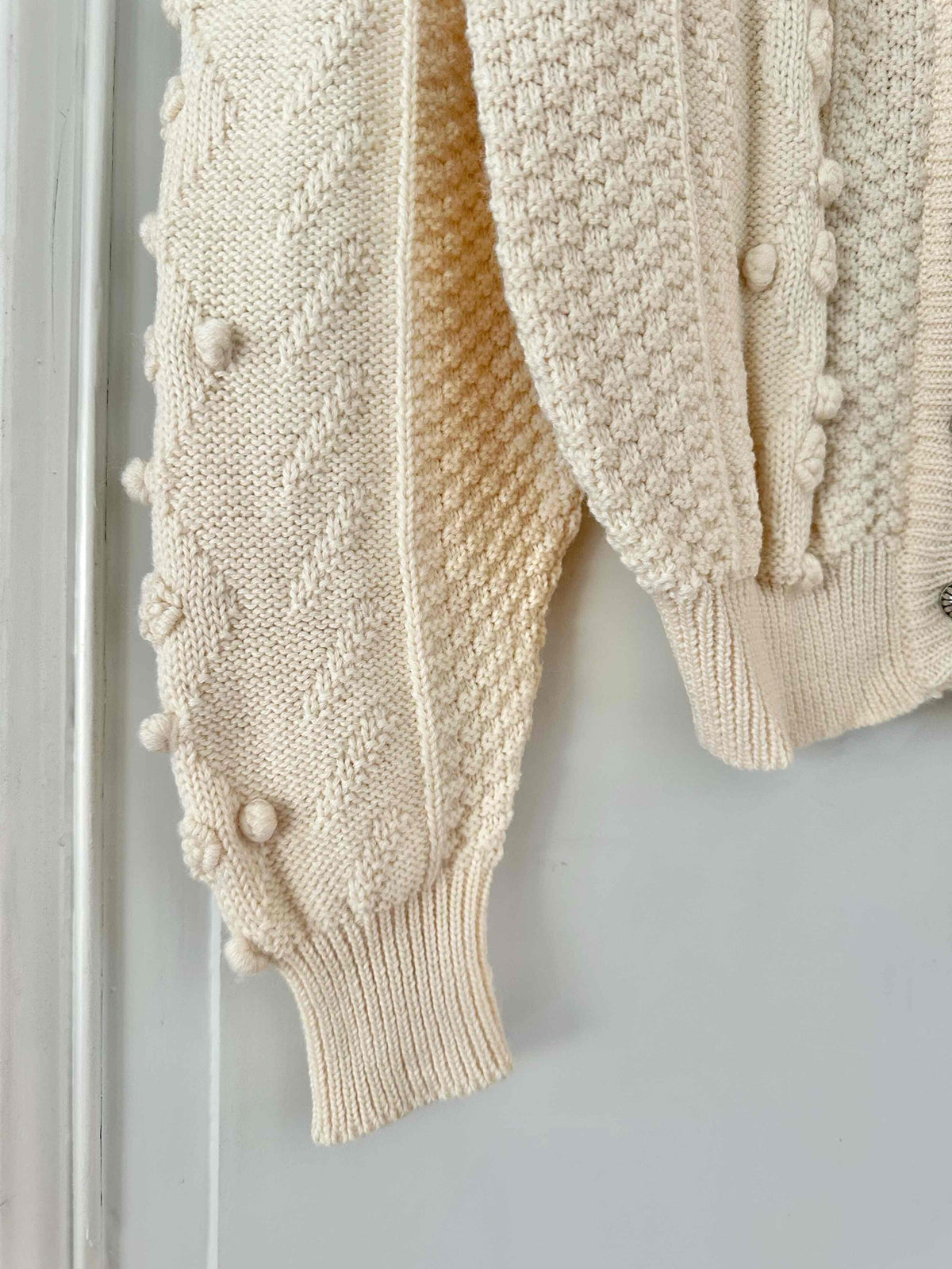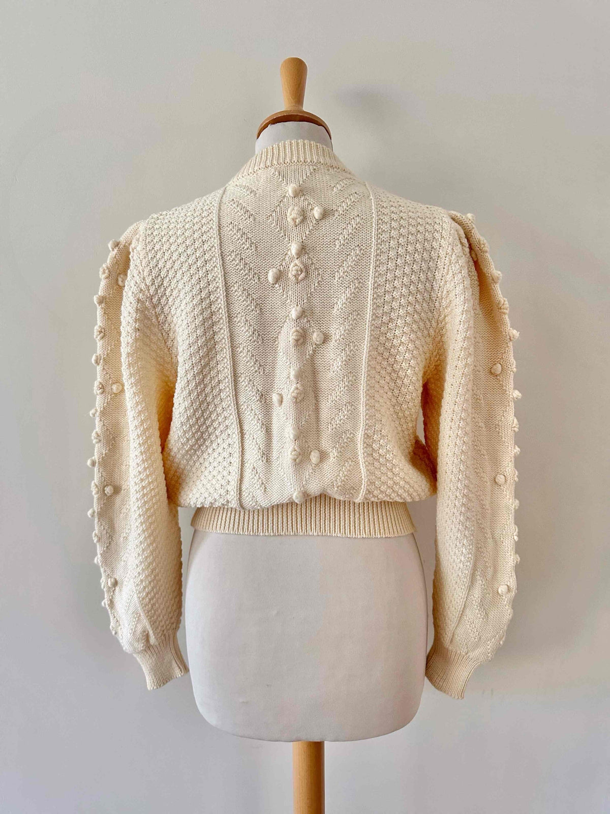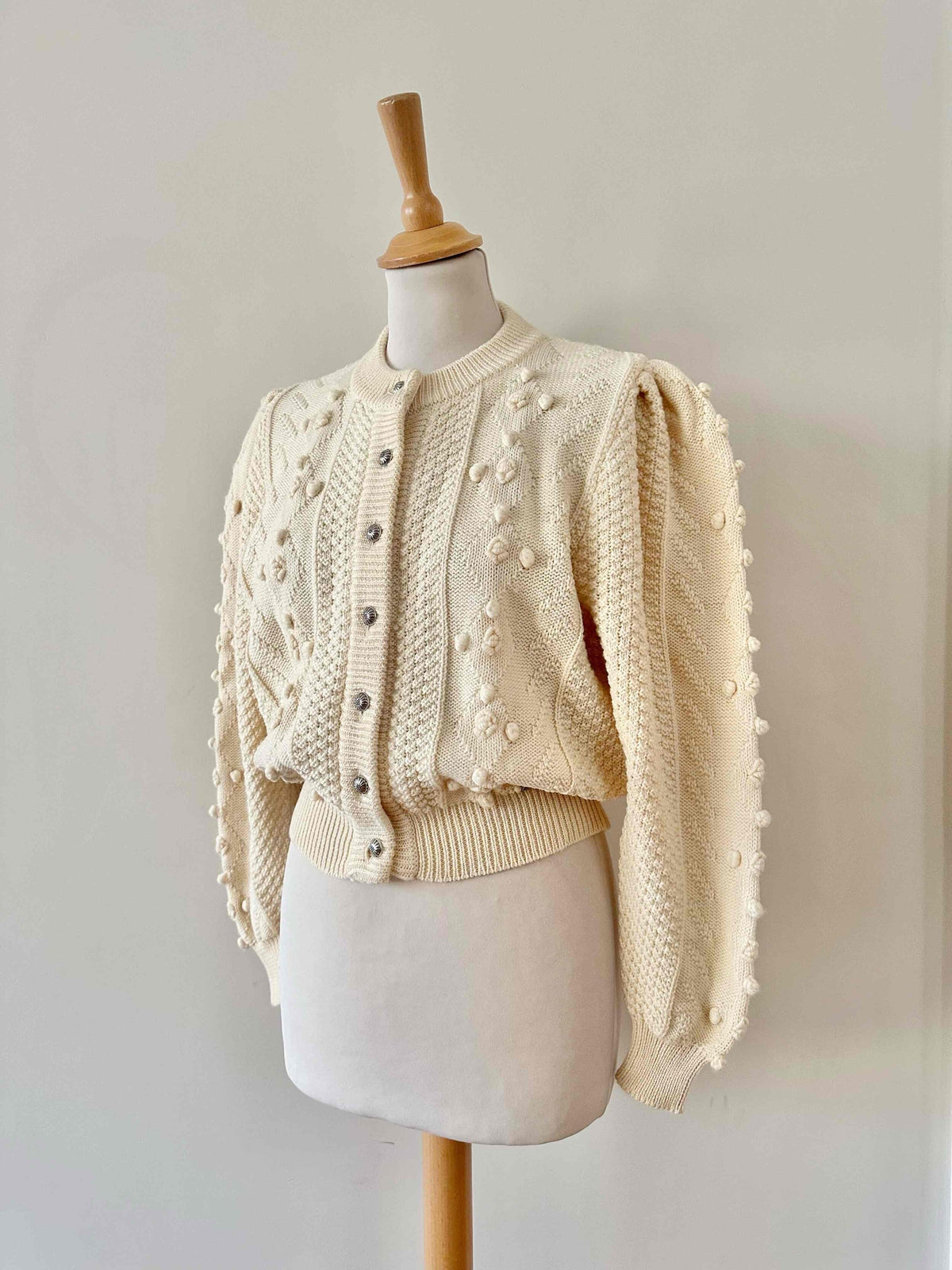 Unit price perAustrian cardigan in pure off-white wool, popcorn knit with embroidered pom-poms, tone-on-tone embroidered flowers, gathered and embroidered balloon sleeves, daisy-shaped silver-colored jewel buttons, cropped shape, made in Austria, size 36 shown here on a size 36 mannequin.
