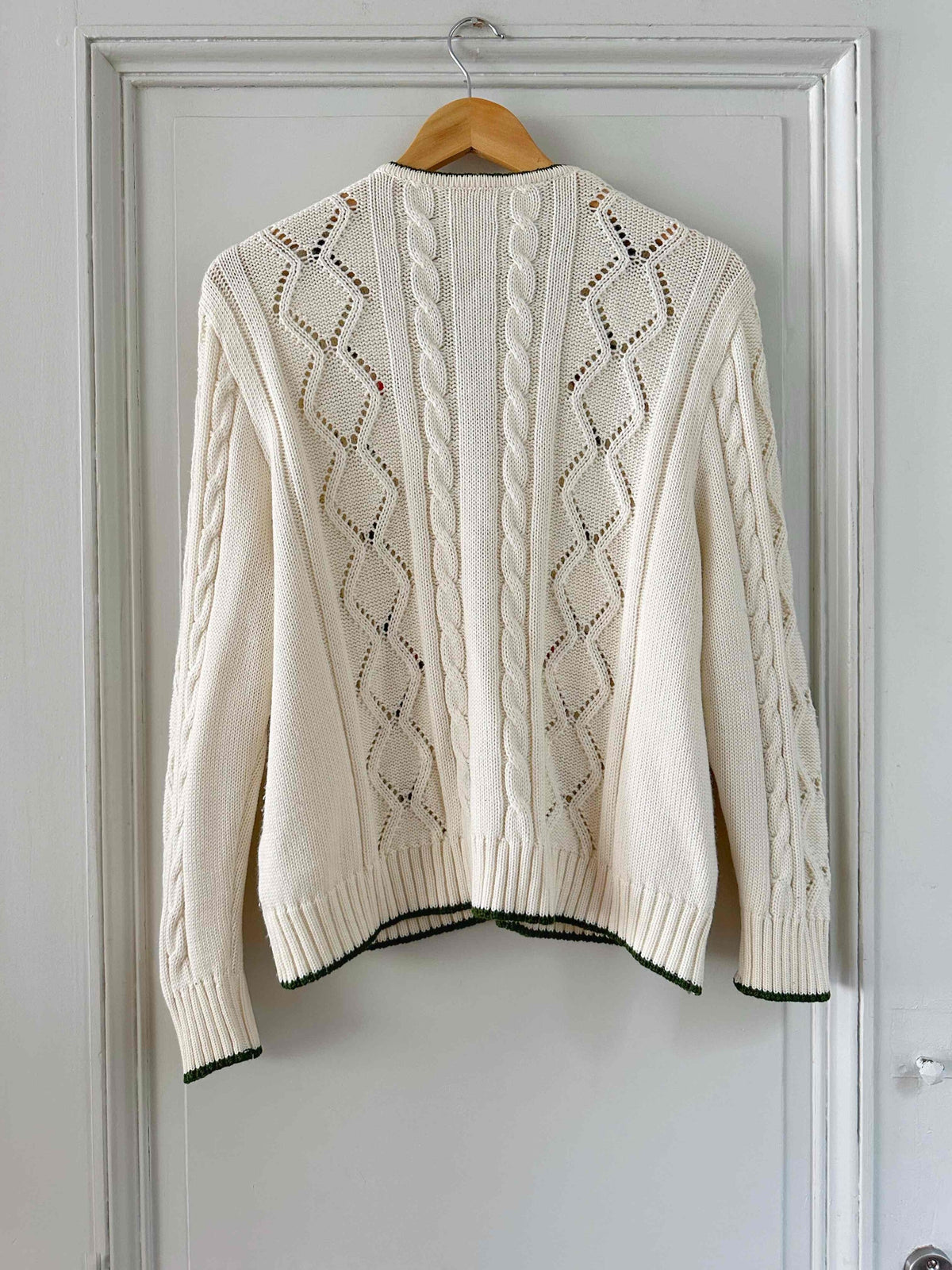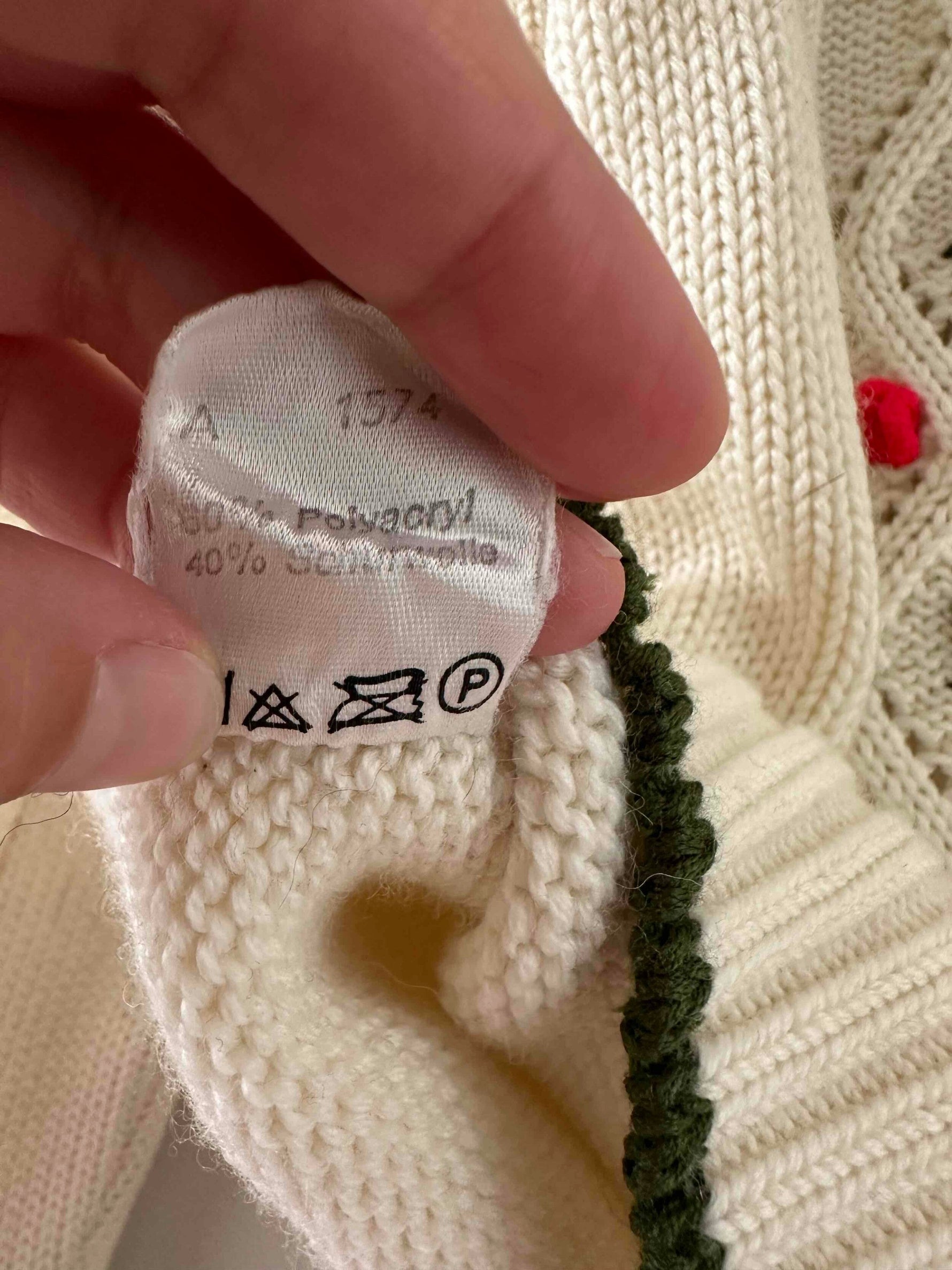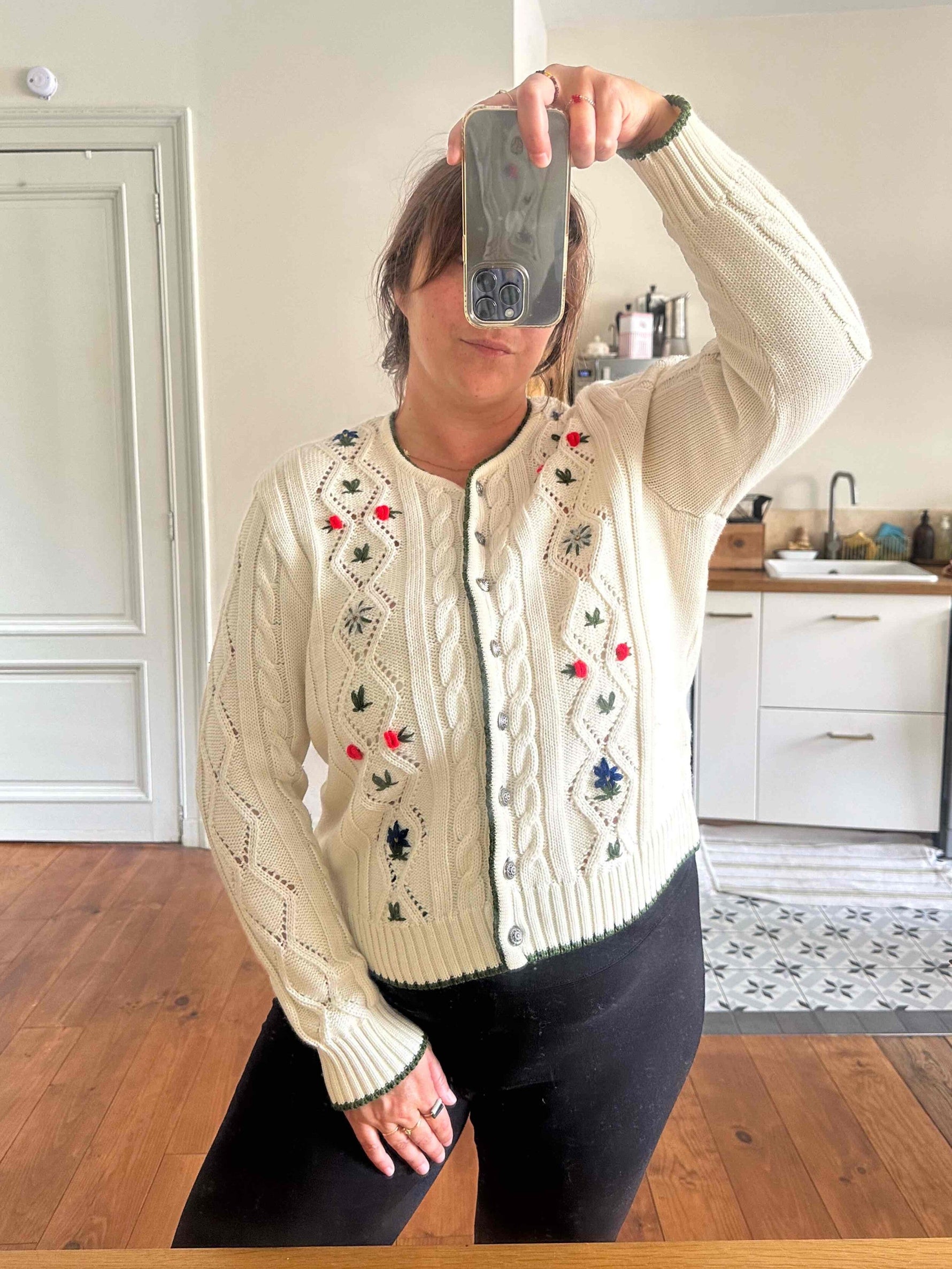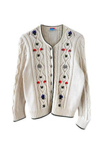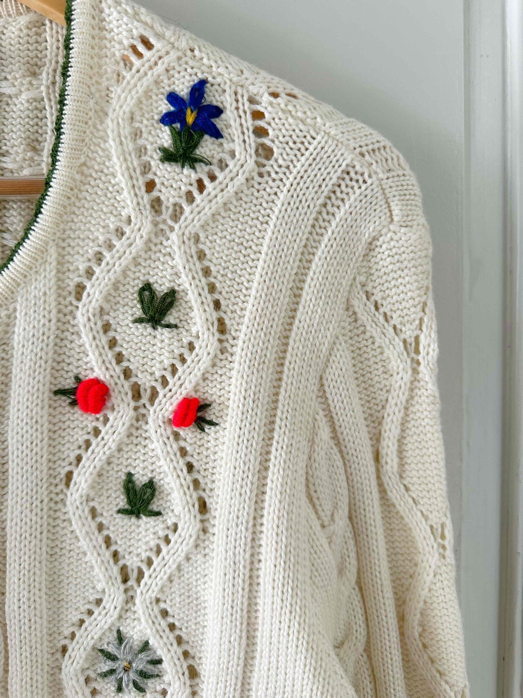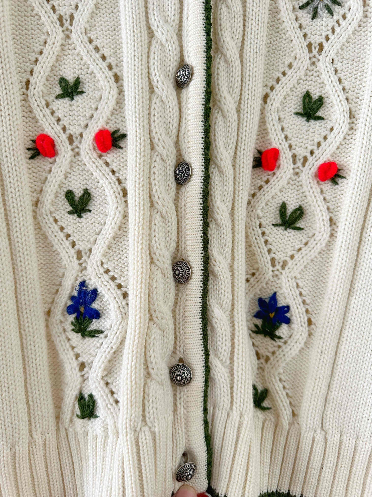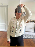 Unit price perAustrian cardigan in ecru blended wool, openwork and twisted knit, multicolored blue, green and red embroidered flowers, silver-colored floral jeweled buttons, made in Austria, size 40 shown here on a size 40 model.