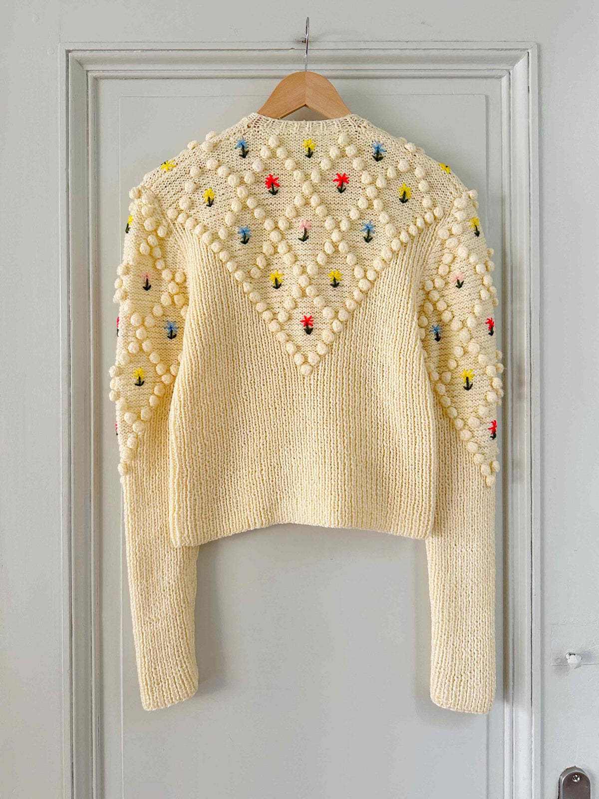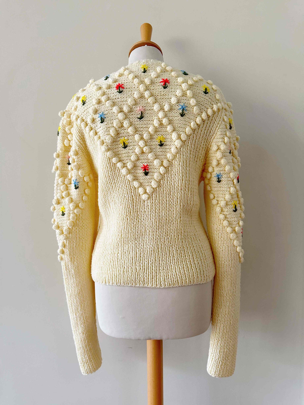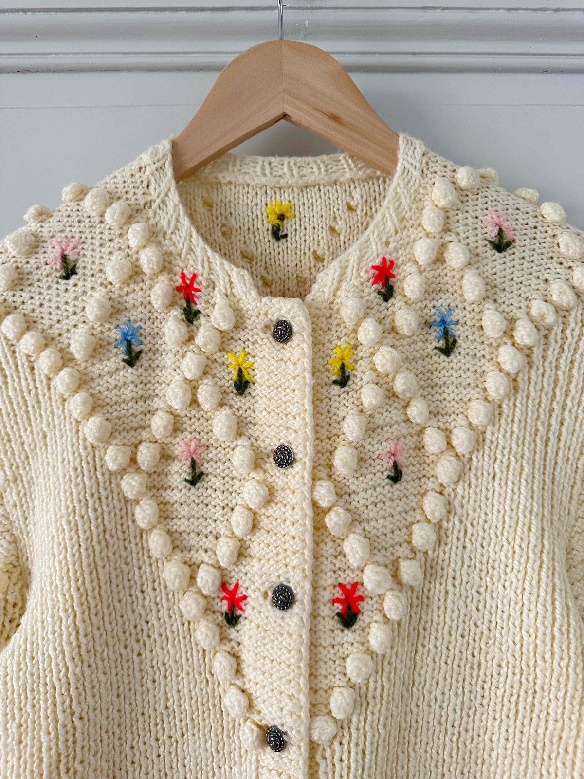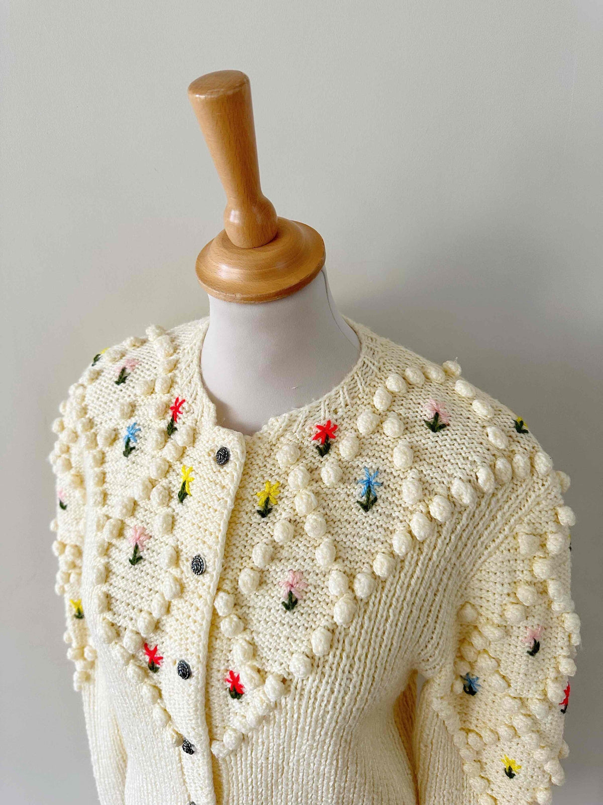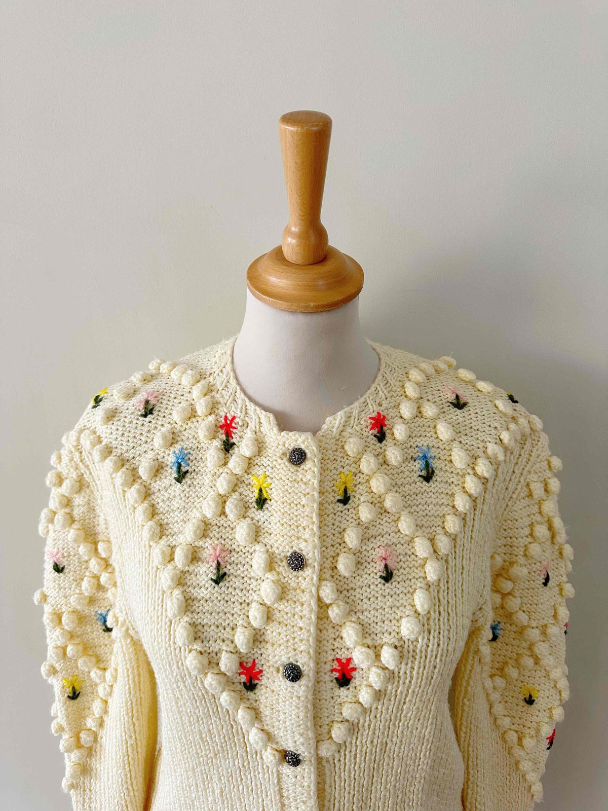 Unit price perAustrian cardigan in beige ecru wool, embroidered with multicolored pom-poms and flowers in pink, yellow, blue and red, floral silver-colored jeweled buttons, long embroidered balloon sleeves, knitted and embroidered by hand in Austria, size 36 shown here on a size 36 mannequin.