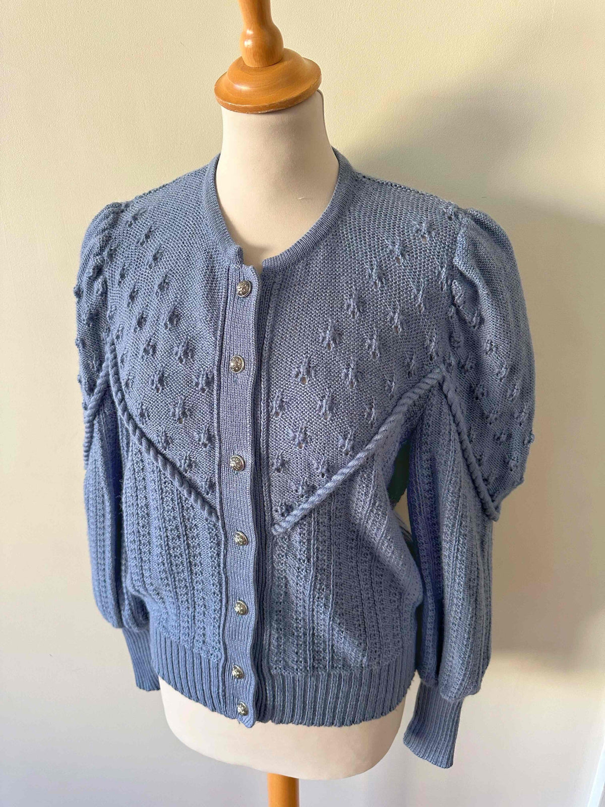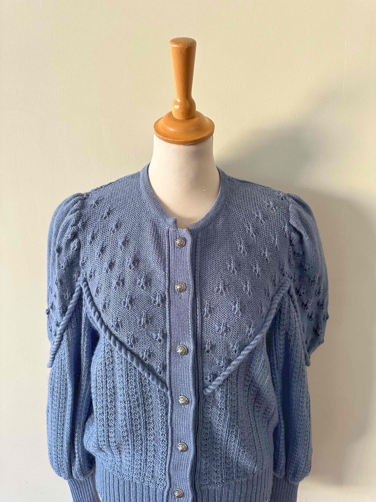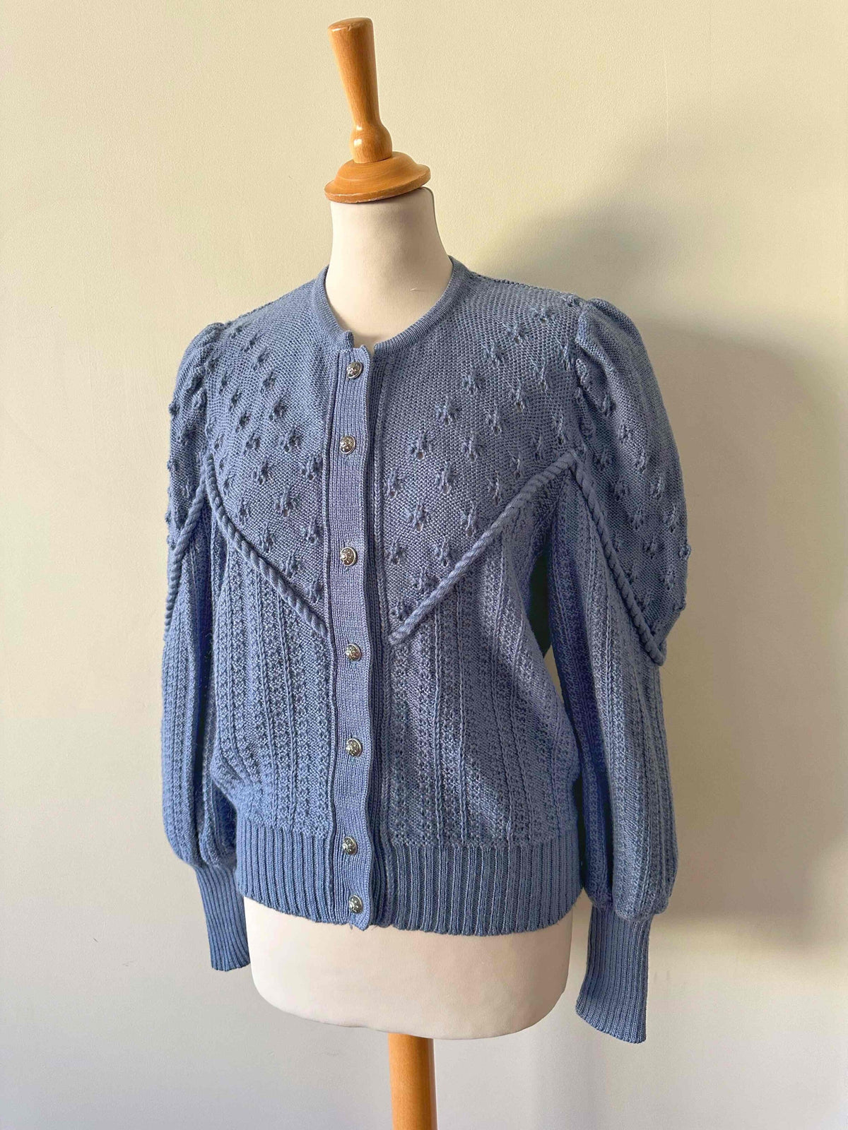 Unit price perAustrian cardigan in pure lavender sky blue wool, popcorn stitch with pom-poms, cable knit, balloon sleeves, silver jeweled buttons, made in Austria, fits sizes 36 and 38, shown here on a size 36 mannequin.