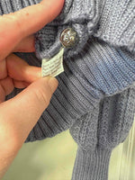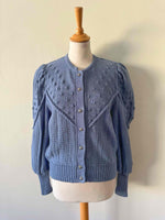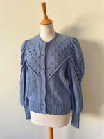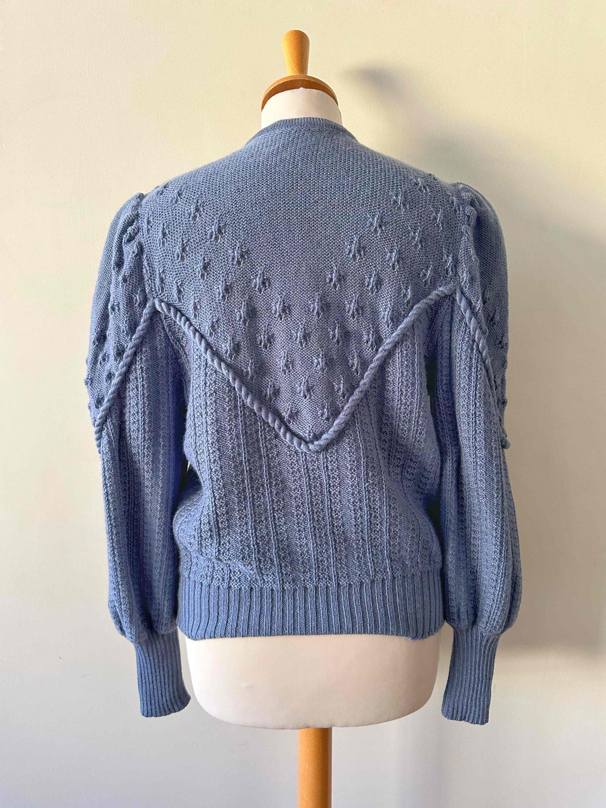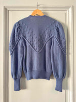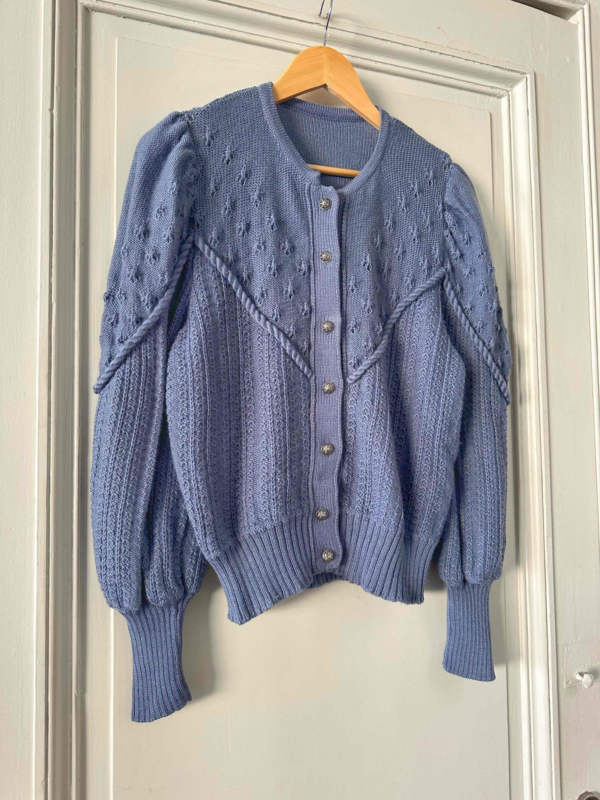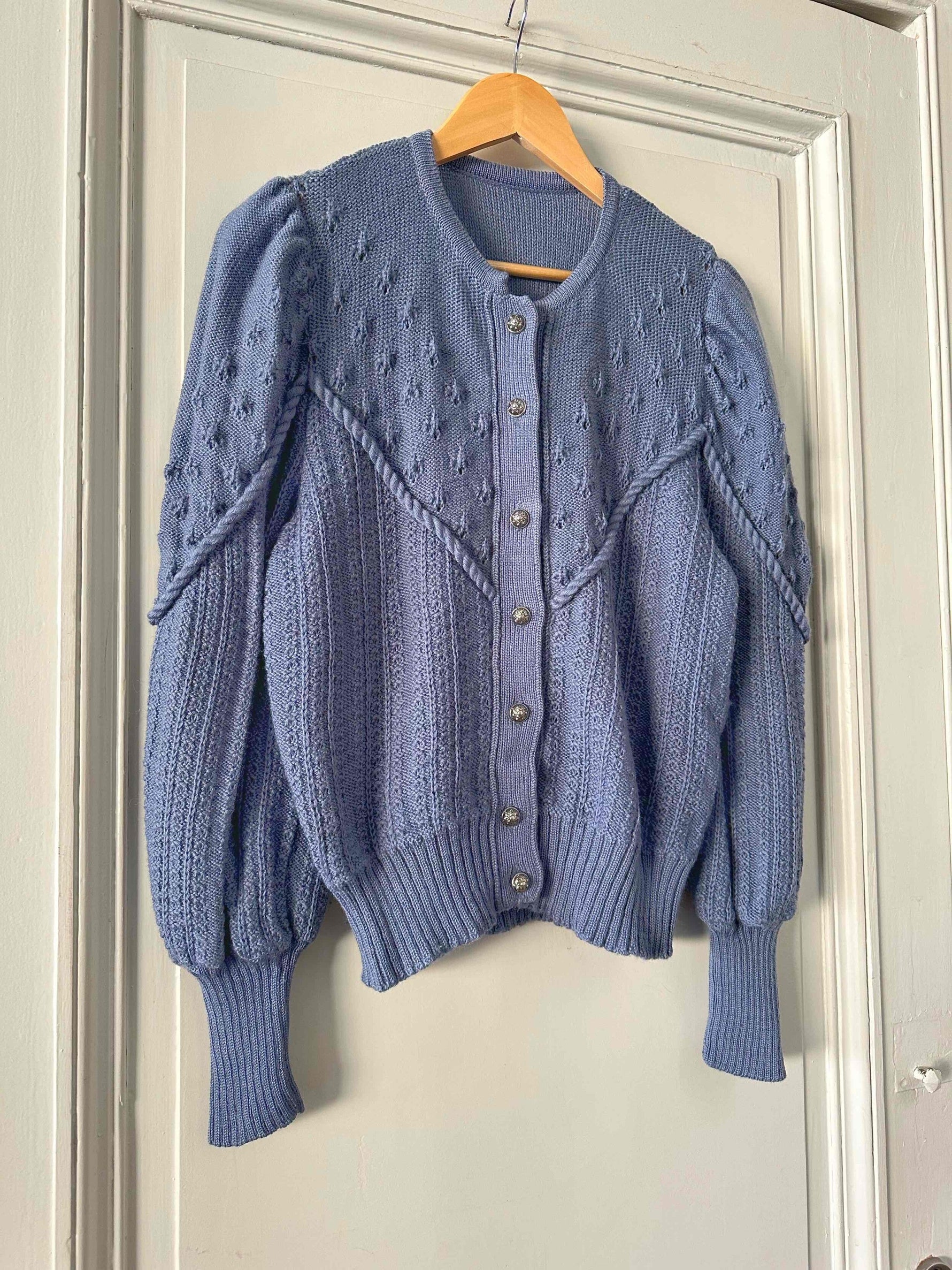 Unit price perAustrian cardigan in pure lavender sky blue wool, popcorn stitch with pom-poms, cable knit, balloon sleeves, silver jeweled buttons, made in Austria, fits sizes 36 and 38, shown here on a size 36 mannequin.