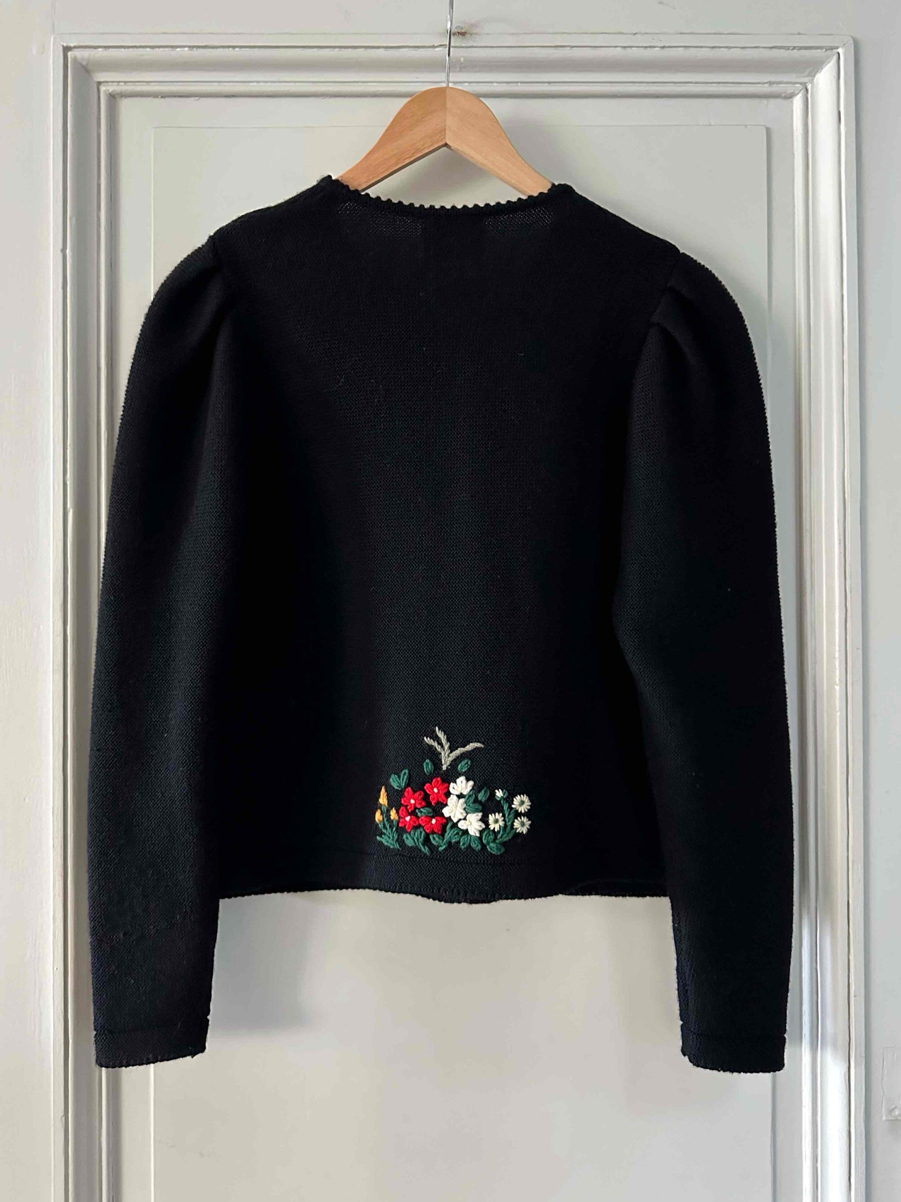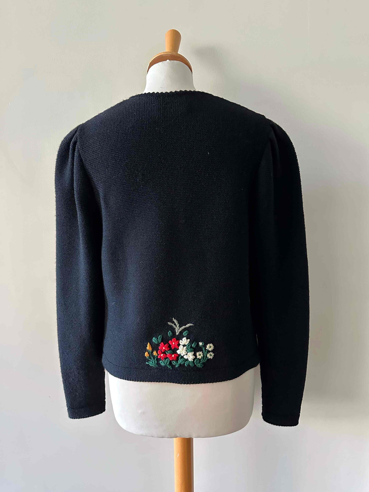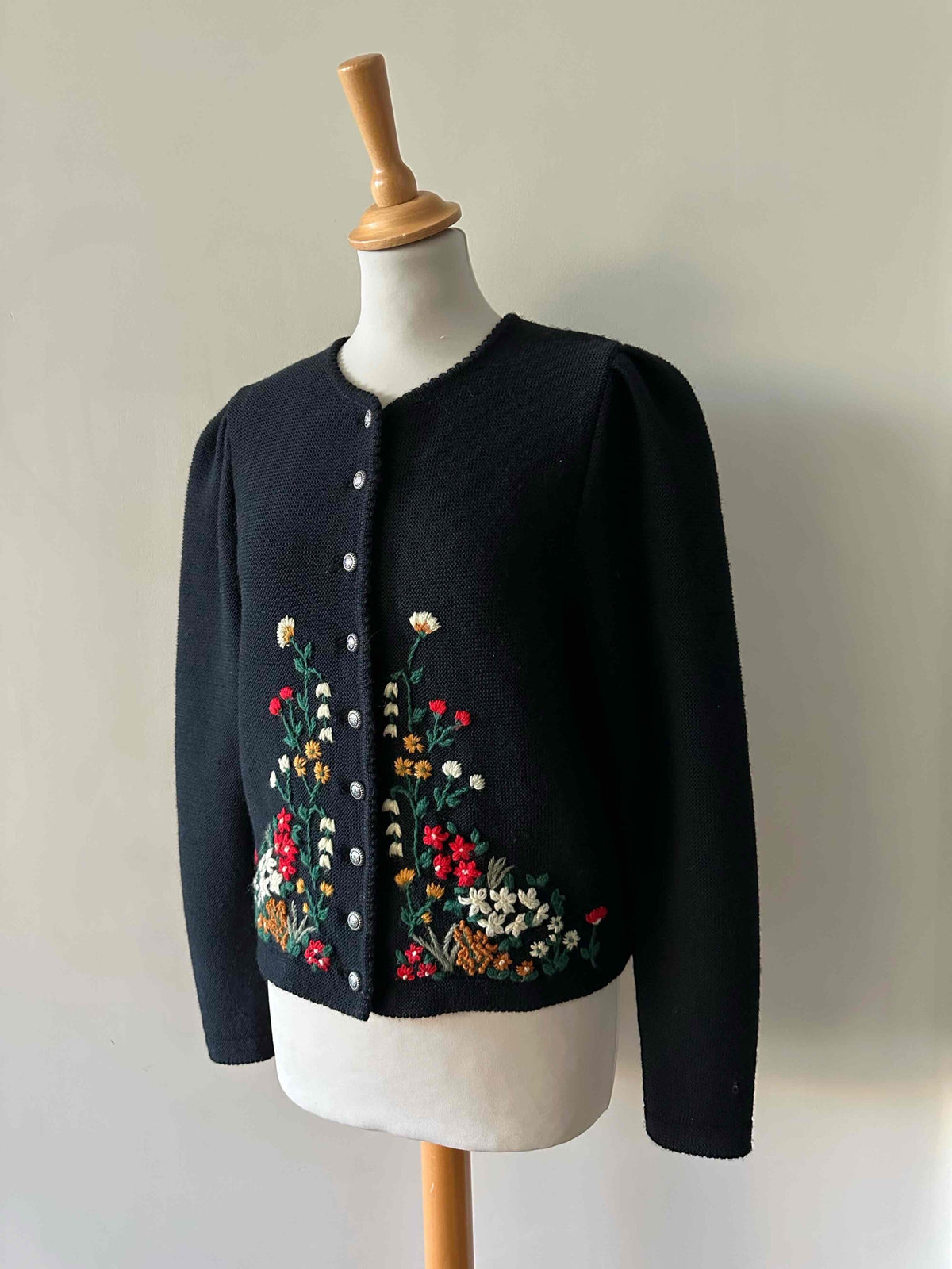 Unit price perAustrian cardigan in pure black wool, embroidered with multicolored meadow flowers, balloon sleeves, box shape, floral silver-colored jeweled buttons, hand-knitted and embroidered in Austria, size 36 shown here on a size 36 mannequin.