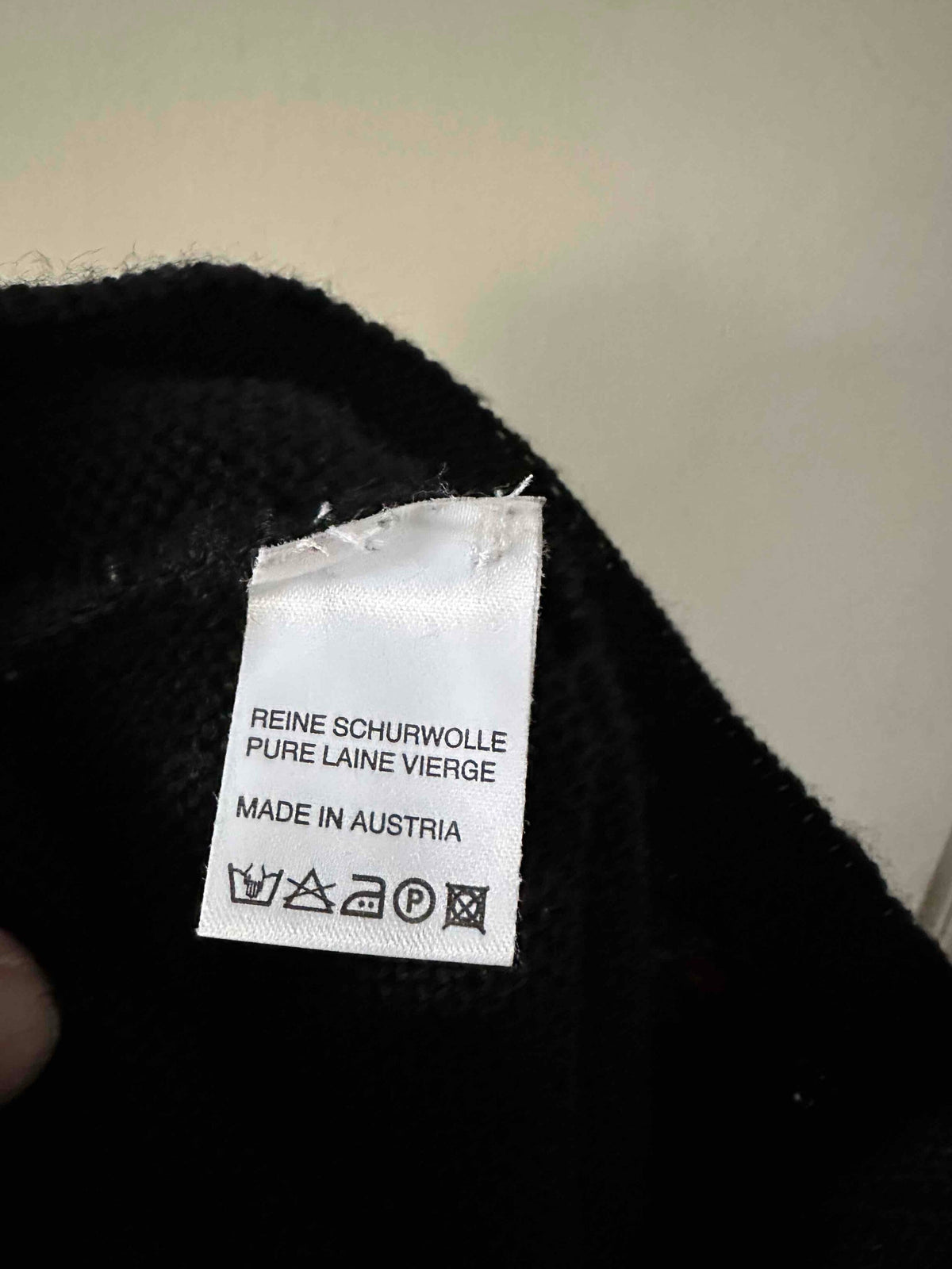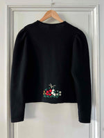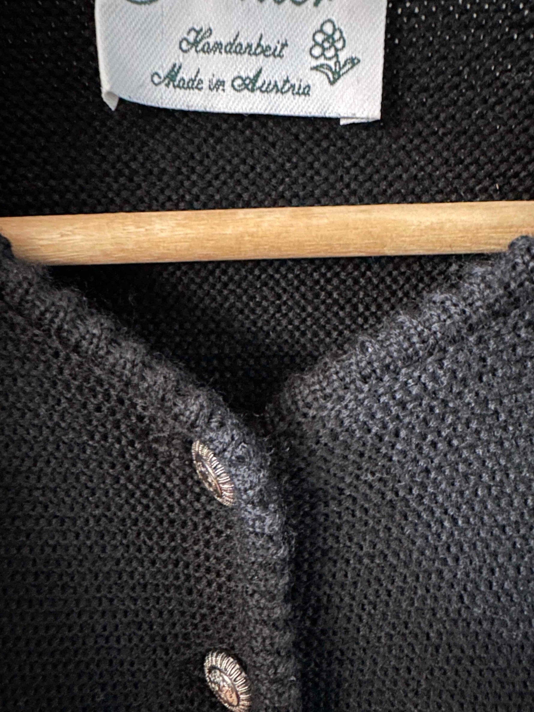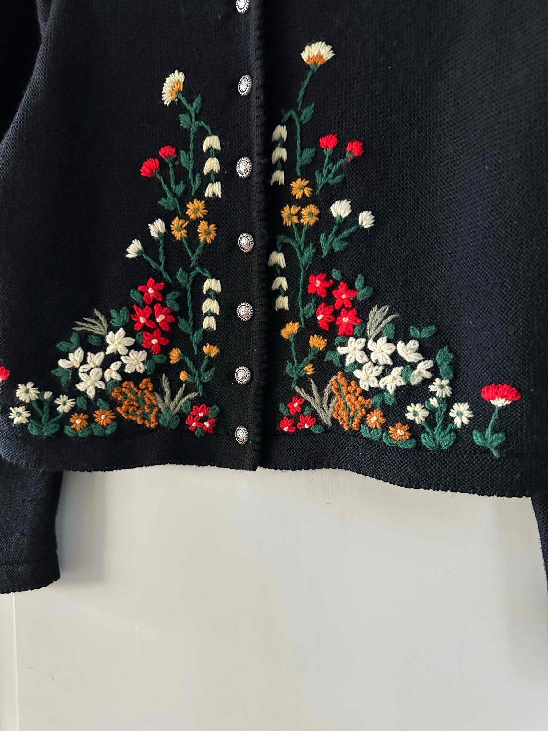 Unit price perAustrian cardigan in pure black wool, embroidered with multicolored meadow flowers, balloon sleeves, box shape, floral silver-colored jeweled buttons, hand-knitted and embroidered in Austria, size 36 shown here on a size 36 mannequin.