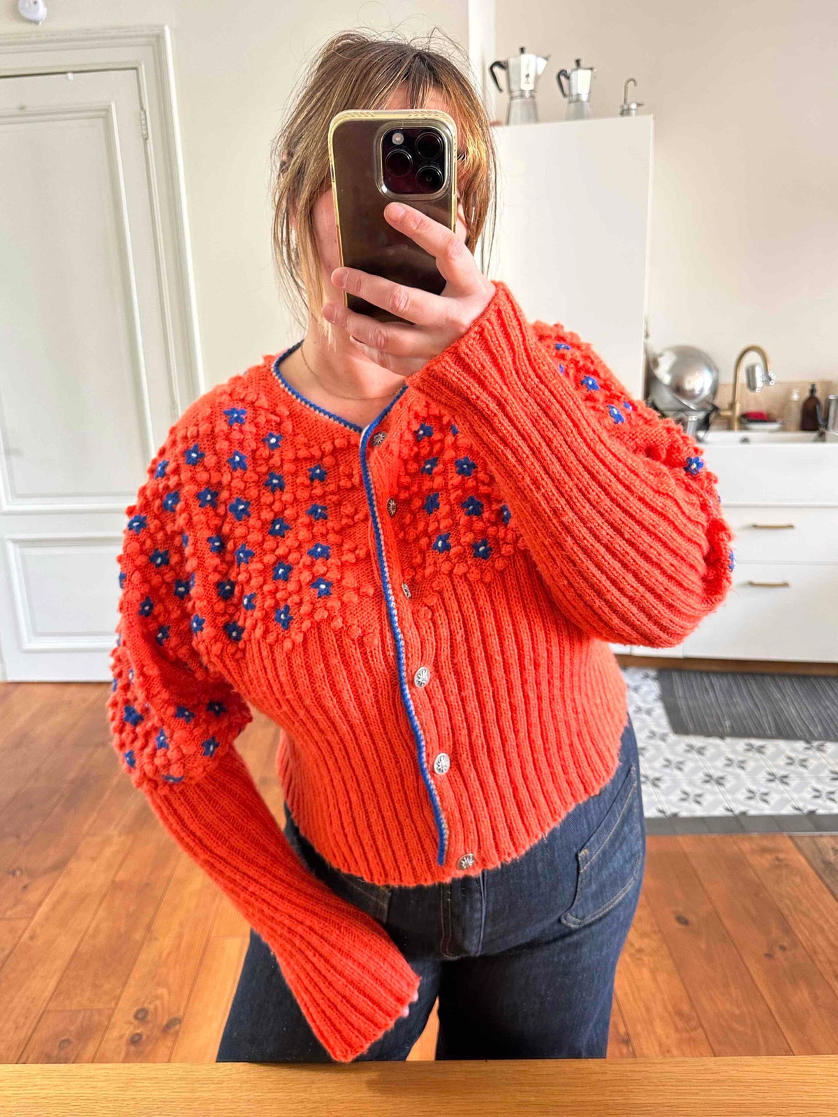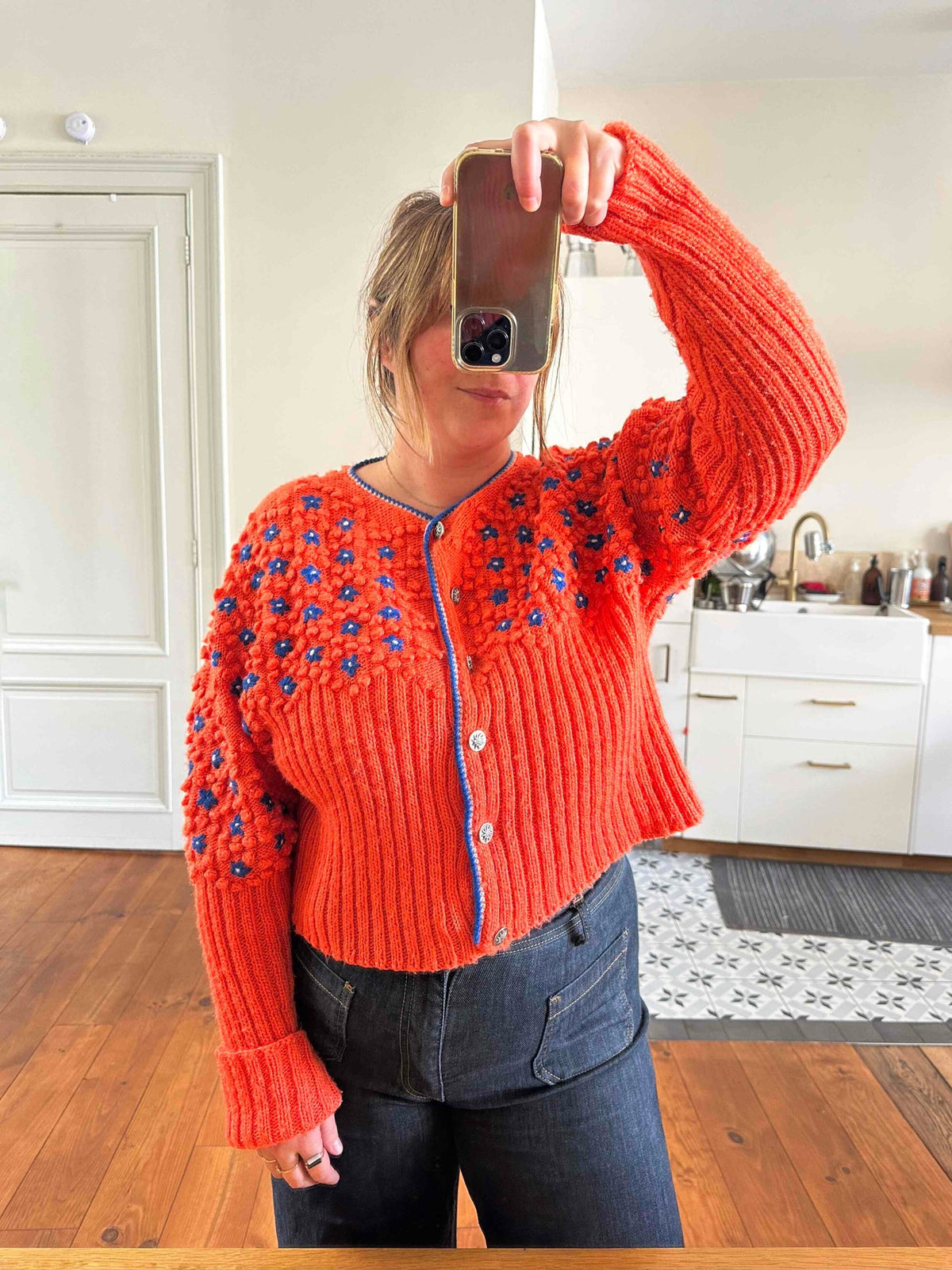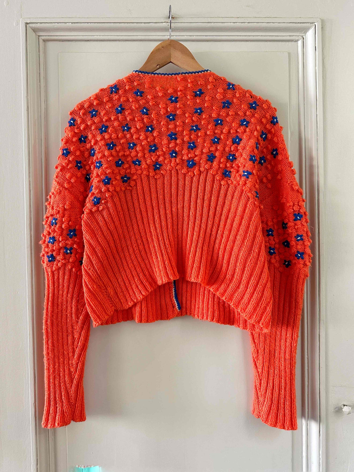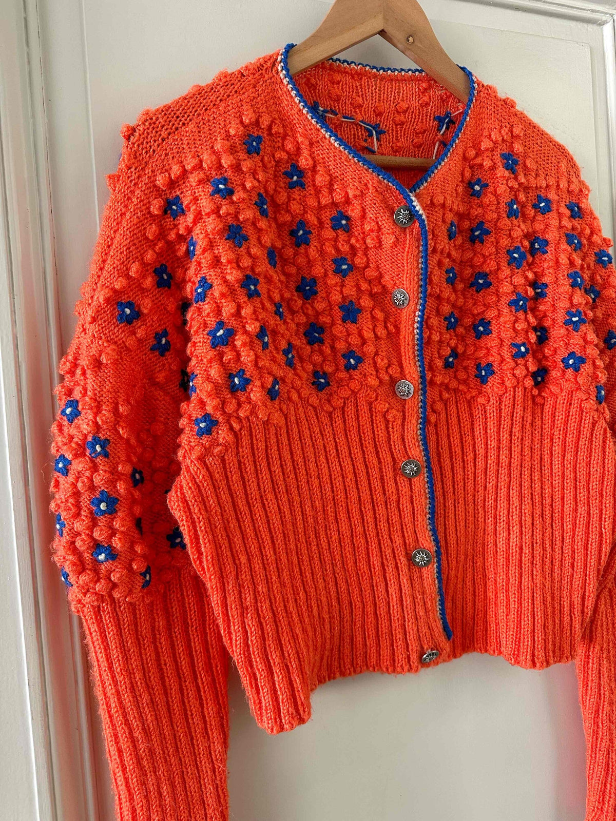 Unit price perAustrian cardigan, in tangerine orange wool blend, popcorn knit embroidered with electric blue and white flowers, floral silver jewel buttons, balloon sleeves and long turn-back cuffs, hand-knitted, 1970s, fits sizes 38, 40 and 42, worn here on a size 40.