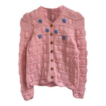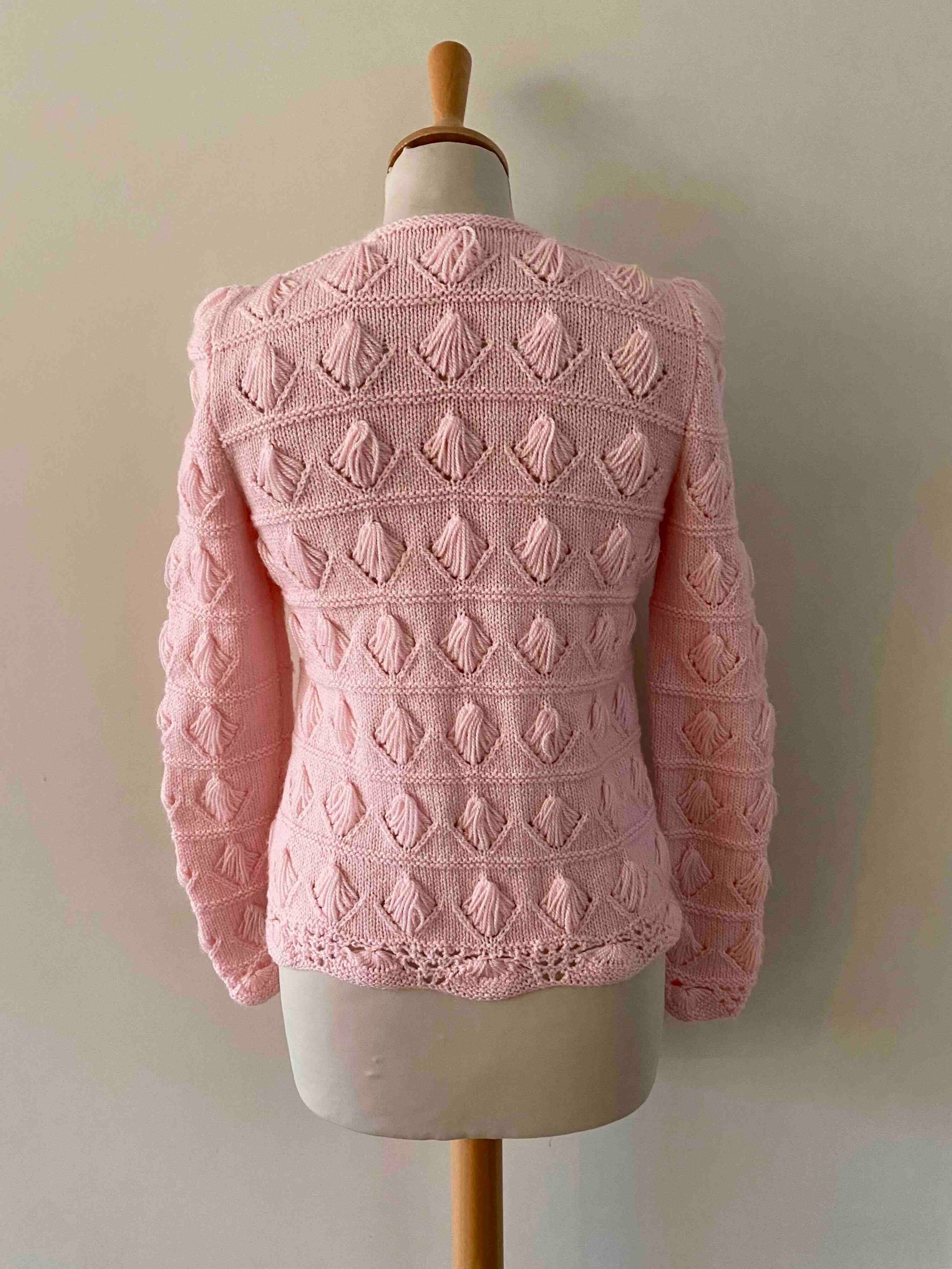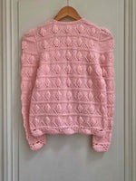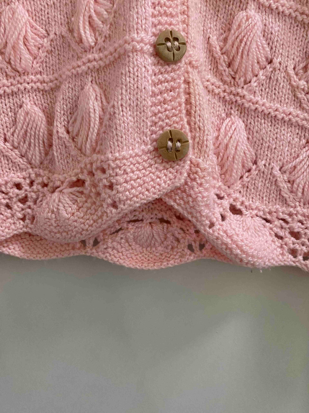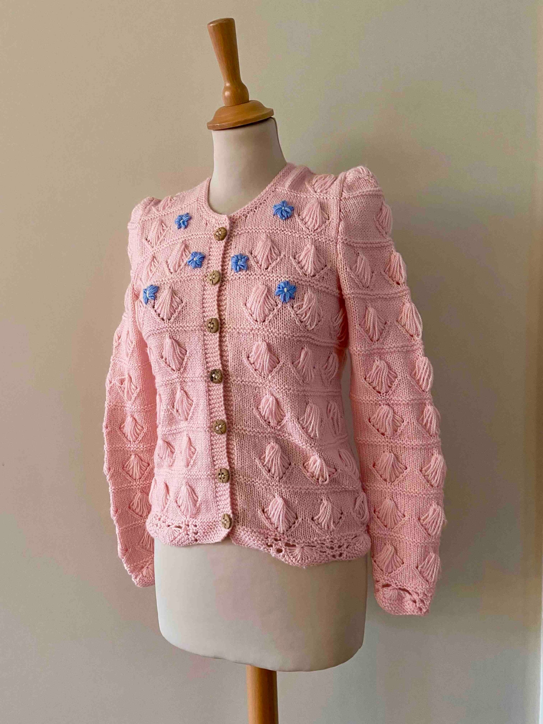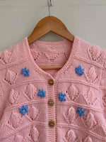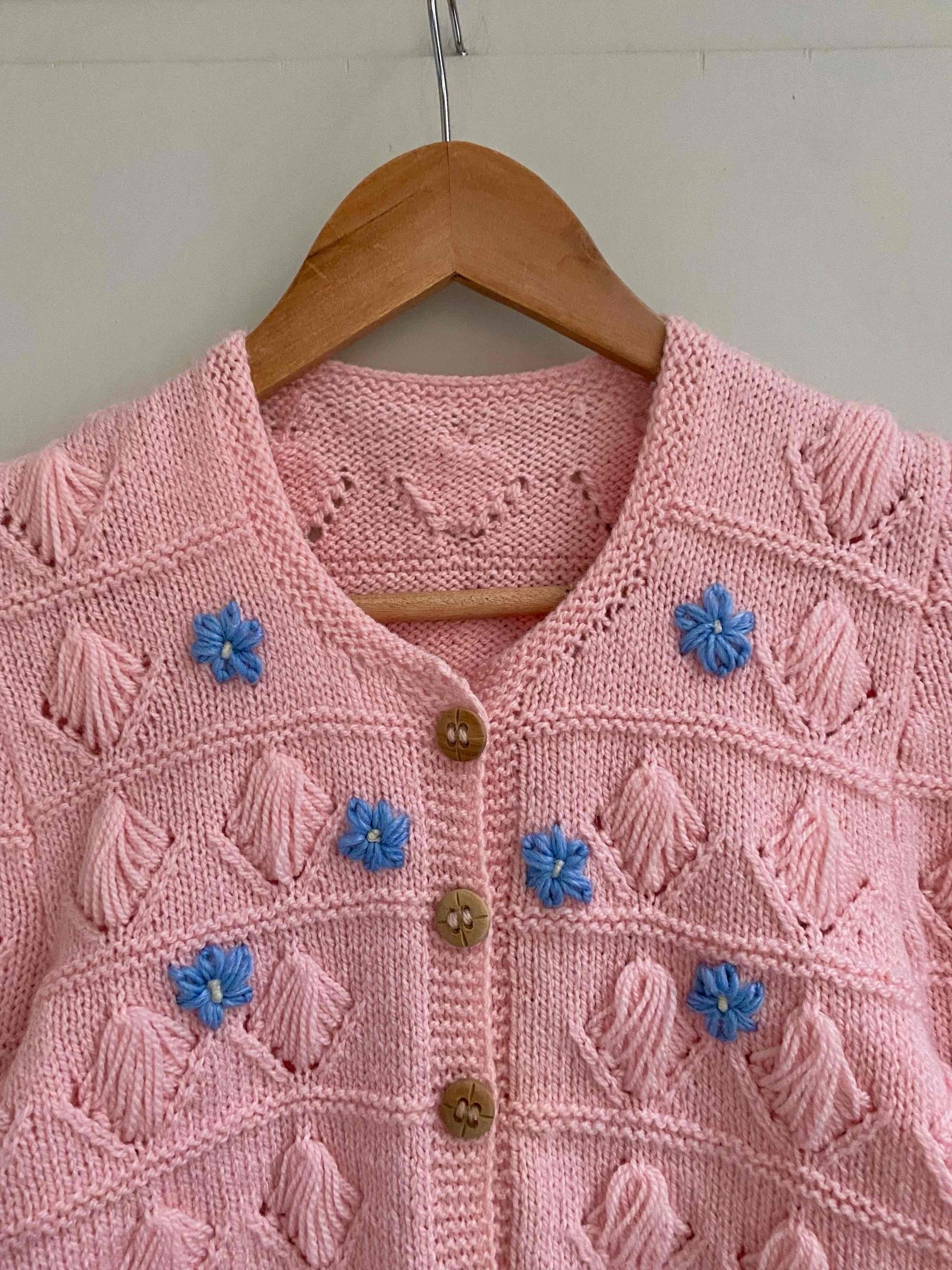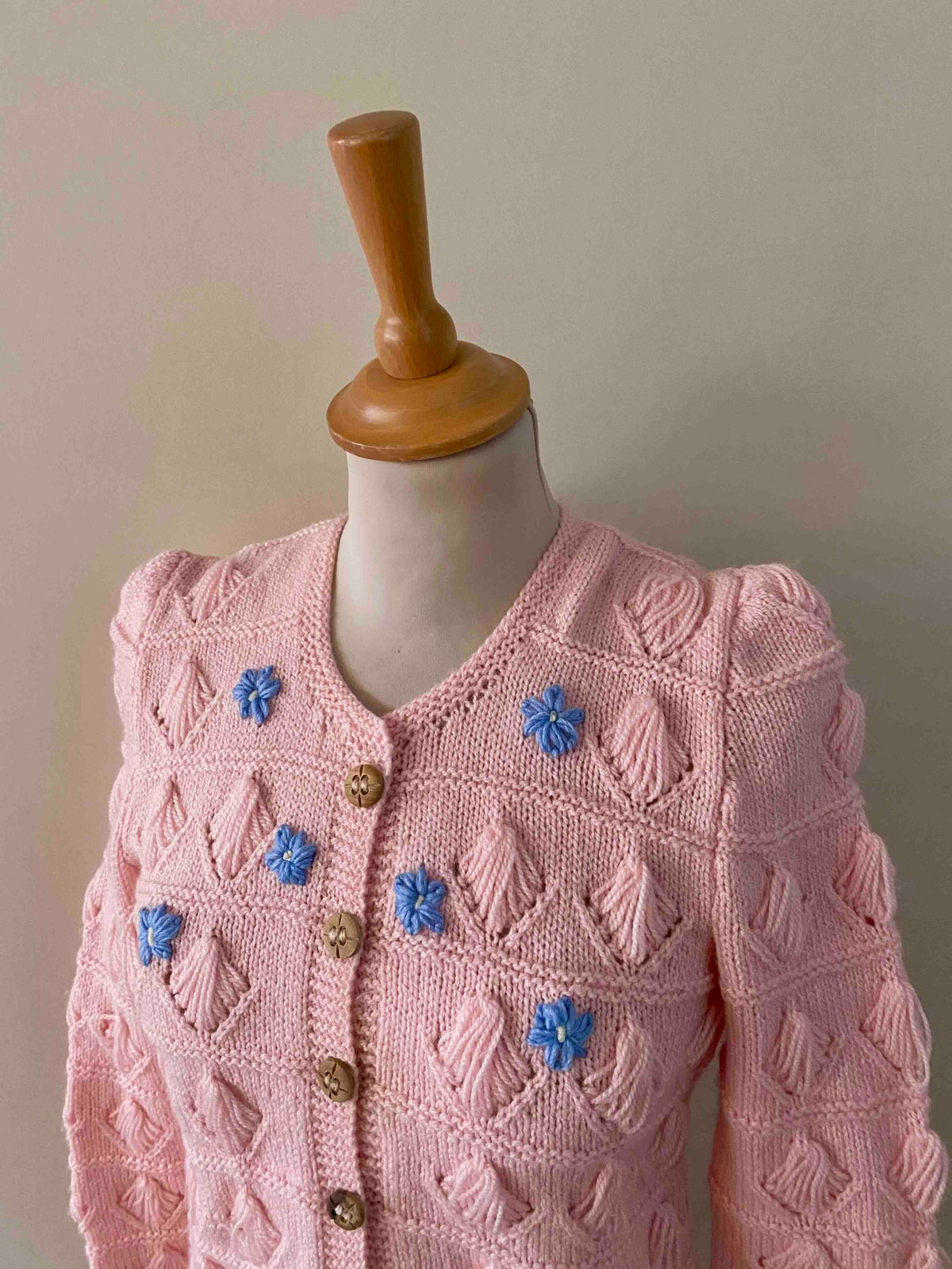 Unit price perCrocheted cardigan in pink wool, fancy lace stitch, embroidered with sky-blue flowers and white hearts, puff sleeves, wooden buttons, size 36 shown here on a size 36 mannequin, hand-knitted.
