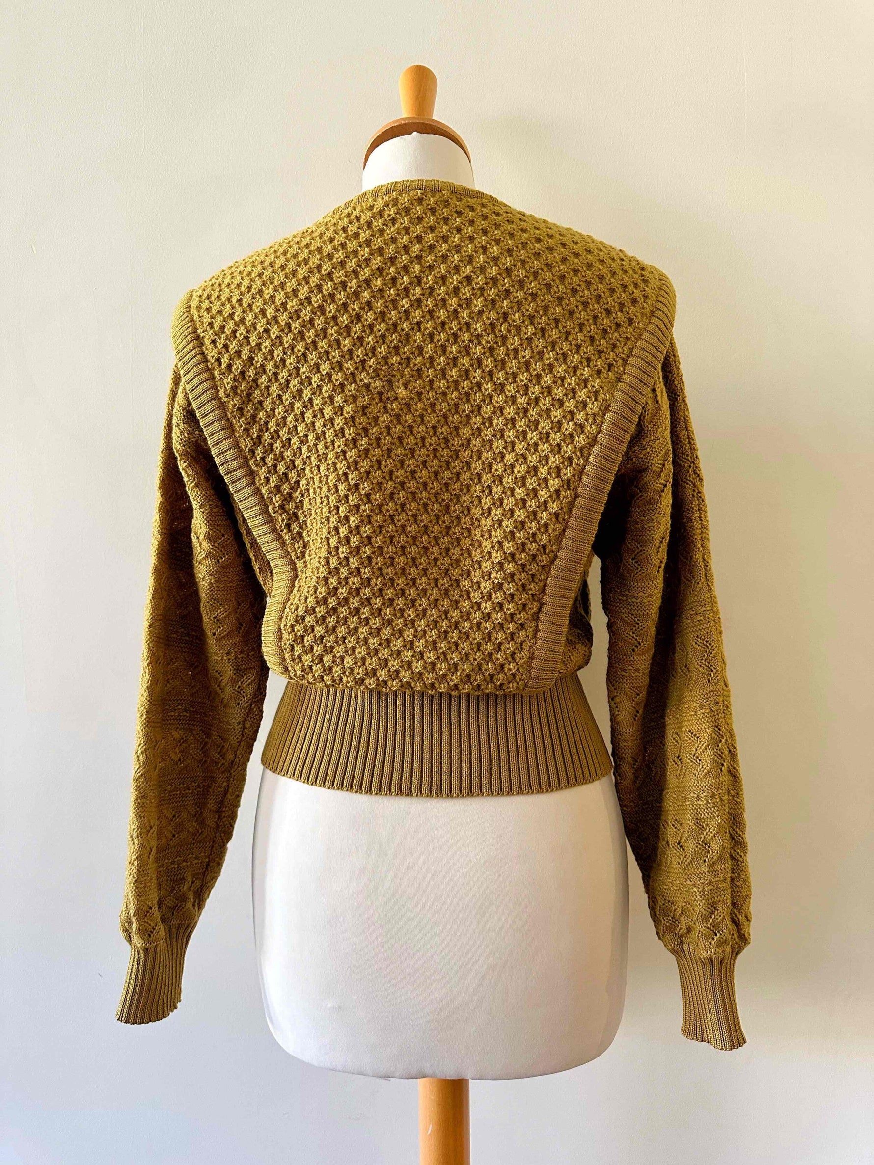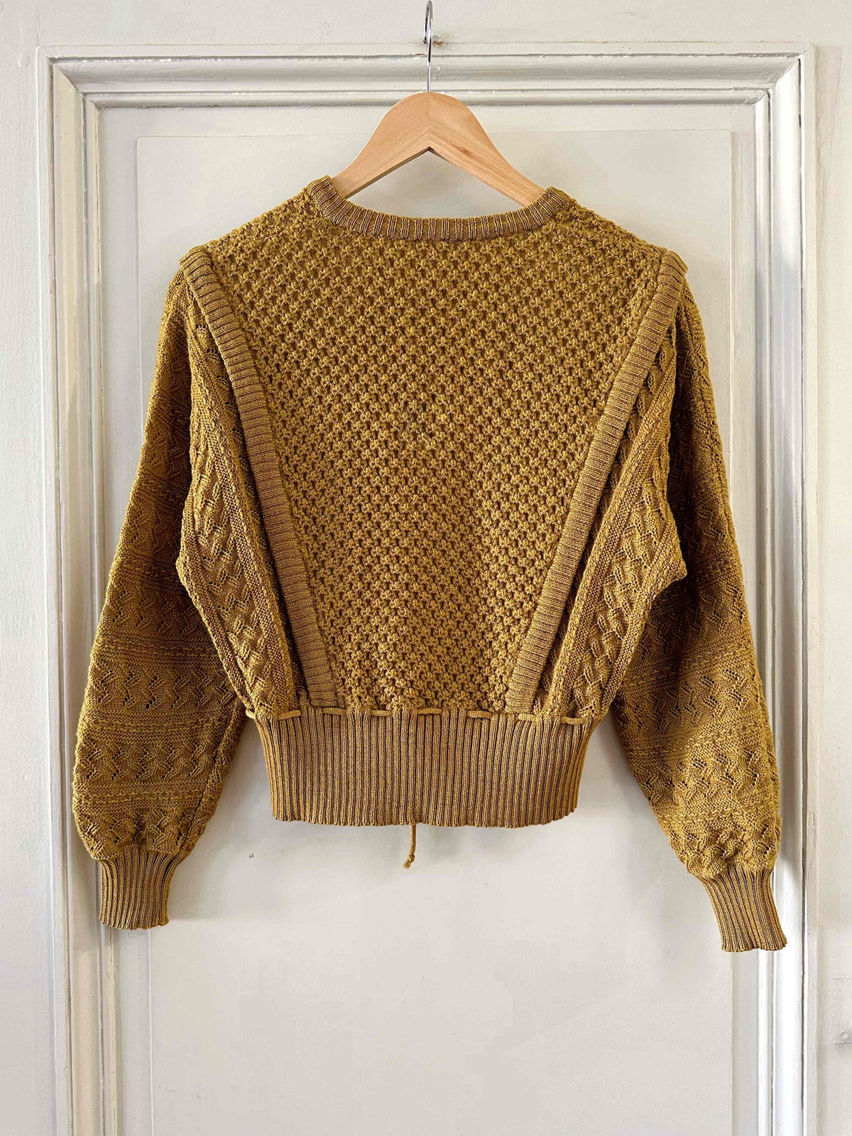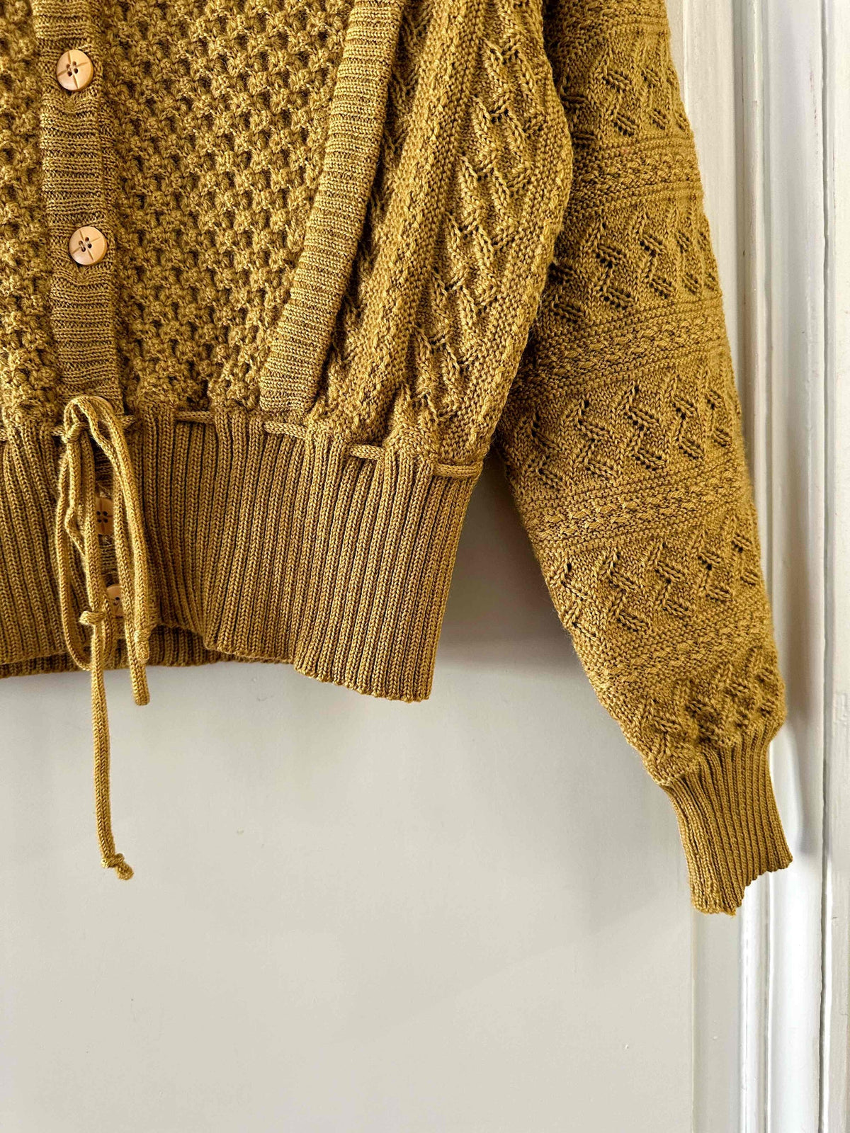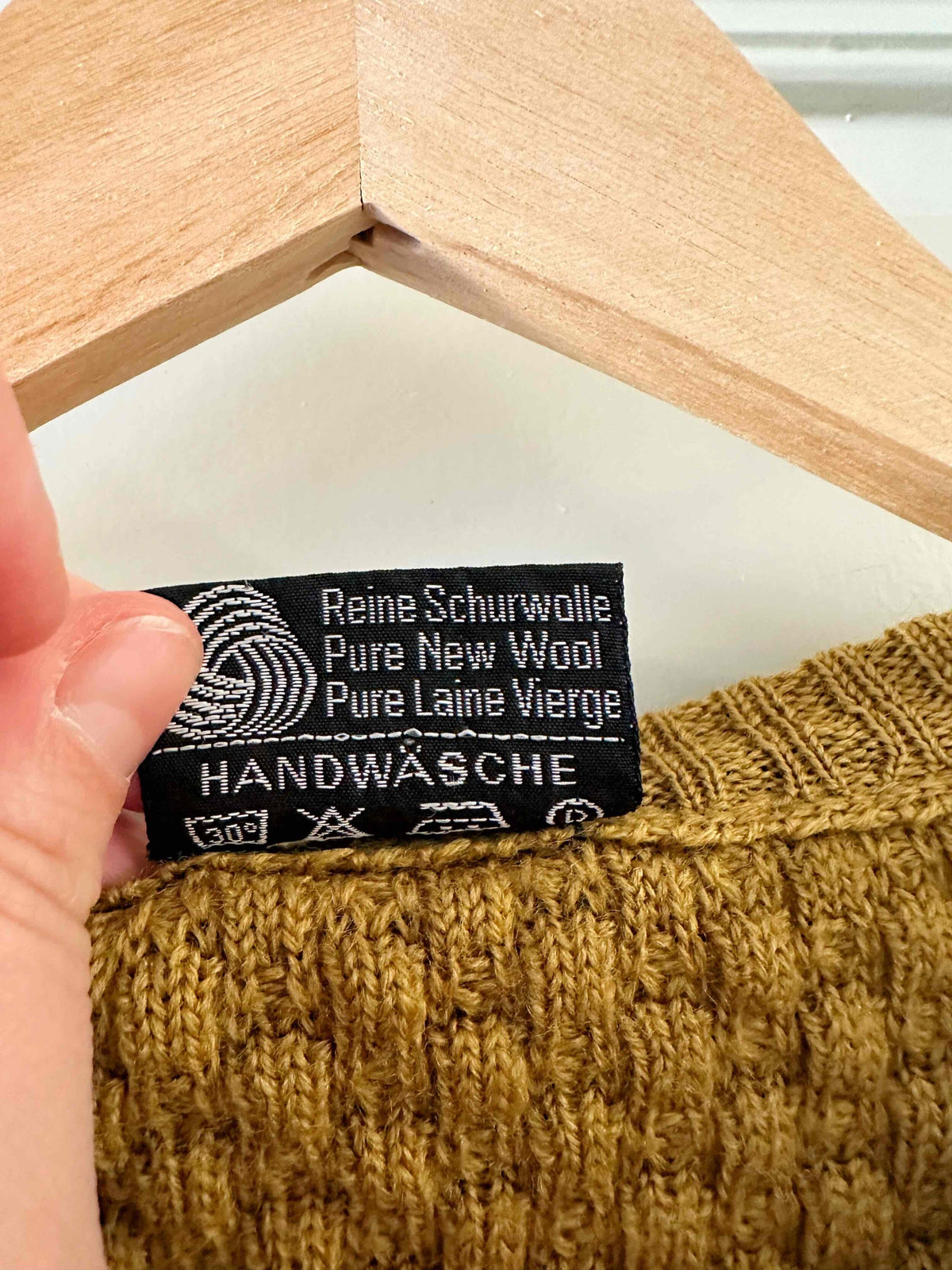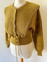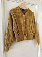 Unit price perAustrian cardigan in pure cumin-colored wool, with batwing sleeves, tie waist, made in Austria, suitable for sizes 34 and 36, shown here on a size 36 mannequin.