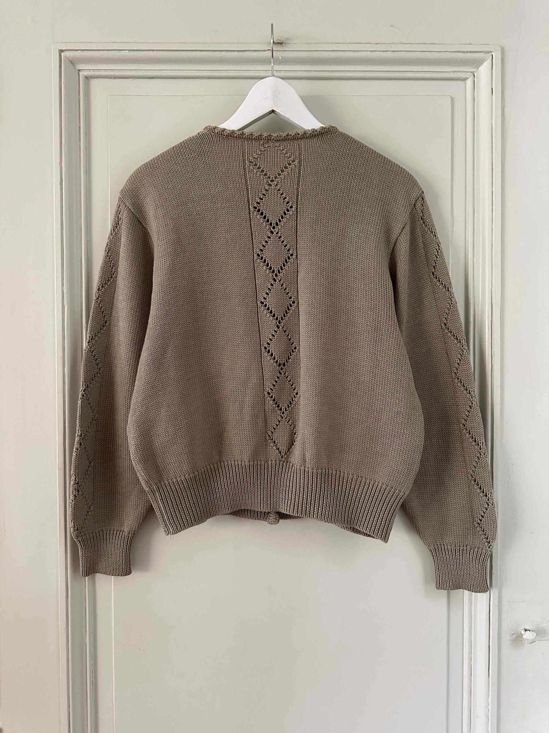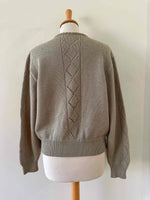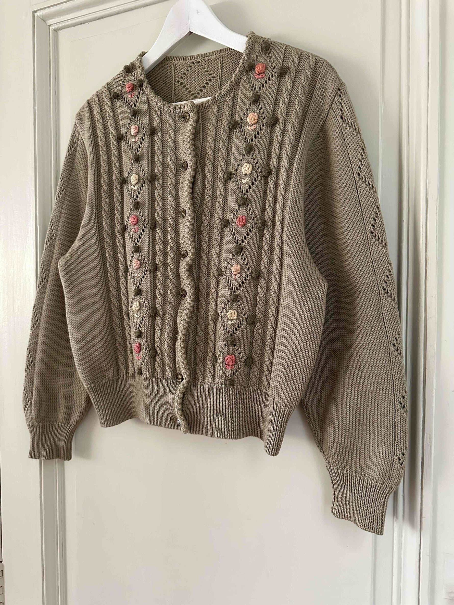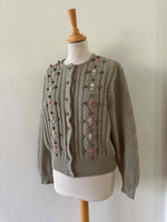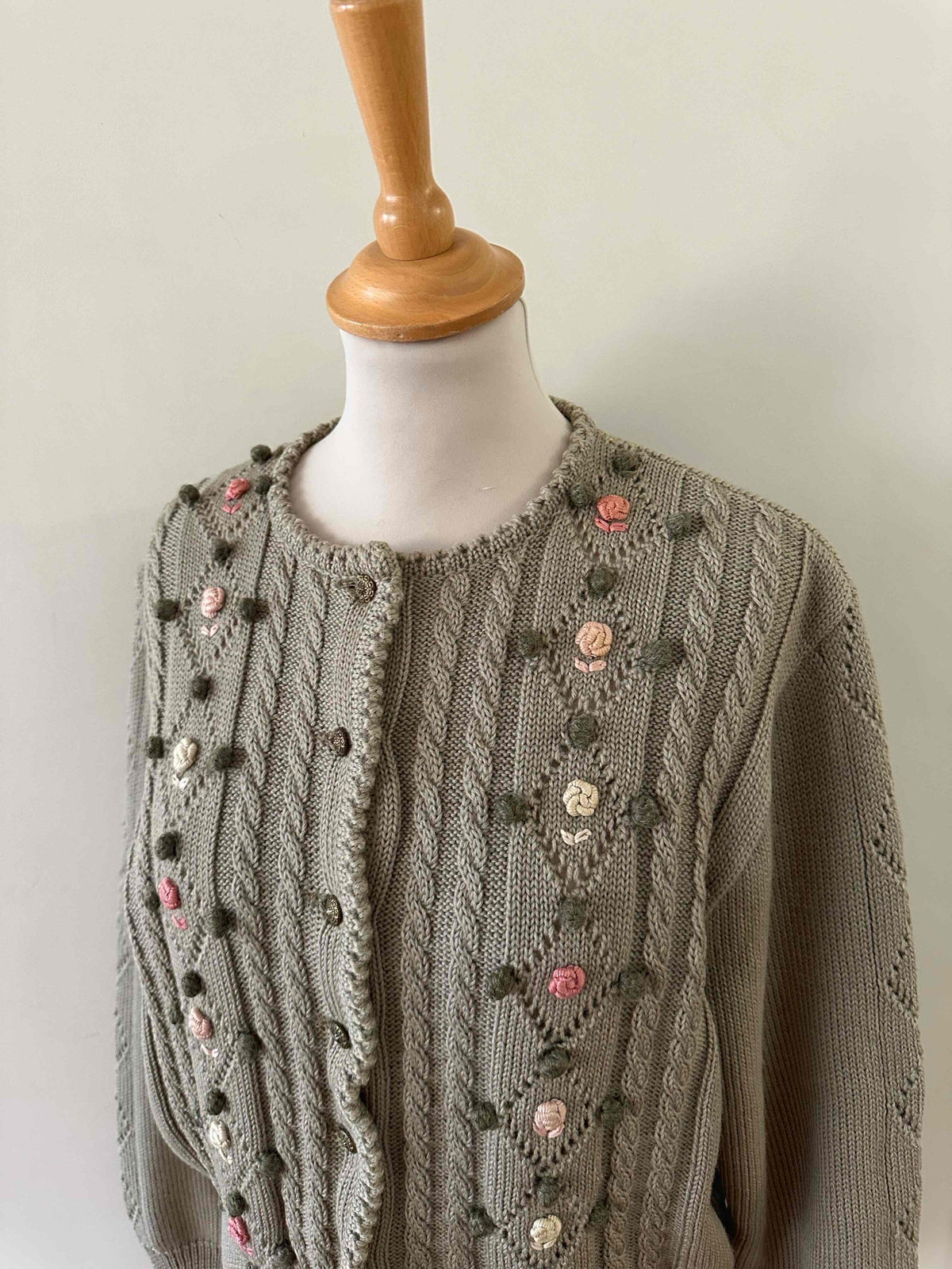 Unit price perAustrian cardigan in pure sage green and lime green wool, embroidered with pink and white flowers, khaki green pom-poms, openwork balloon sleeves, gold-colored floral jeweled buttons, made in Austria, fits sizes 36 and 38, shown here on a size 36 mannequin.