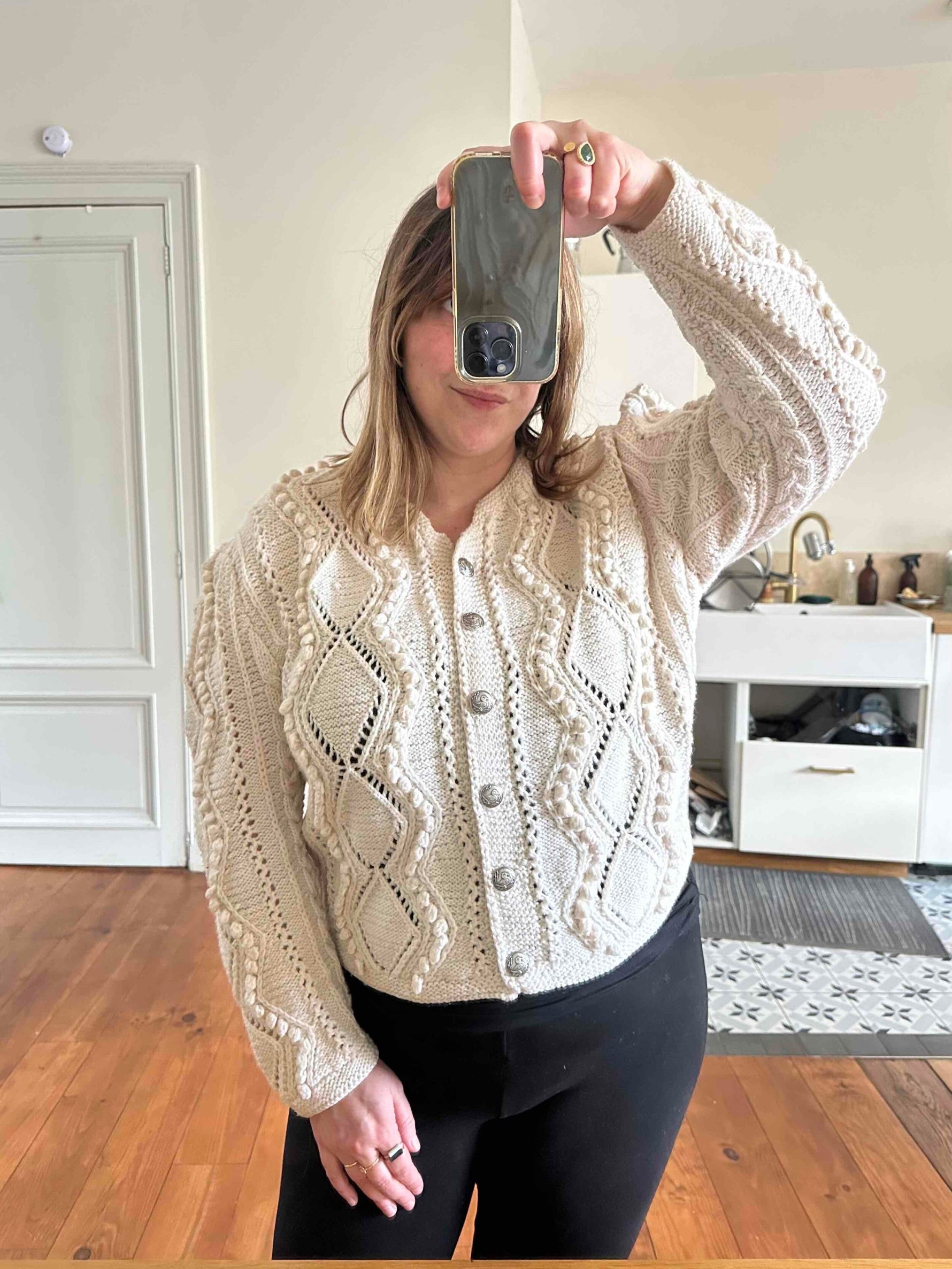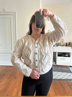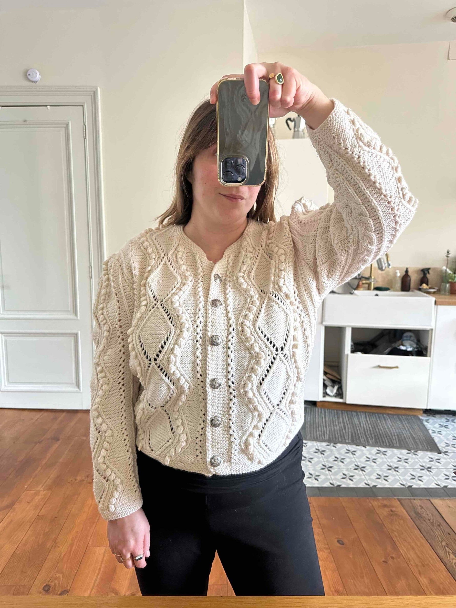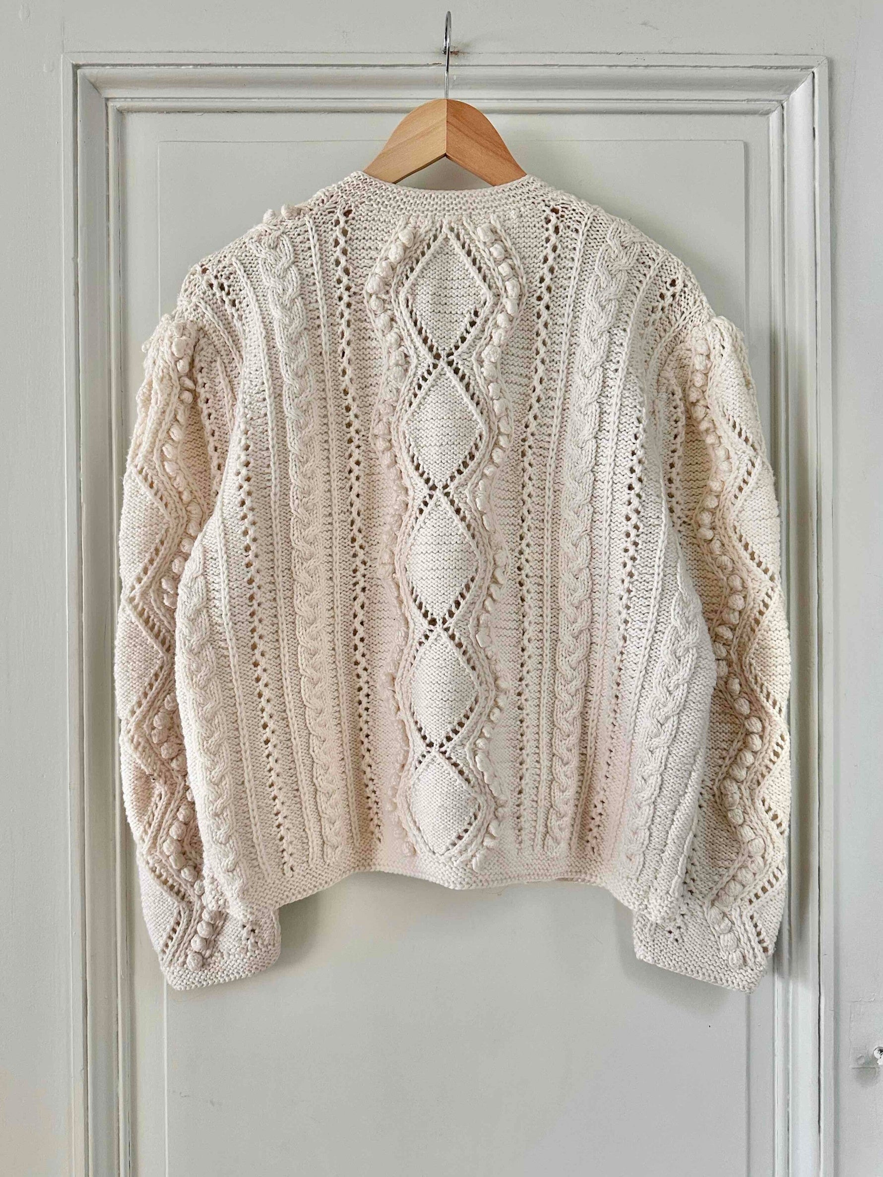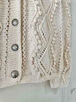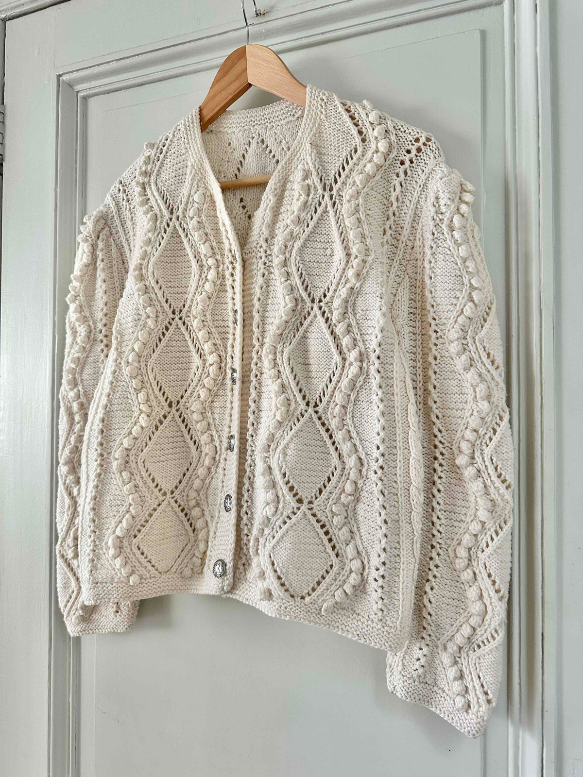 Unit price perAustrian cardigan, in pure cream white wool, with openwork knit and embroidered pom-poms, silver-colored jeweled buttons, hand-knitted in Austria, suitable for sizes 38 and 40, shown here on a size 36 mannequin and on a size 40 person.