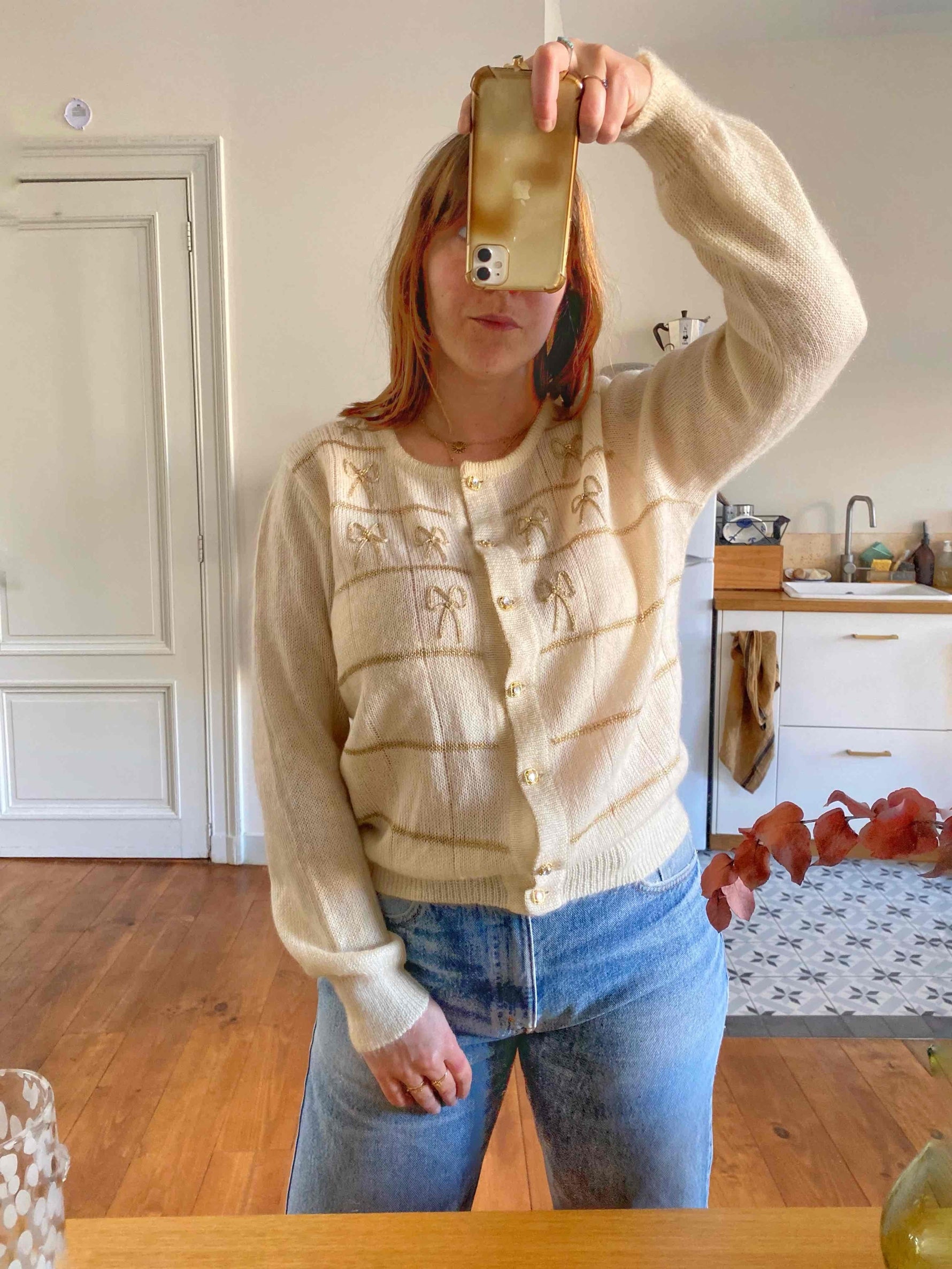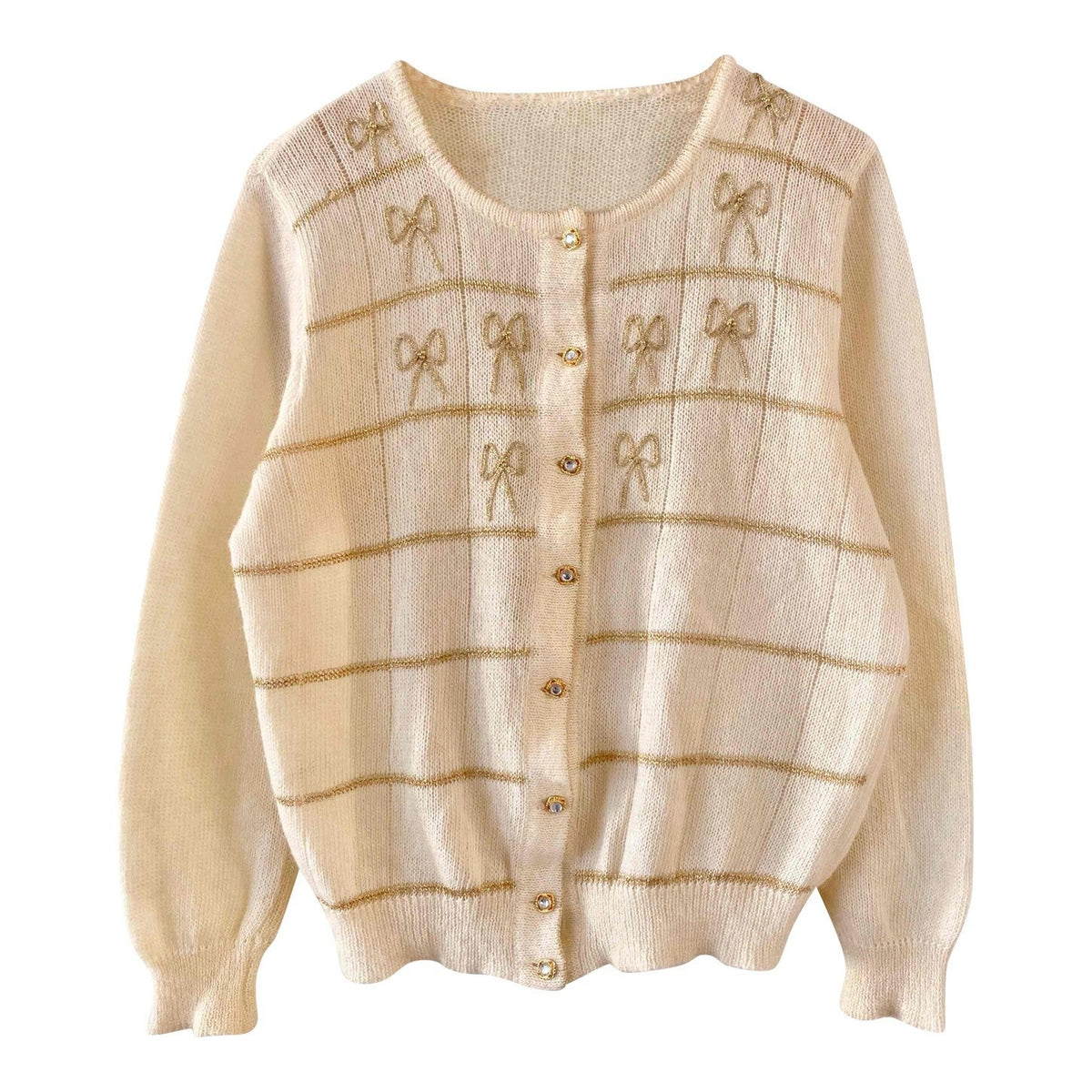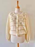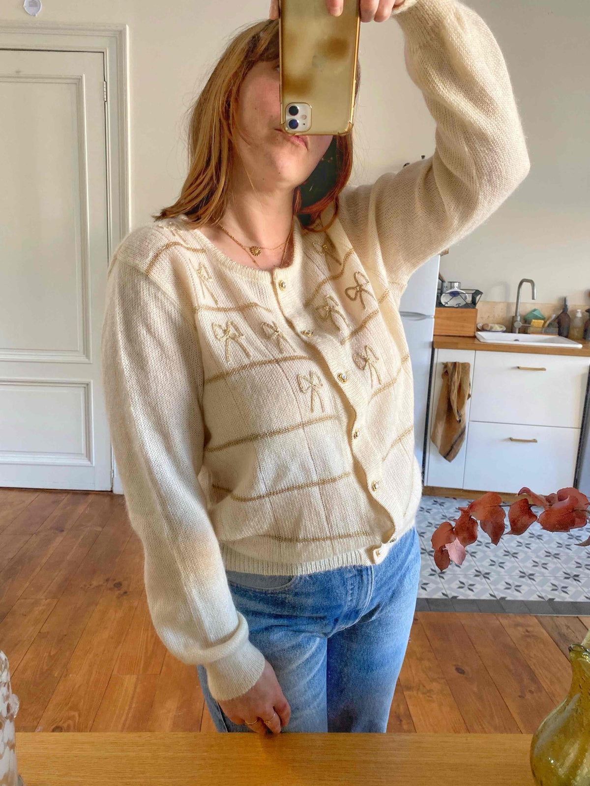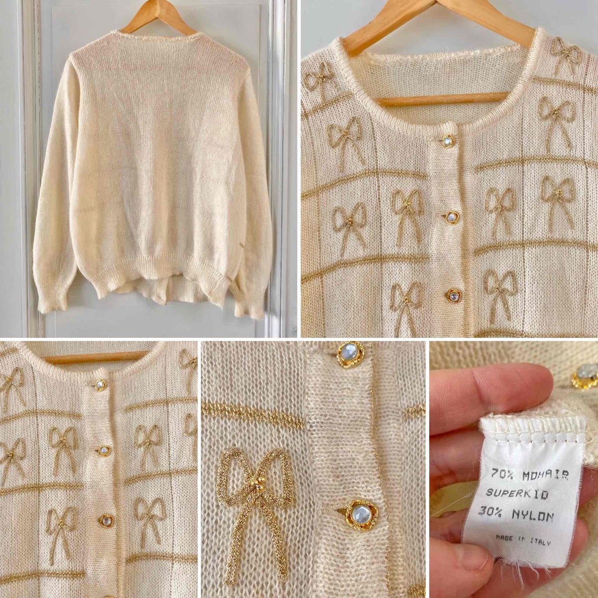 Unit price perCream mohair and gold lurex cardigan with embroidered gold and pearl knots, gold and rhinestone jewel buttons, balloon sleeves, made in Italy, 80s, size 38, shown here on a size 36 mannequin and a size 40 person.