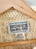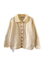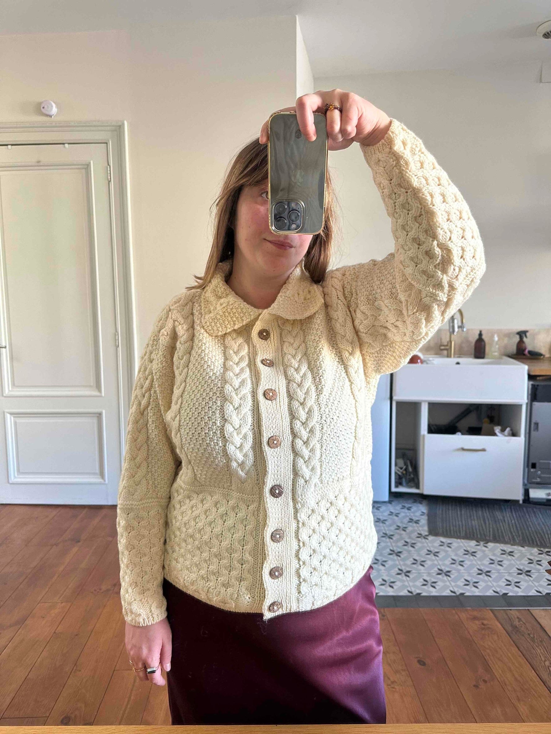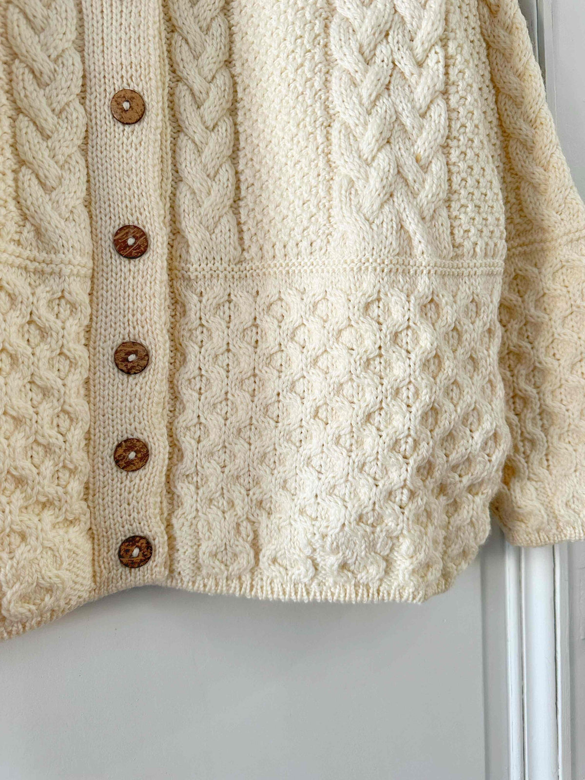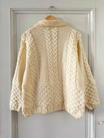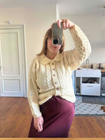 Unit price perIrish cardigan, made of pure cream sheep's wool, with a polo neck, wooden buttons, twisted and honeycomb knit, hand-knitted in Ireland, suitable for sizes 38 and 40, shown here on a size 40 model.