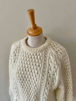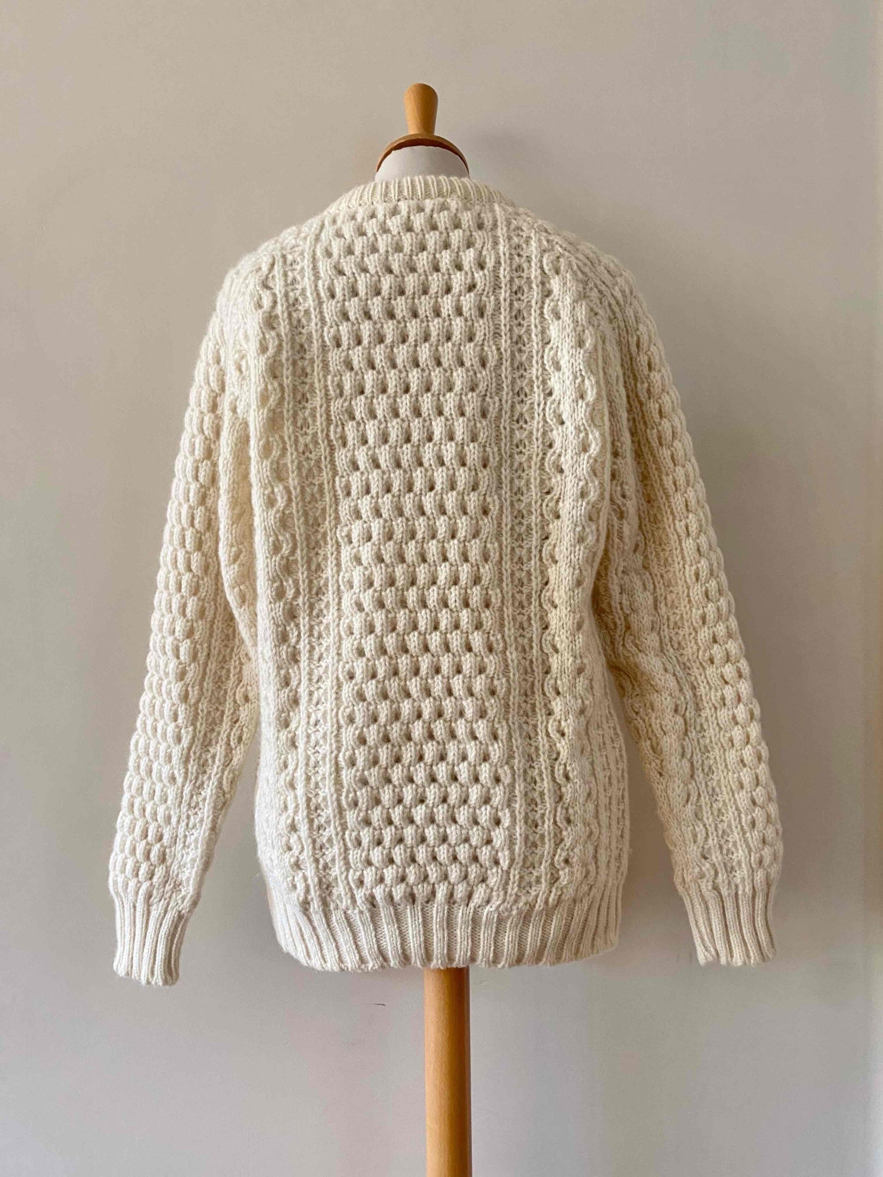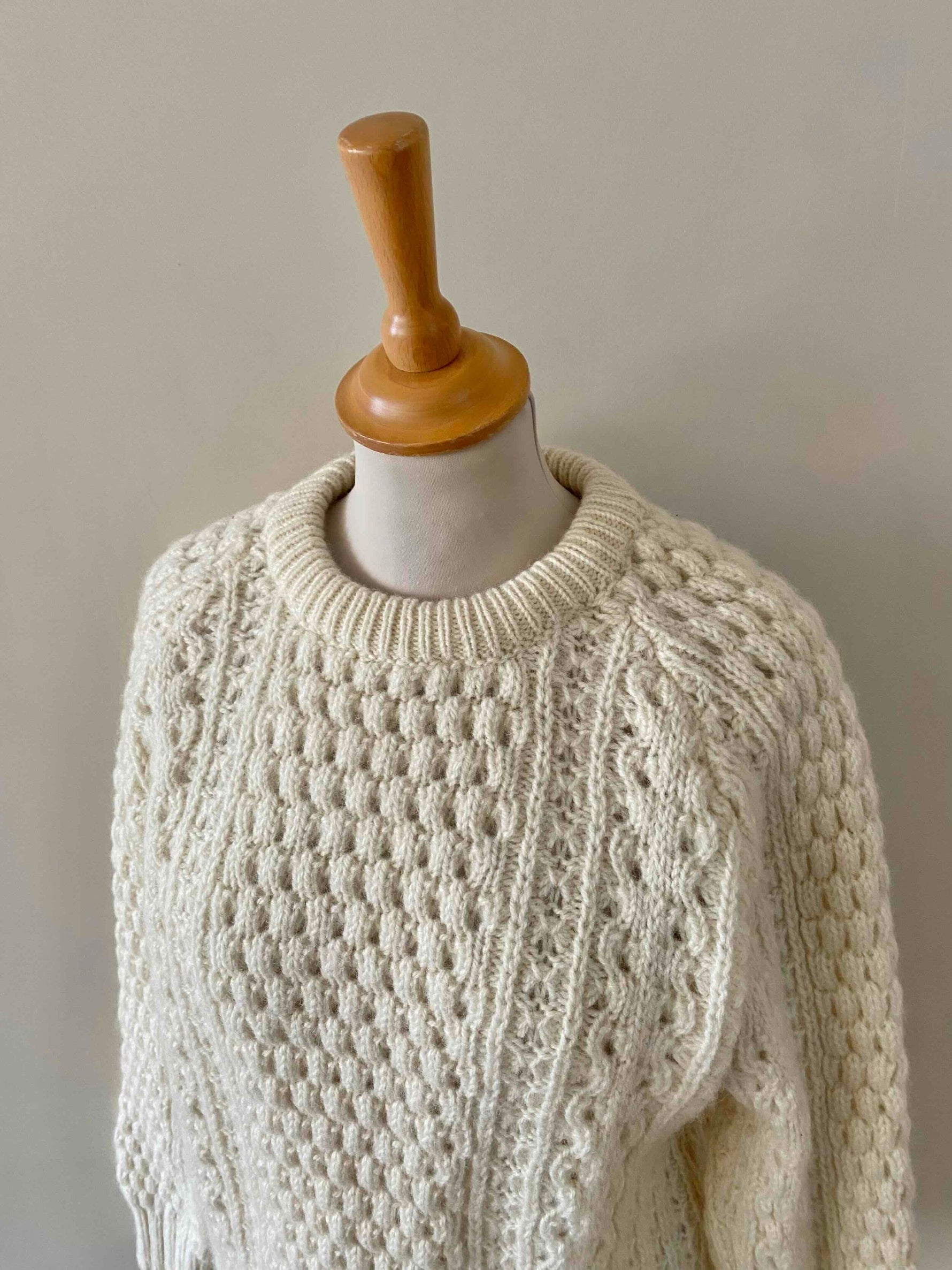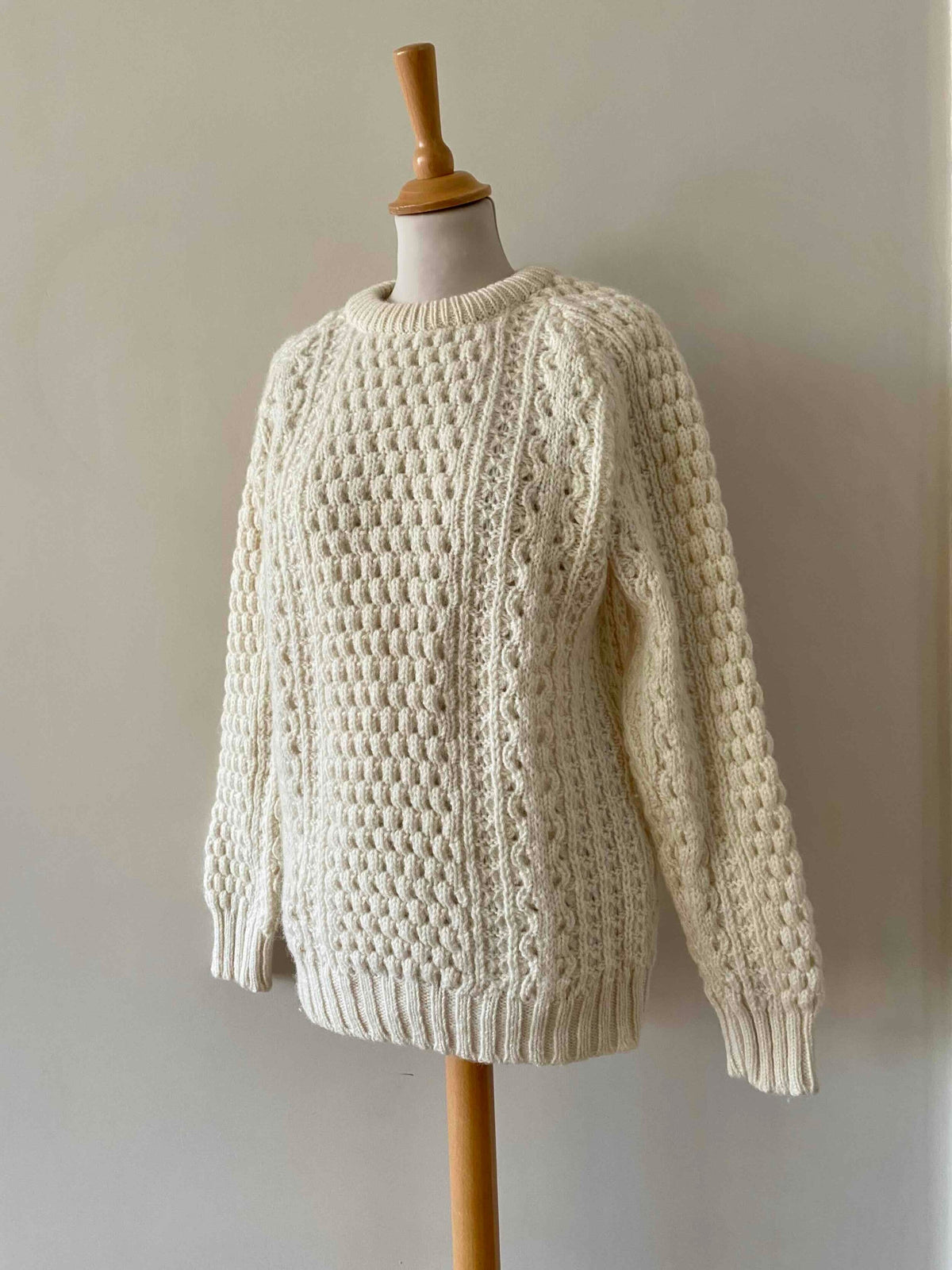 Unit price perIrish sweater in pure cream wool, with a twisted and honeycomb knit pattern, round neck, made in Ireland, sizes 36 and 38 shown here on a size 36 mannequin and fitted on a size 40 person.