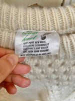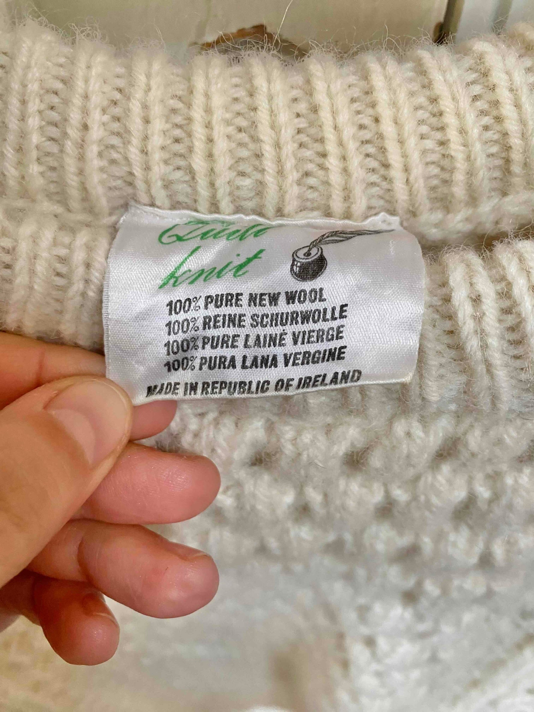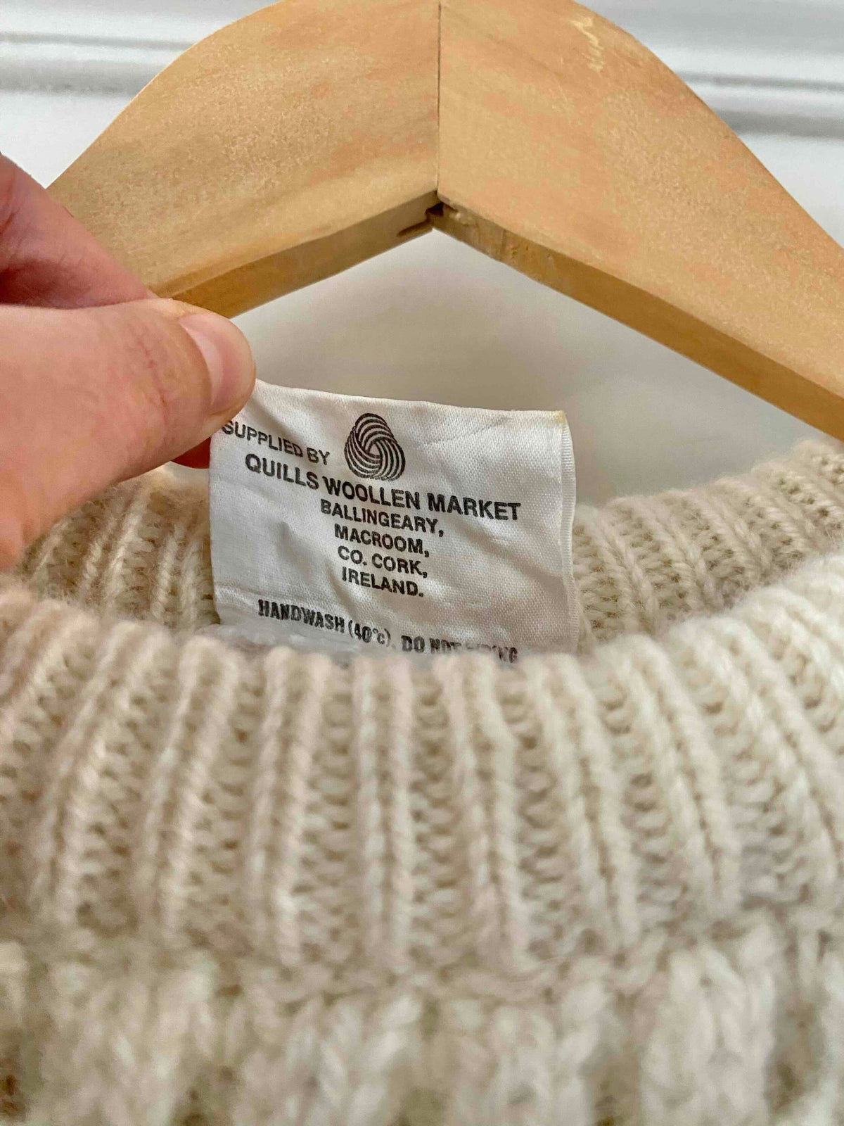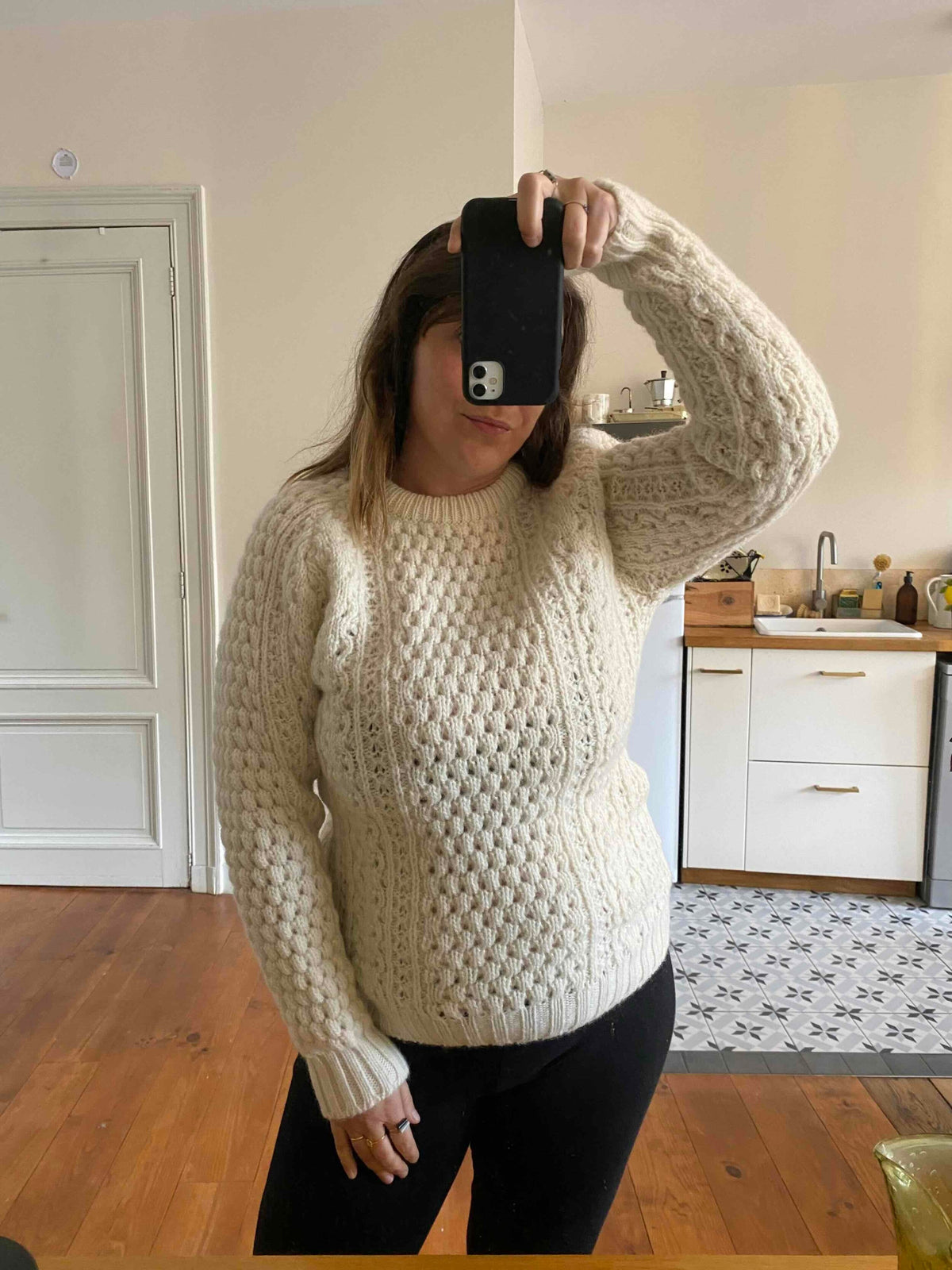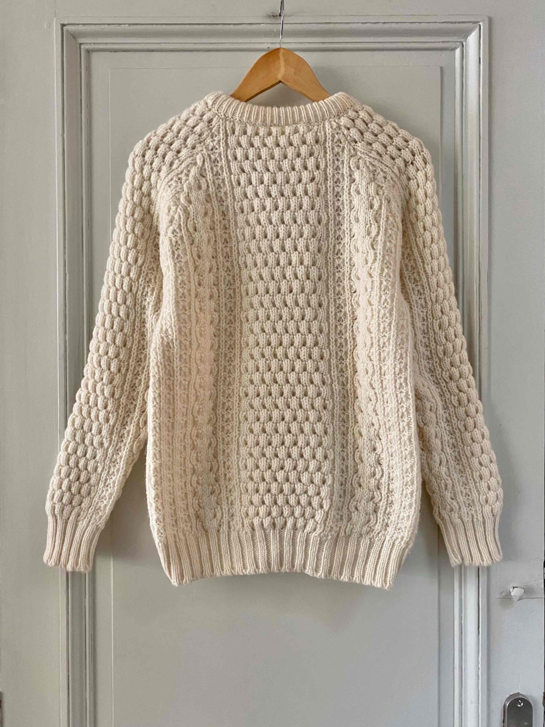 Unit price perIrish sweater in pure cream wool, with a twisted and honeycomb knit pattern, round neck, made in Ireland, sizes 36 and 38 shown here on a size 36 mannequin and fitted on a size 40 person.