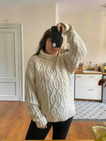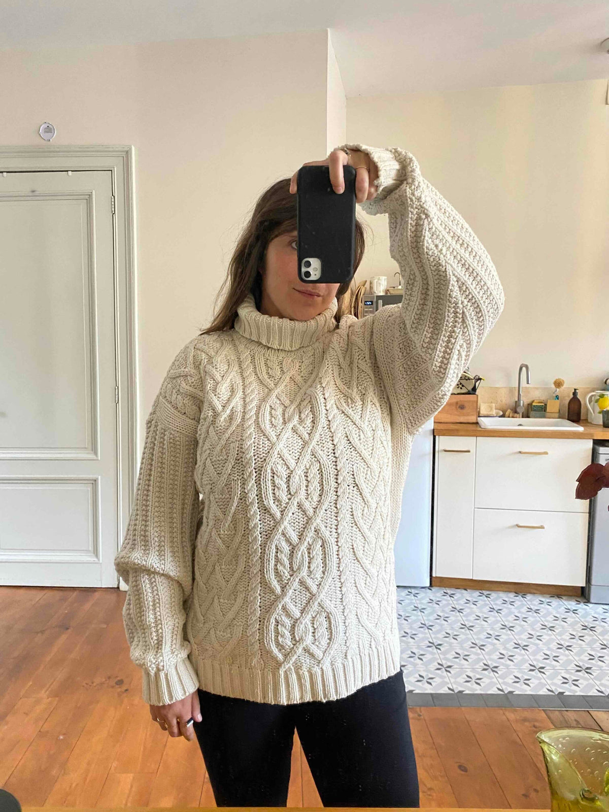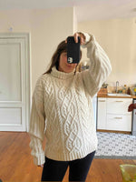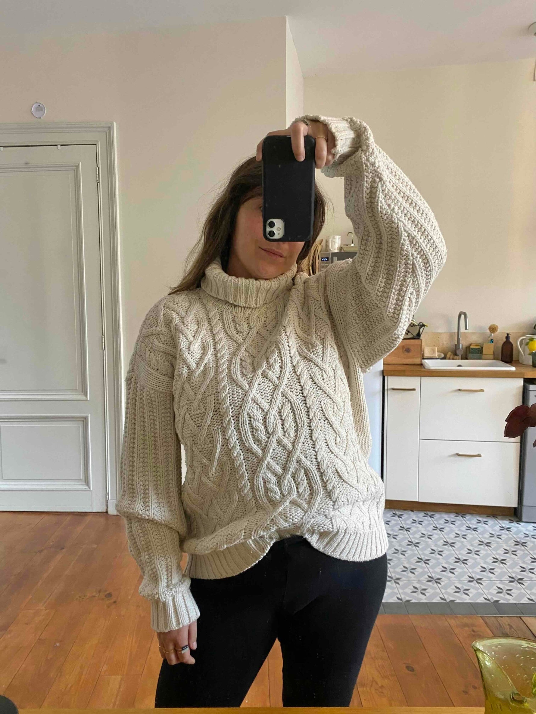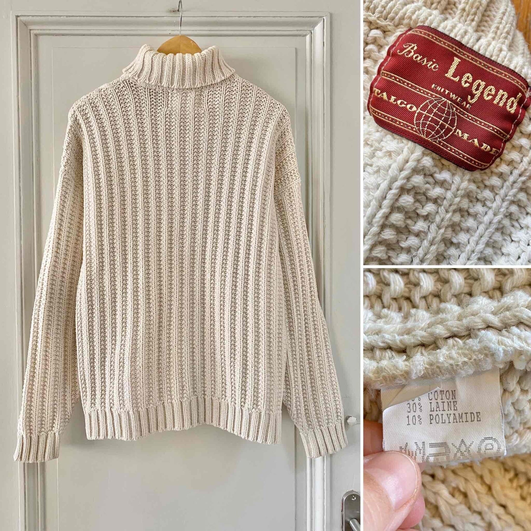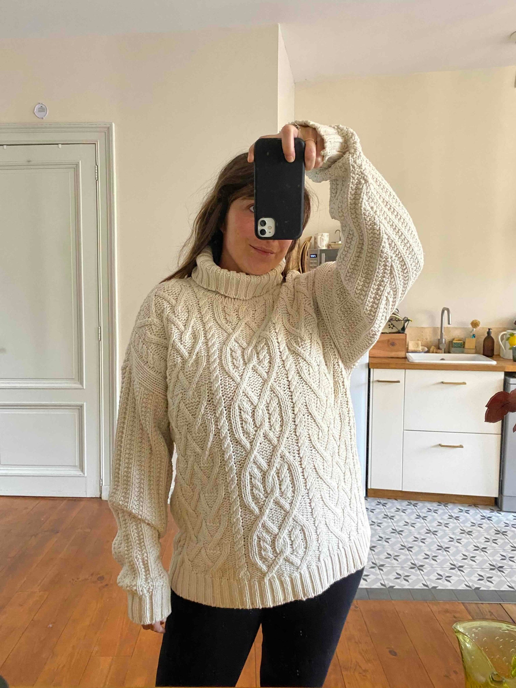 Irish turtleneck sweater, in ecru cotton and wool blend, long turtleneck, twisted knit, made in Europe, size 40 shown here on a size 40 model.