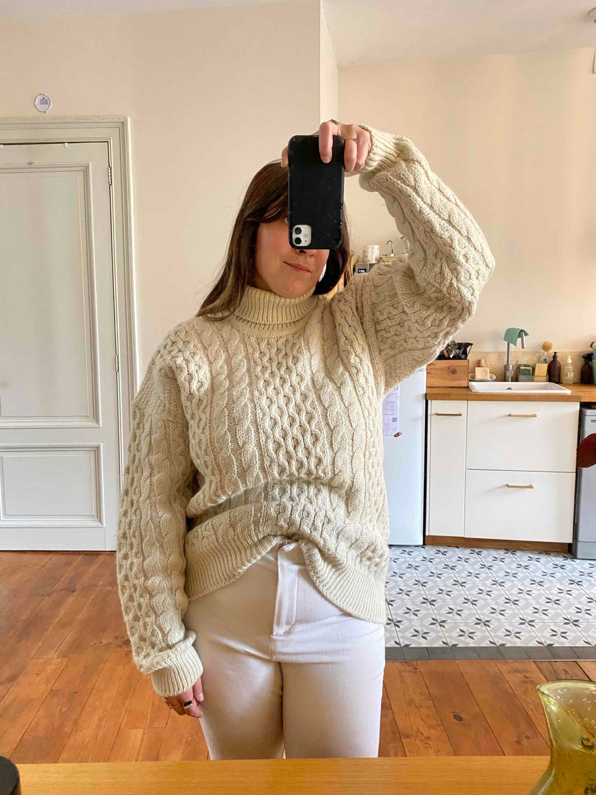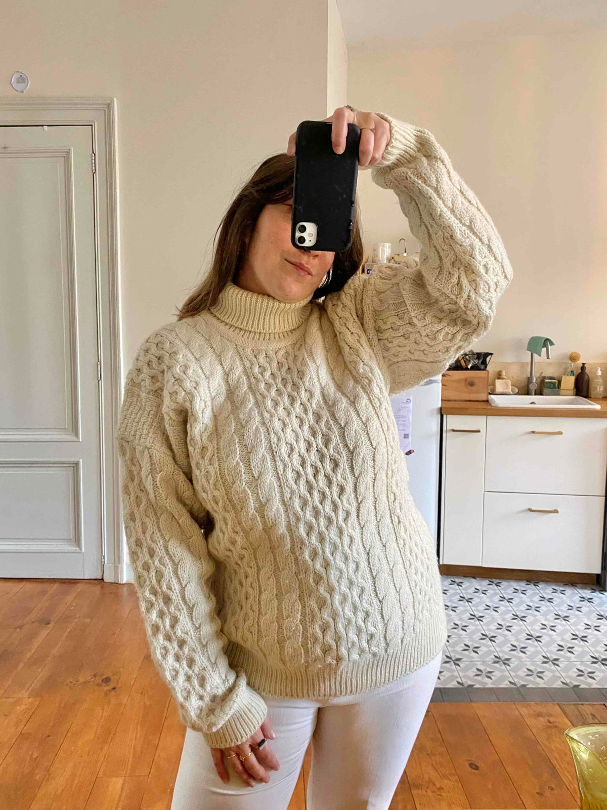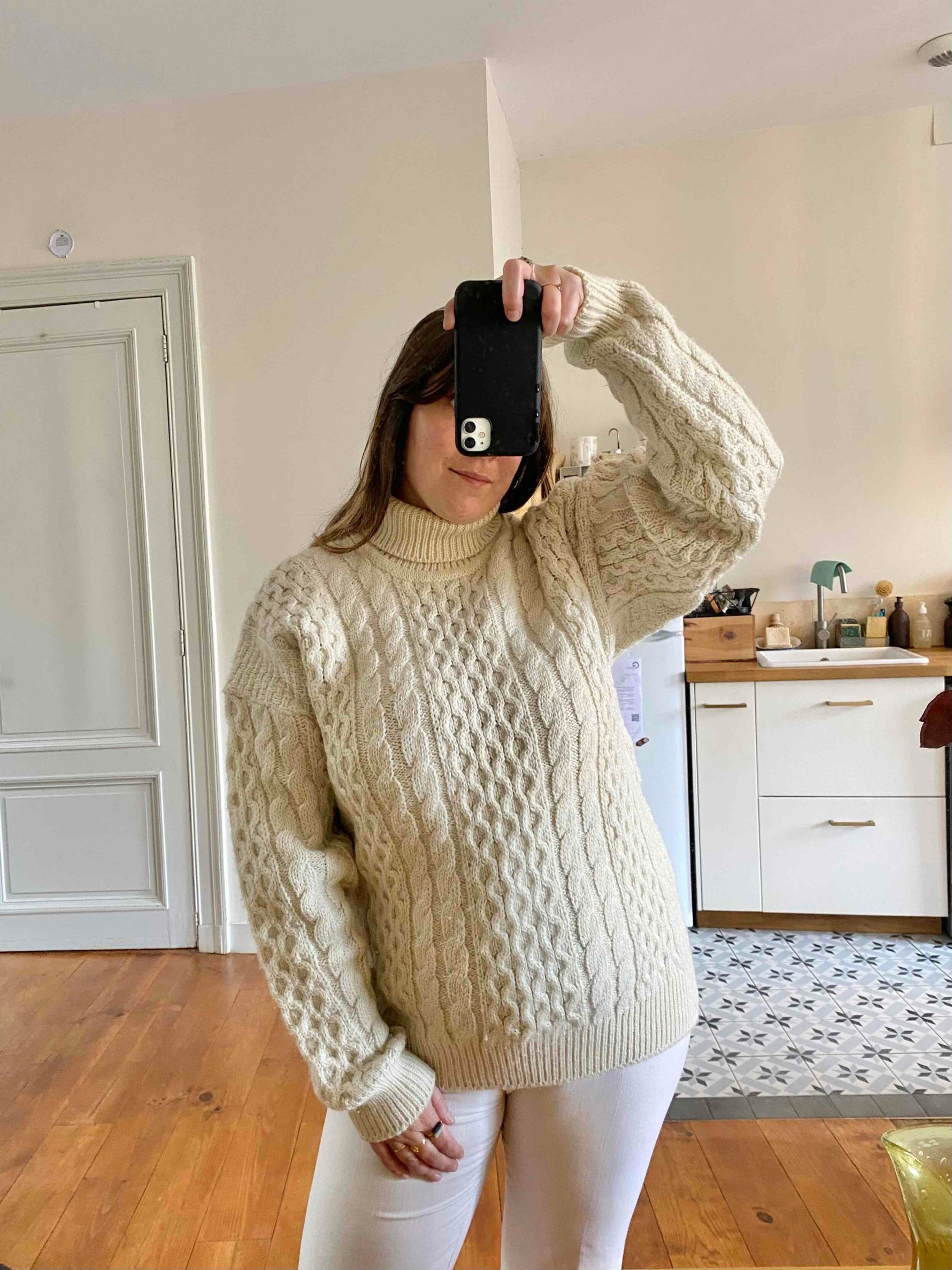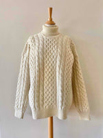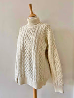 Unit price perIrish turtleneck sweater, in pure cream-colored wool, with twisted and honeycomb knit, made in Ireland, size L, size 40 worn here oversized on a size 36 mannequin and on a size 40 person.