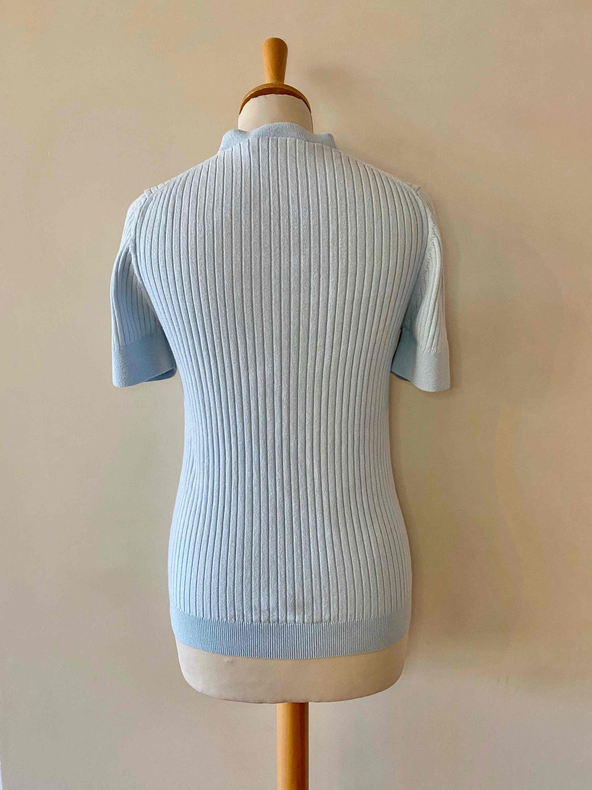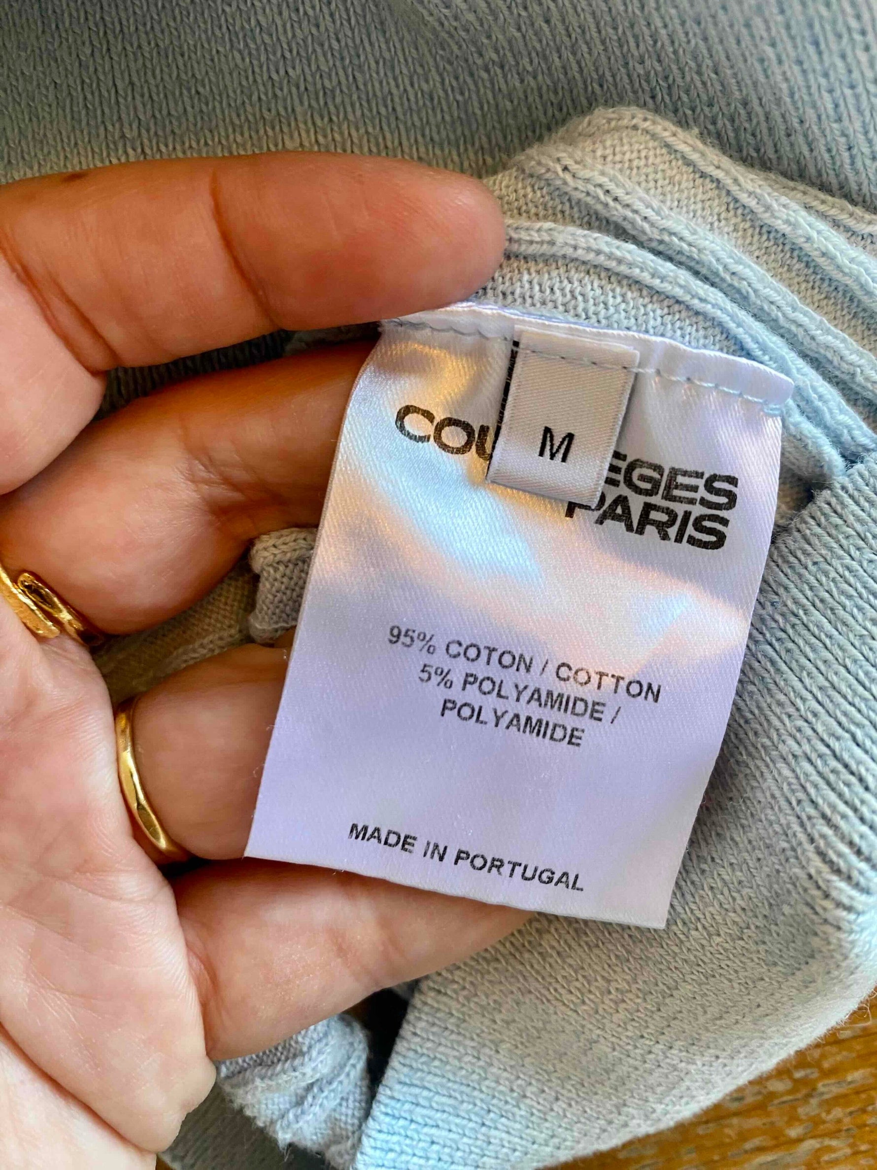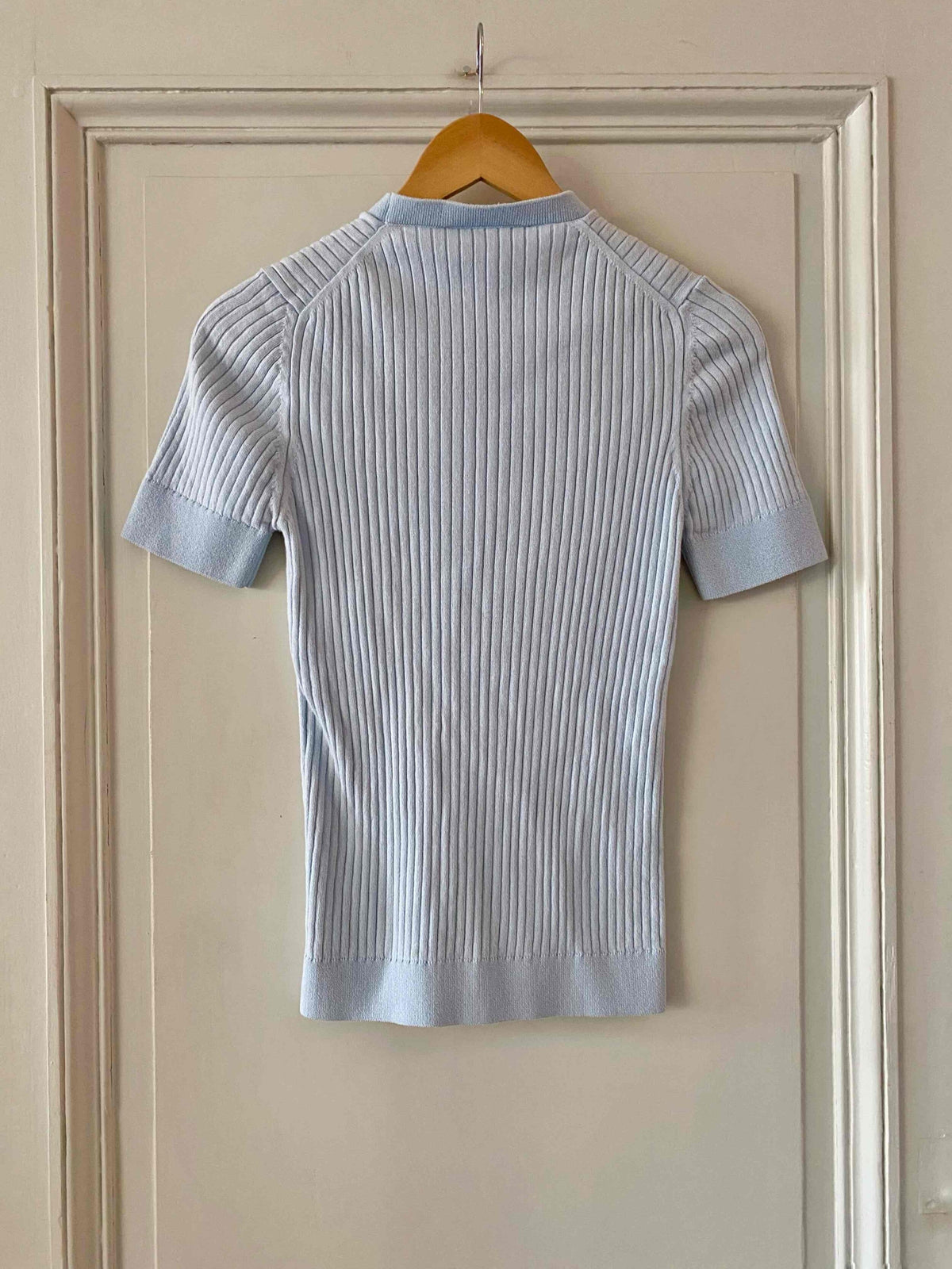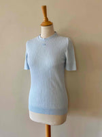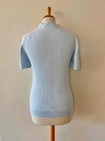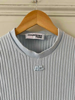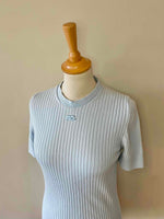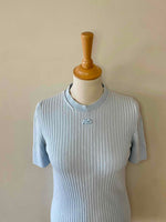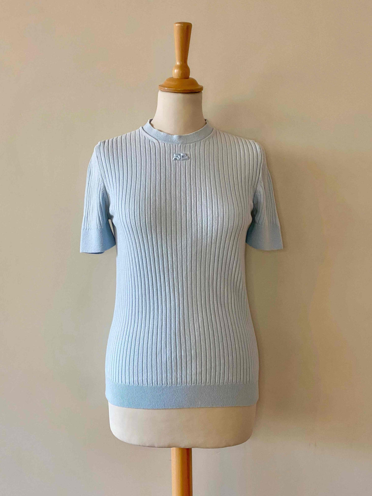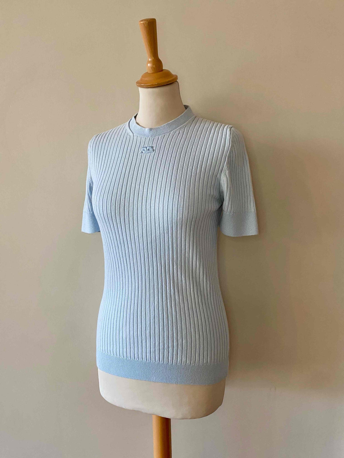 Courrèges knitted top, 100% sky blue ribbed cotton, round neck, short sleeves, embroidered logo on chest, made in Portugal, sizes 36 and 38 shown here on a size 36 mannequin.
