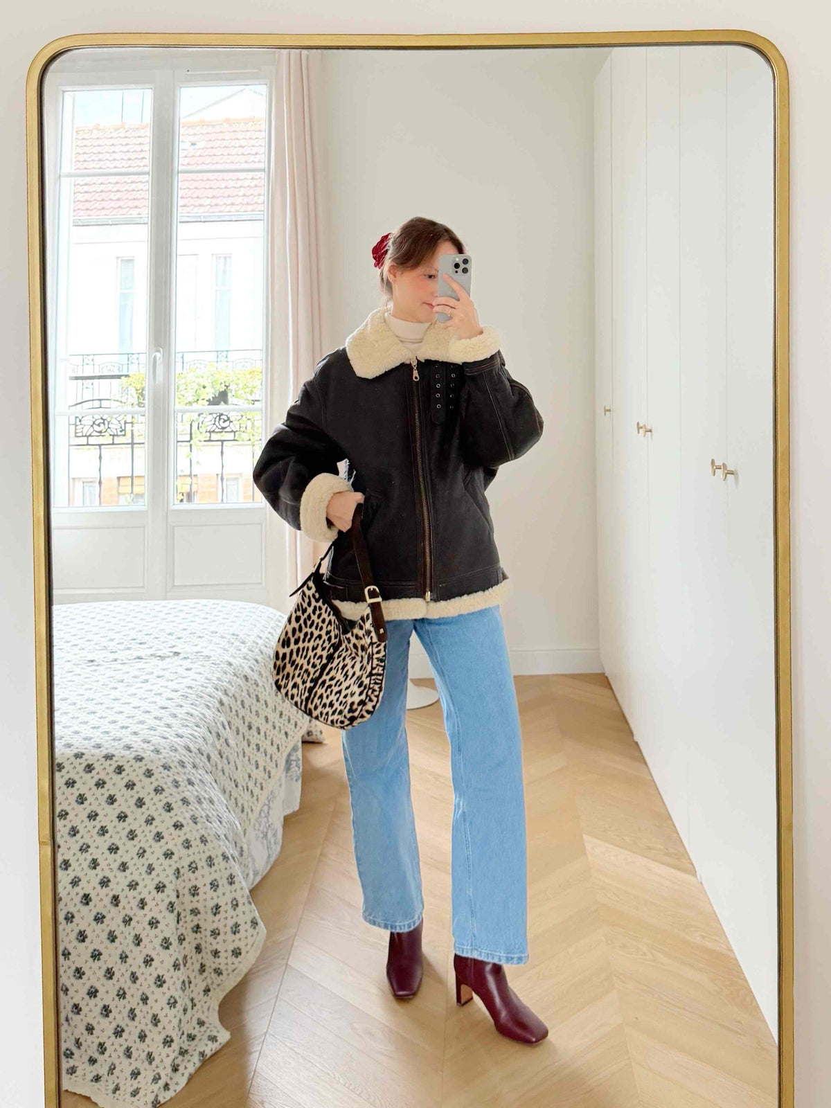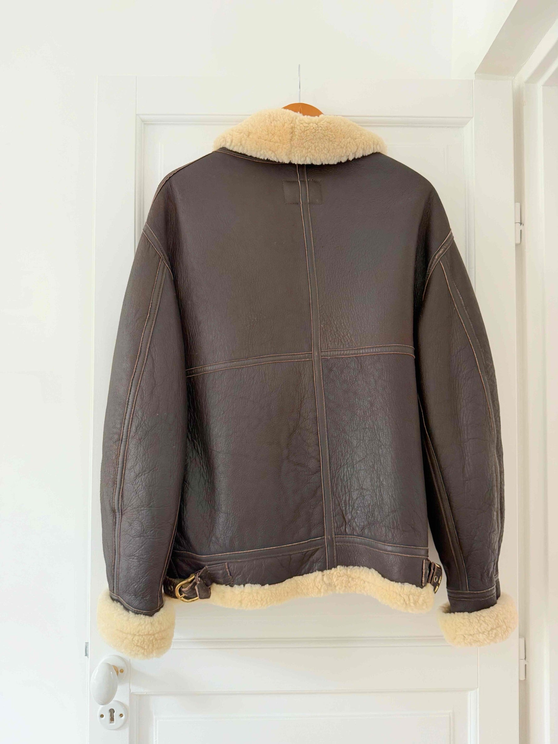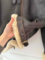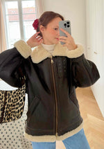 Unit price perBrown leather bomber jacket, fully lined with beige wool, front zip closure, two pockets, straps at the collar, worn here oversized on a size 36 for 1m64.