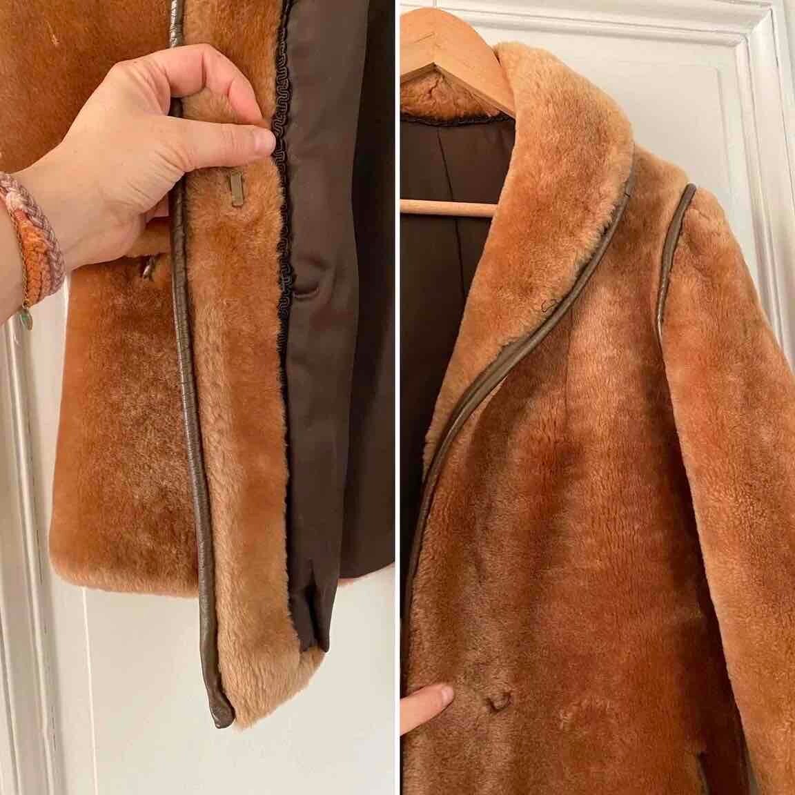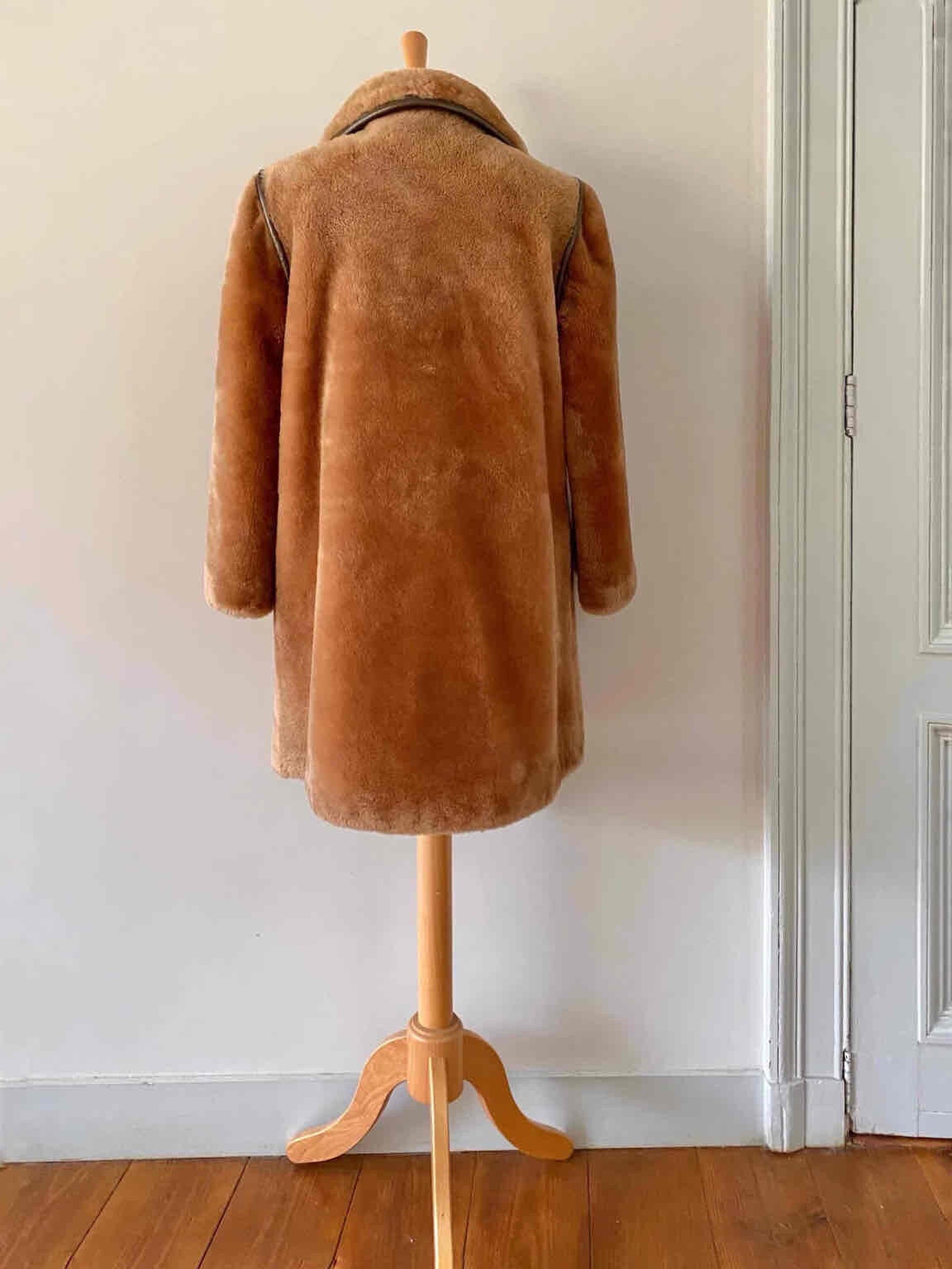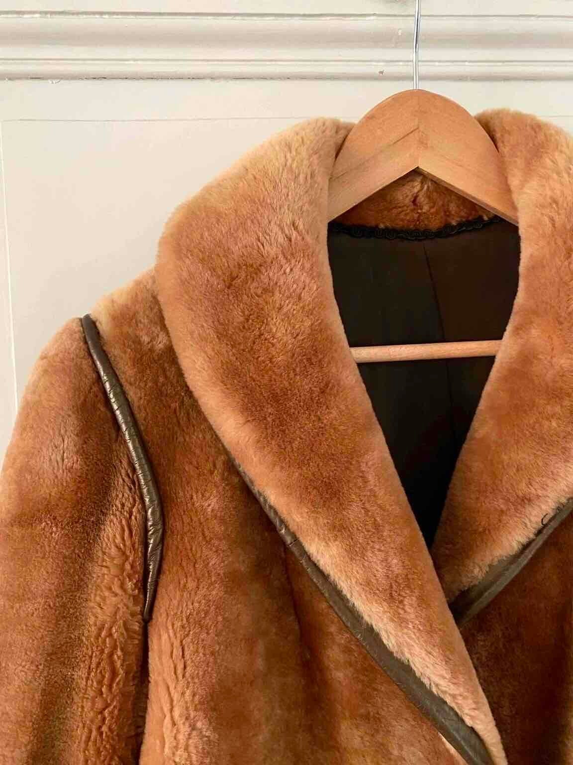 Golden lambskin, caramel fawn color, trimmed with brown leather, shawl collar, hook closure, gathered cap sleeves, size 36, shown here on a size 36 mannequin and open on a size 40 person.