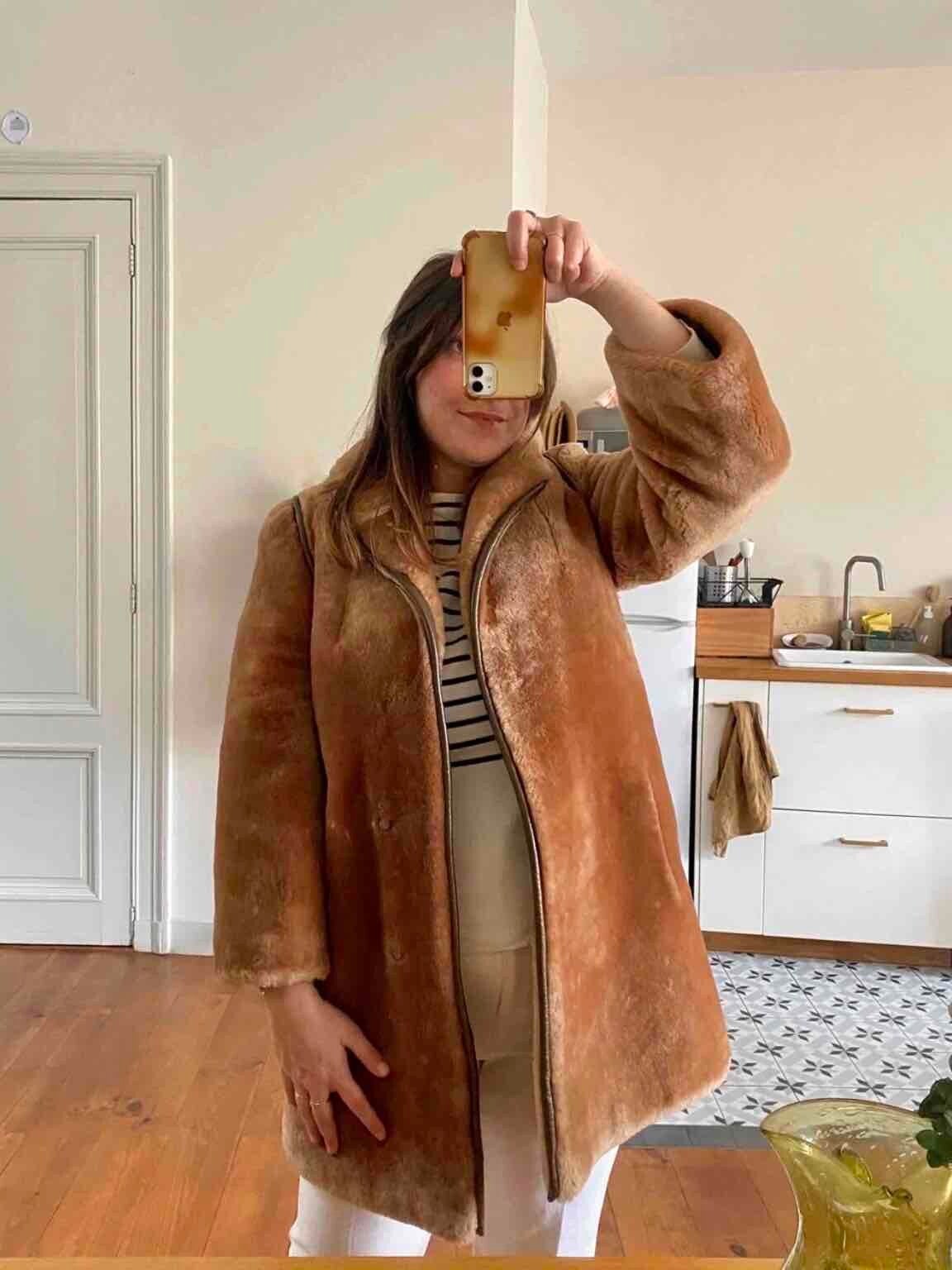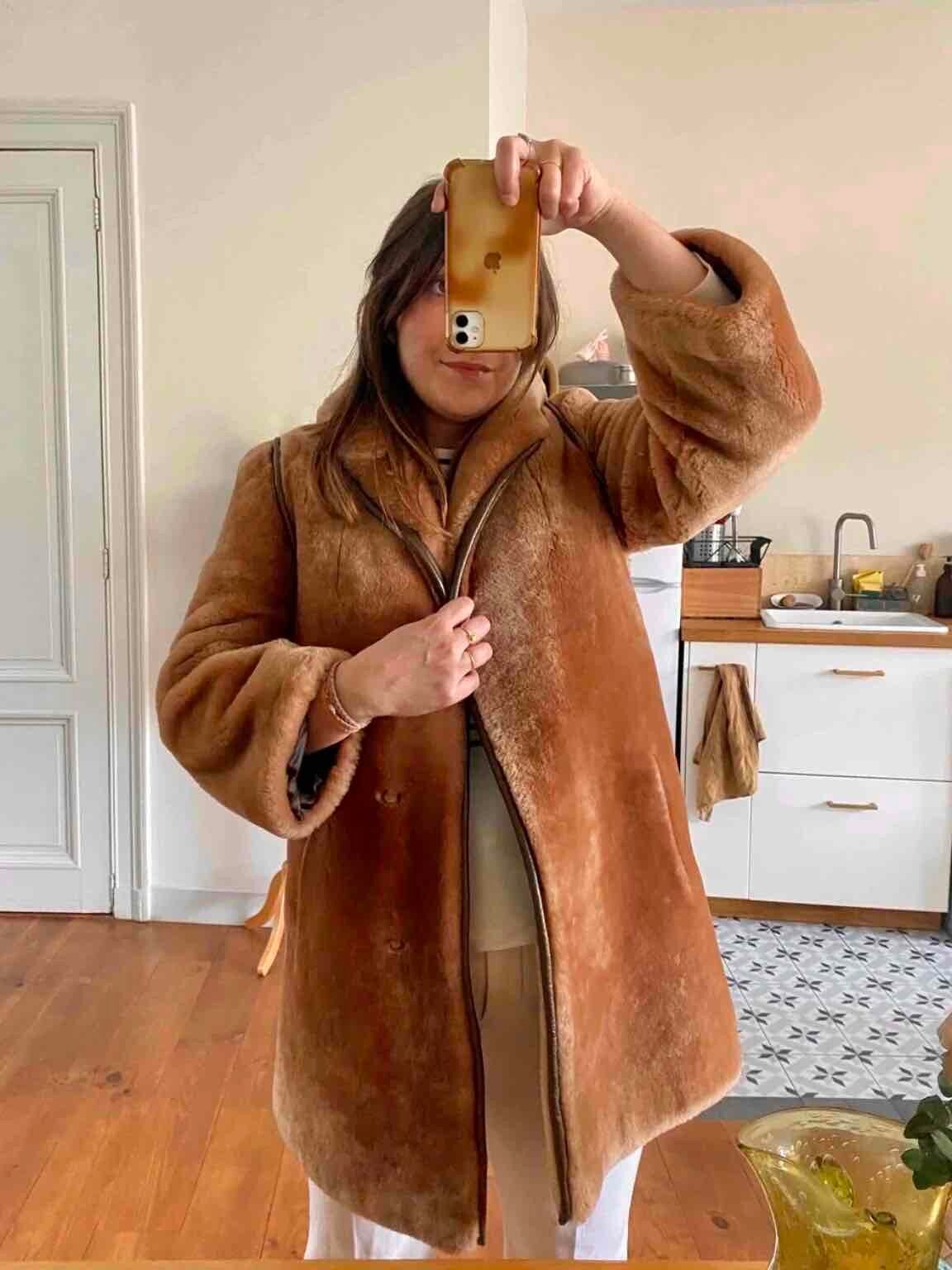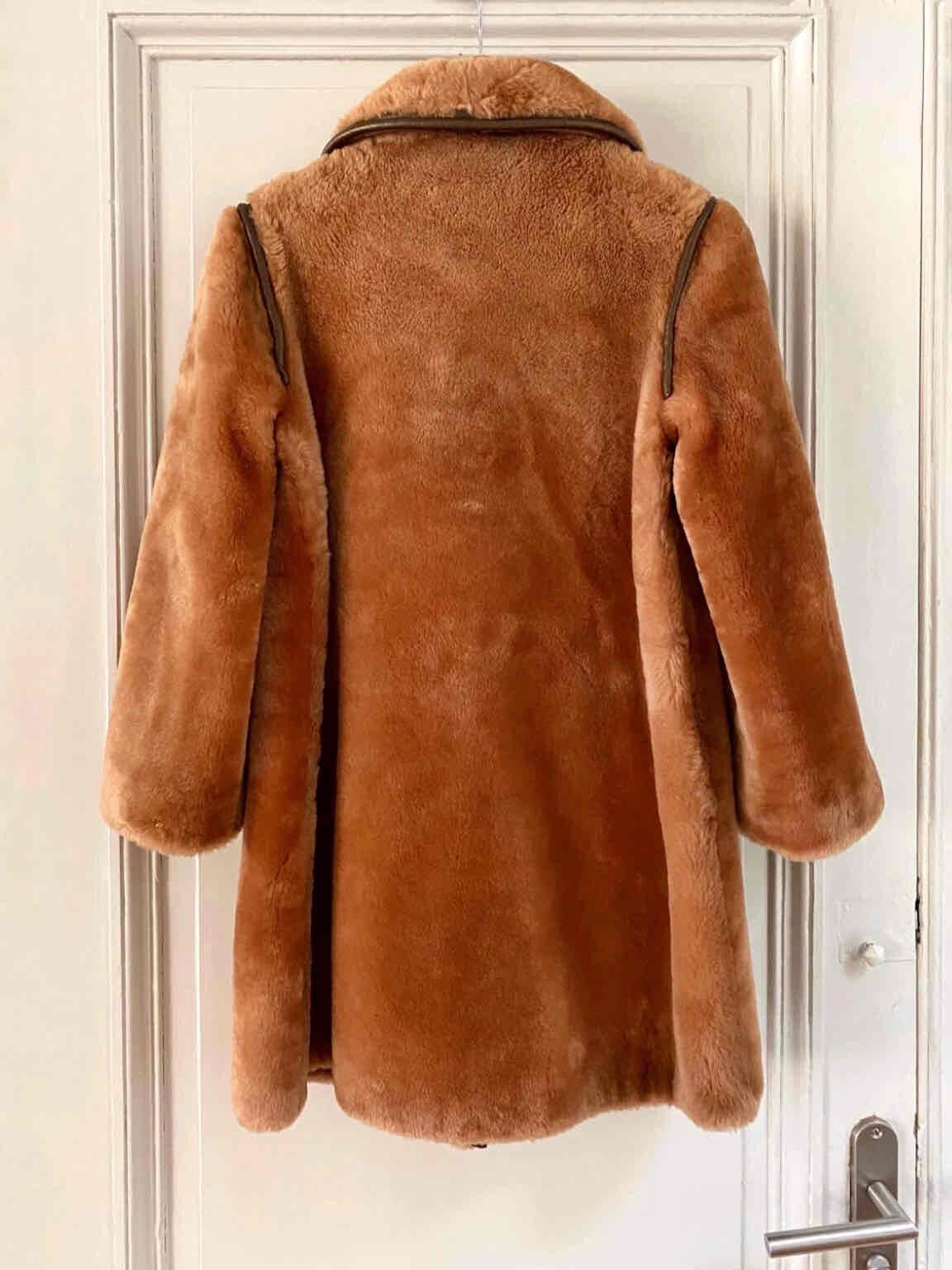 Golden lambskin, caramel fawn color, trimmed with brown leather, shawl collar, hook closure, gathered cap sleeves, size 36, shown here on a size 36 mannequin and open on a size 40 person.