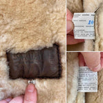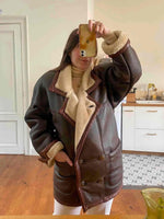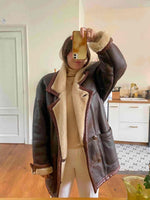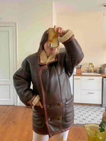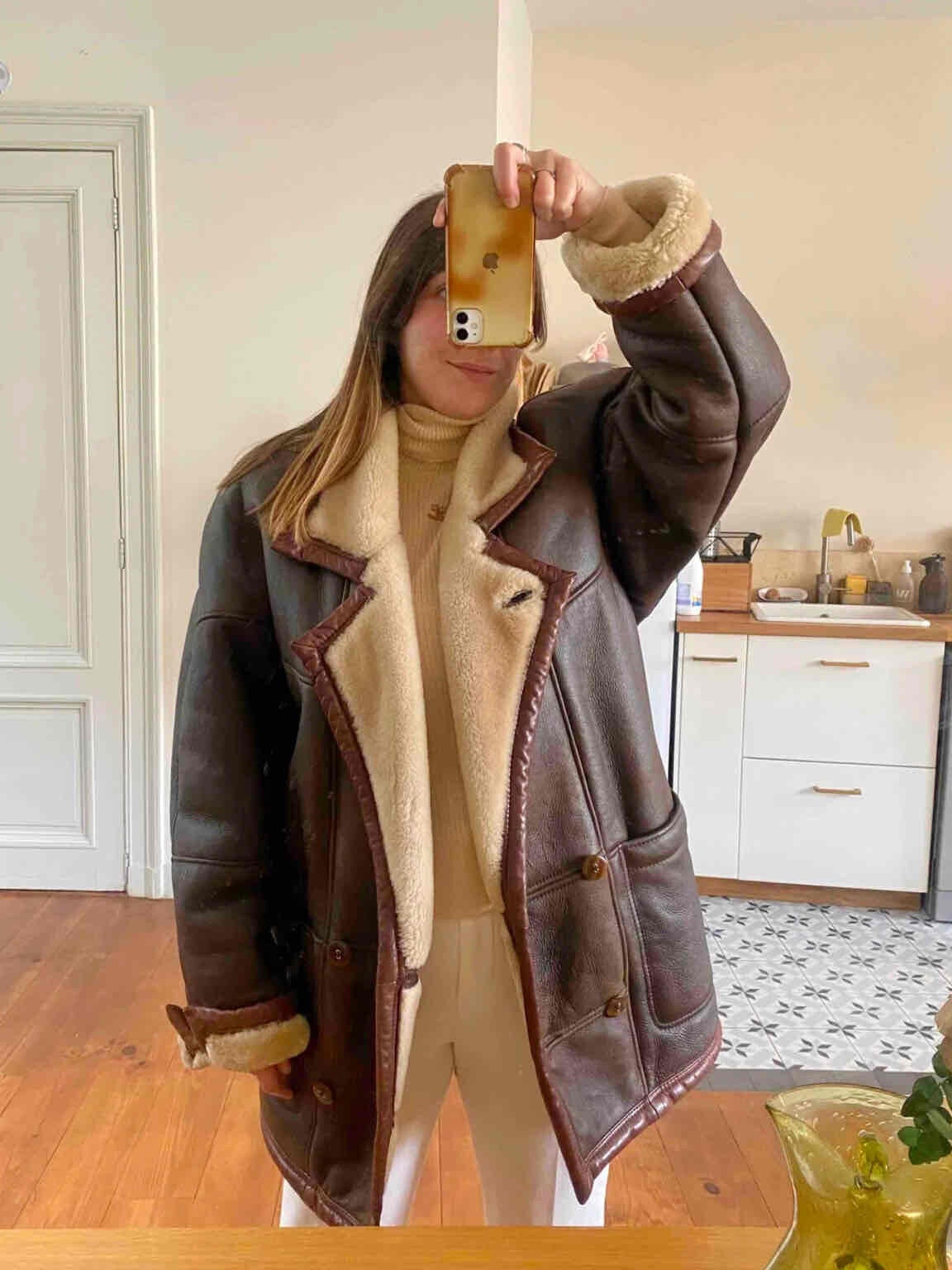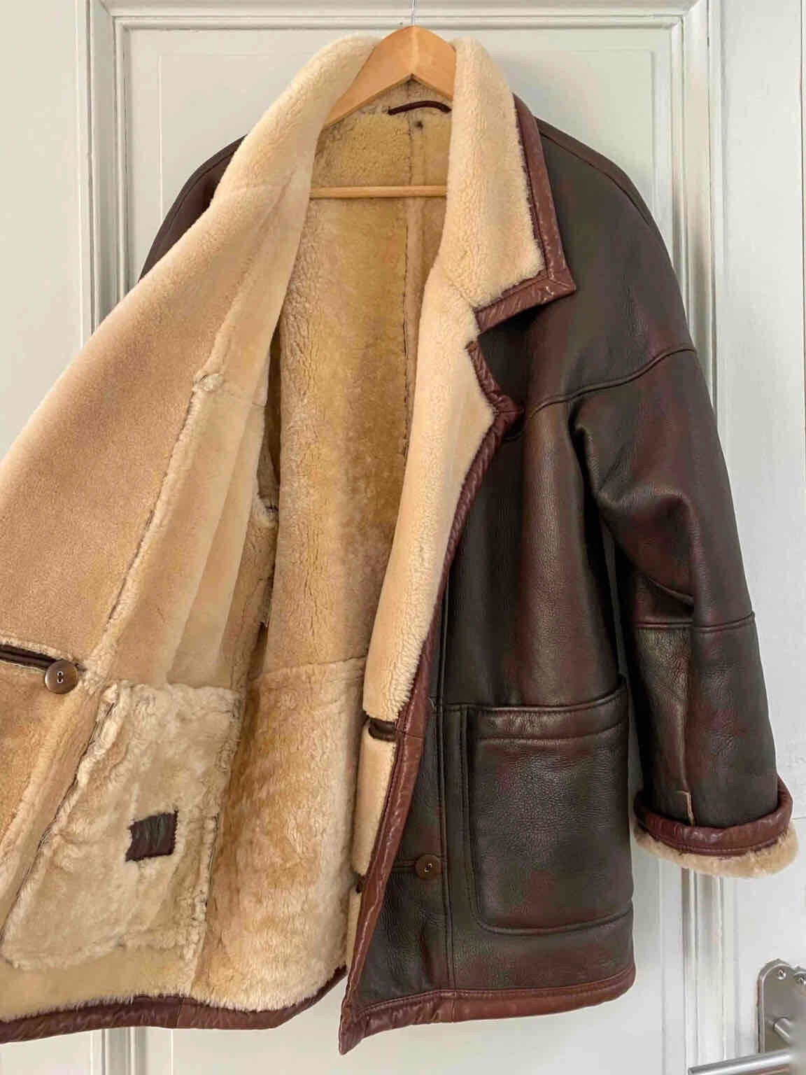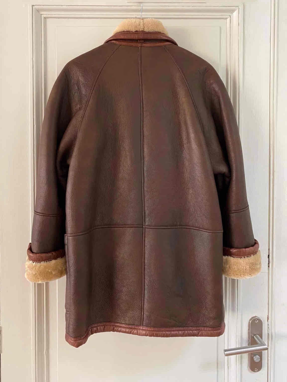 Sheepskin coat with reversed sheepskin exterior in chocolate brown leather trimmed with cognac brown leather, ecru sheepskin interior, crossover buttoning, large button-up sheepskin collar, made in Italy, size 40 shown here on a size 40 model, hip opening 50cm.
