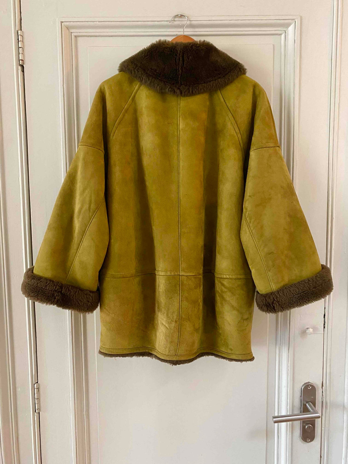 Unit price perSuede sheepskin jacket with olive green outer layer and khaki brown sheepskin inner layer, sheepskin collar, flared pagoda sleeves with cuffs, large horn buttons, made in Italy, size 38 shown here fitted on a size 40 model.