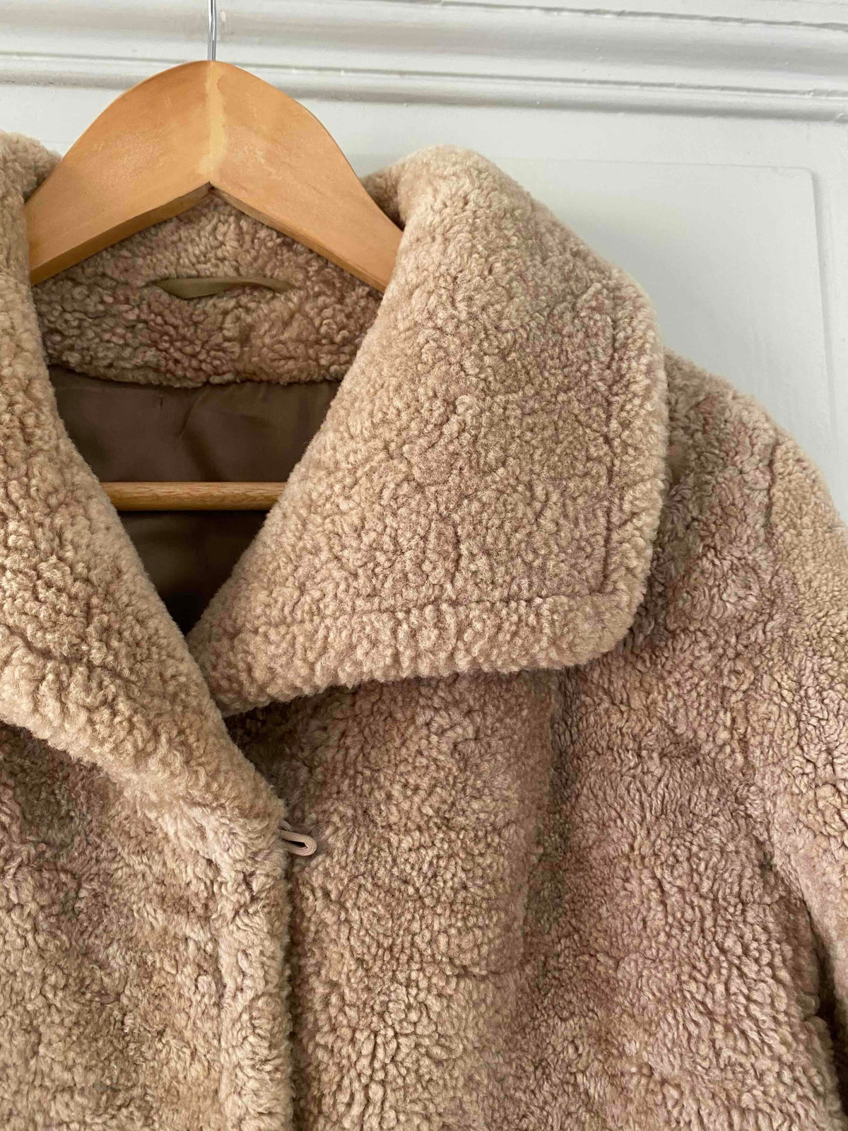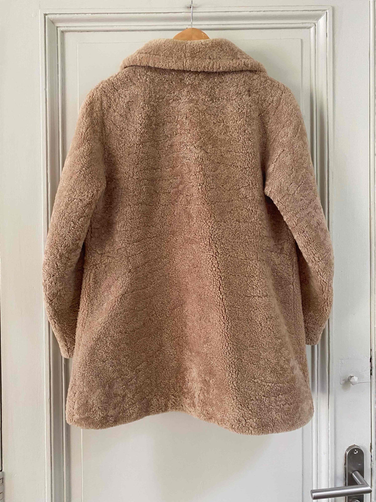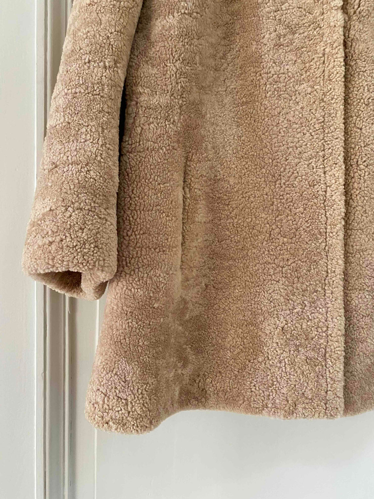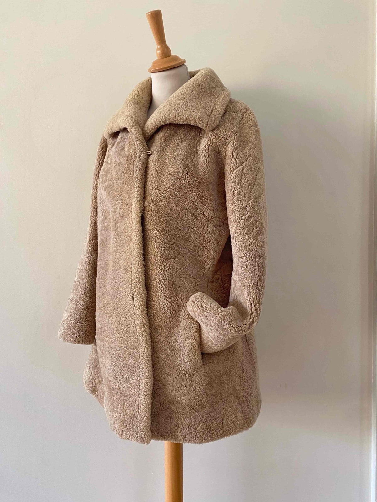 Unit price perSheepskin coat with sheepskin fur lining, beige sheepskin, golden sheepskin, collar and hook closure, 70's style, sizes 36 and 38, shown here on a size 36 mannequin and fitted on a size 40 person.