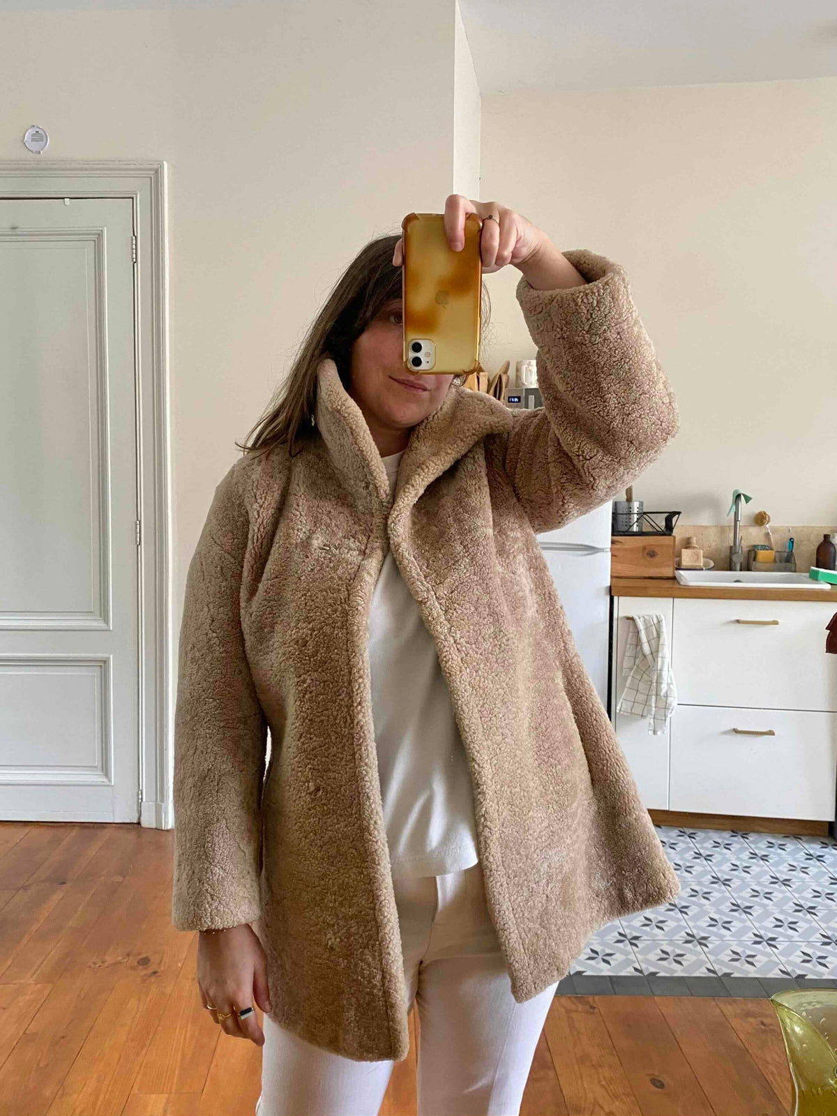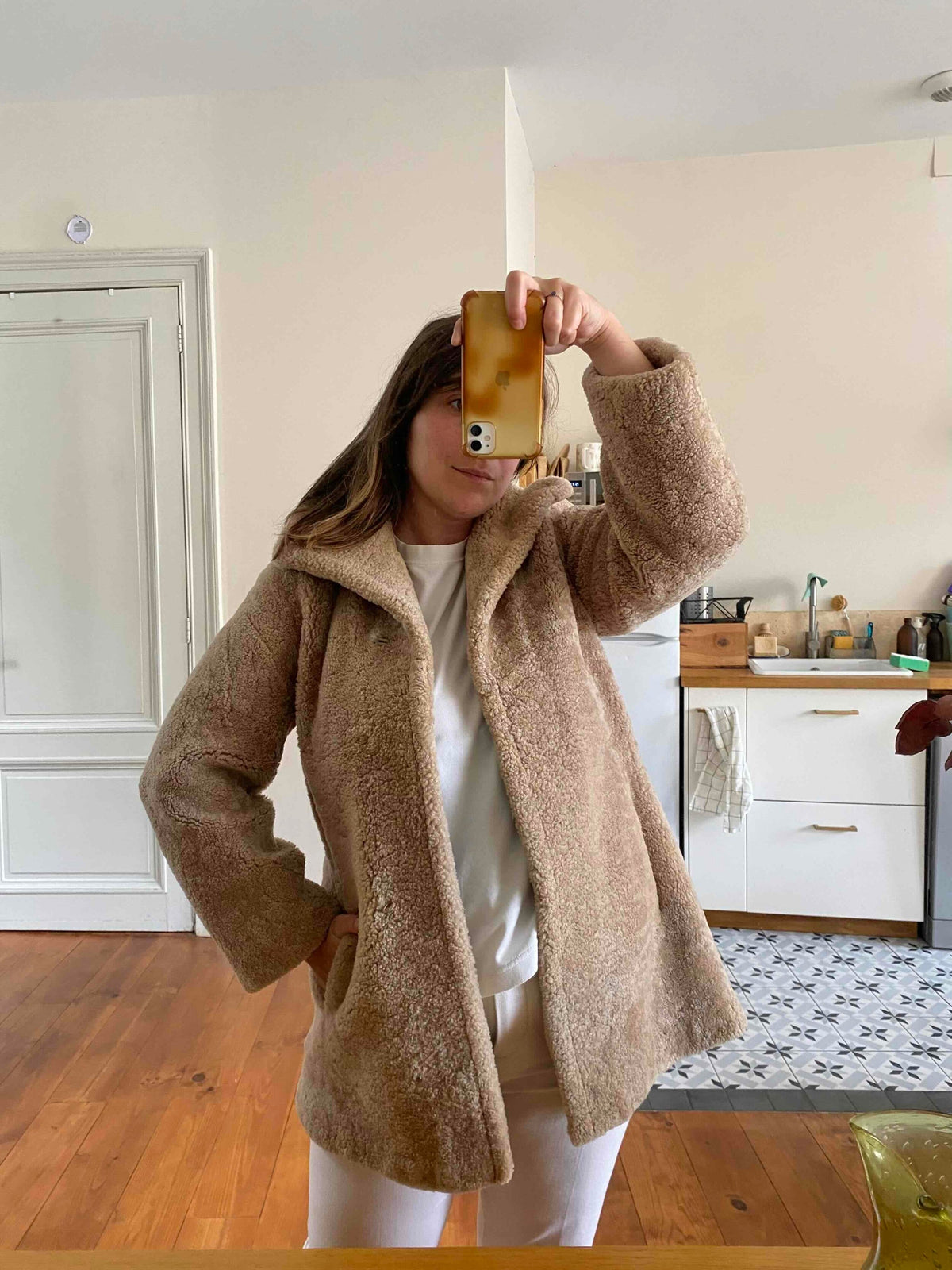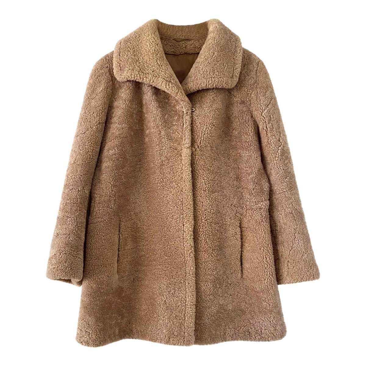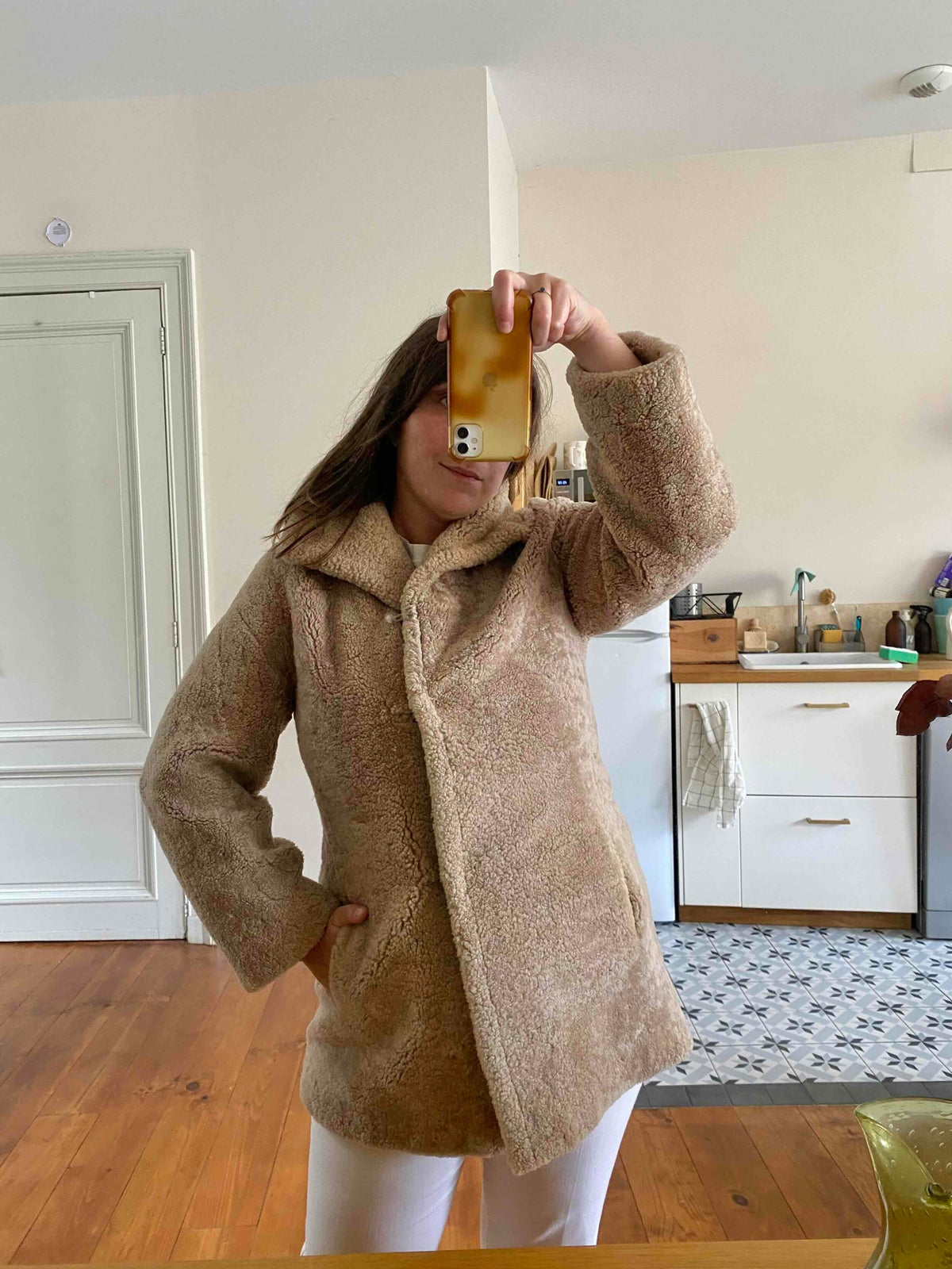 Unit price perSheepskin coat with sheepskin fur lining, beige sheepskin, golden sheepskin, collar and hook closure, 70's style, sizes 36 and 38, shown here on a size 36 mannequin and fitted on a size 40 person.