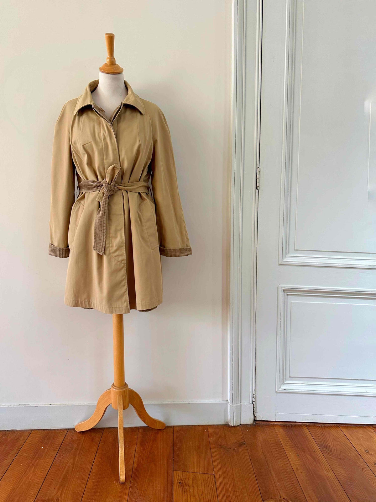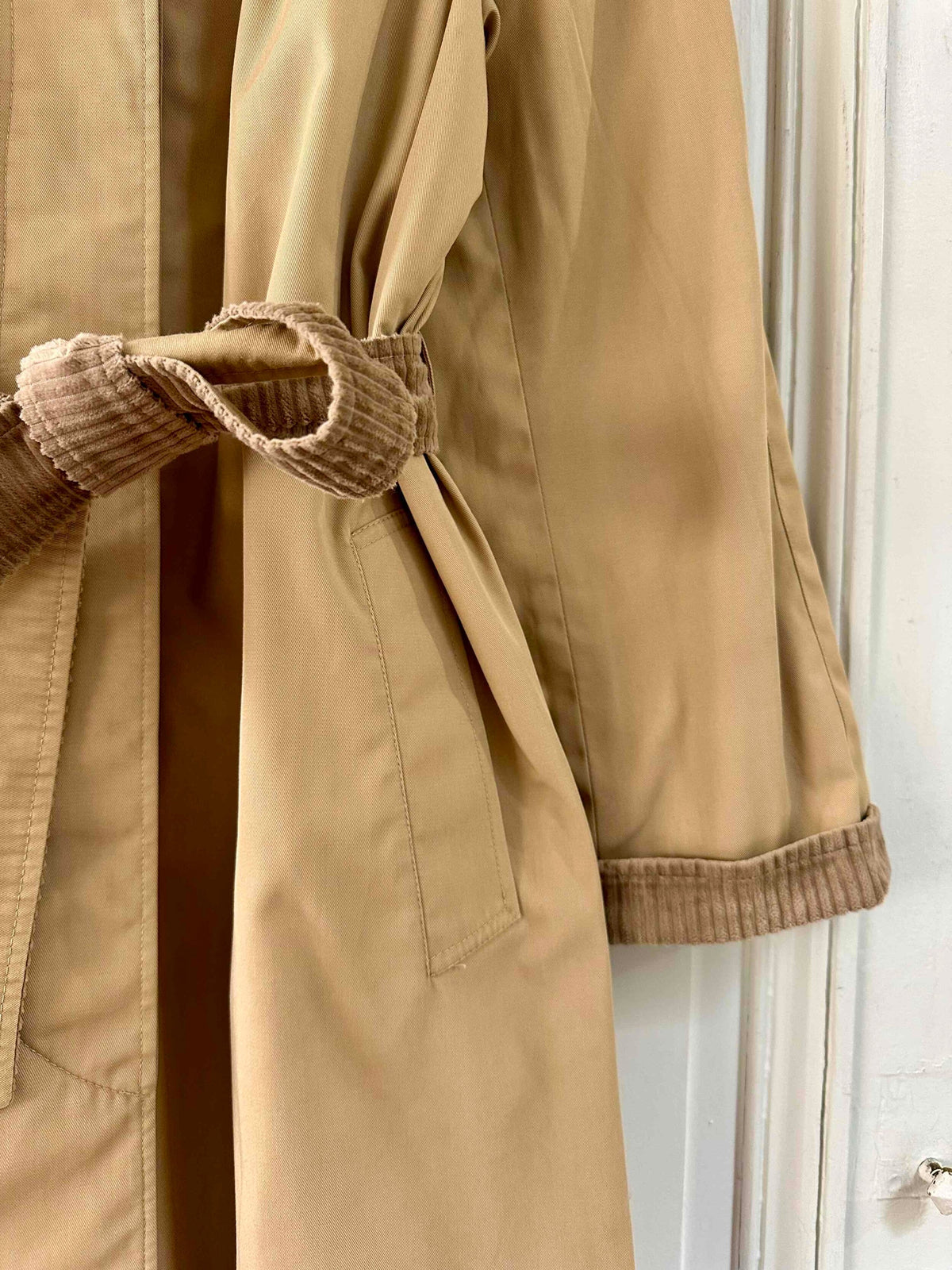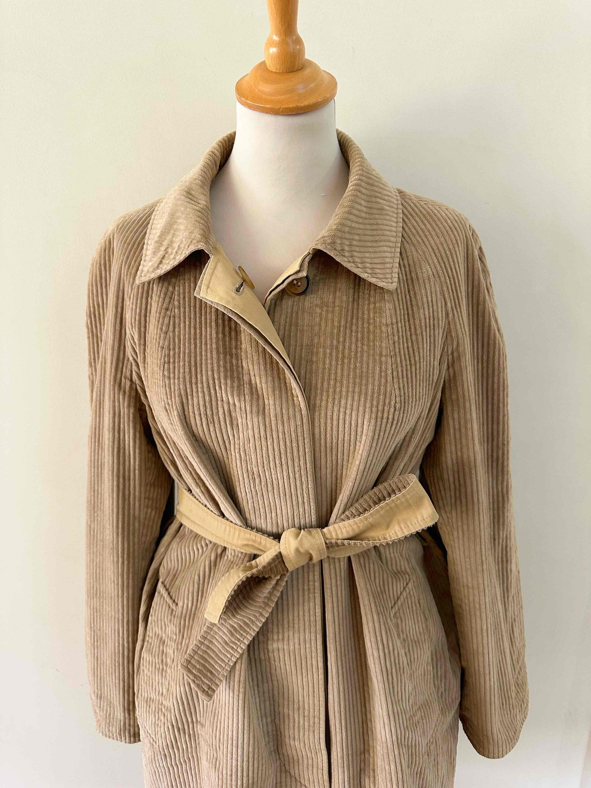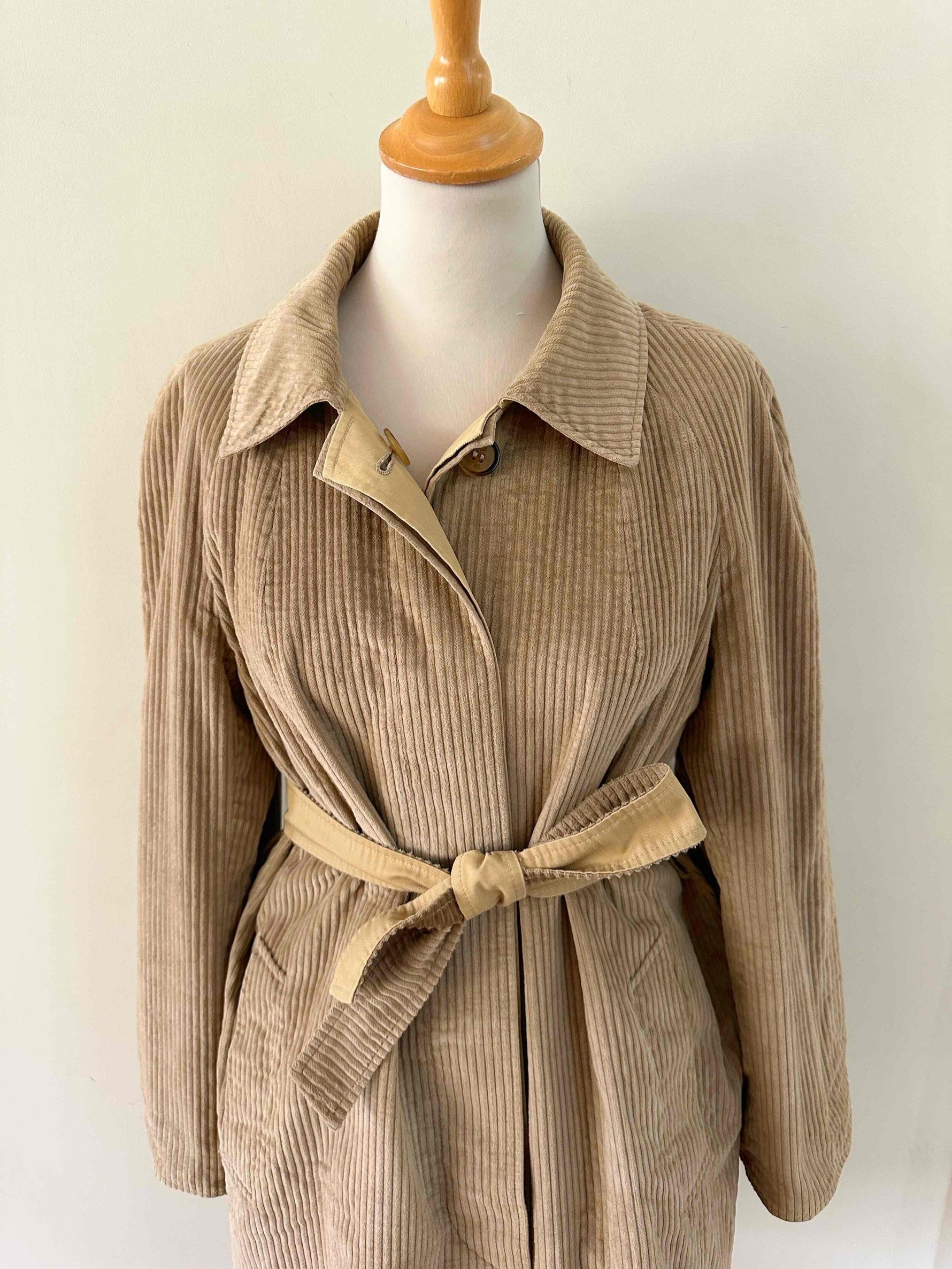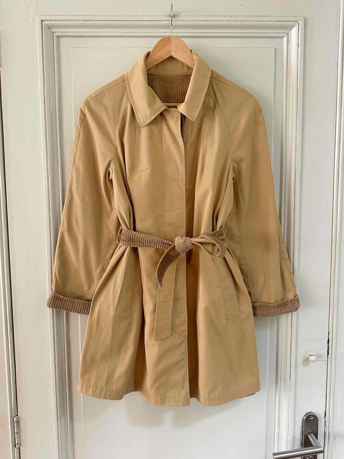 Reversible corduroy trench coat, camel beige gabardine reversible to beige corduroy.