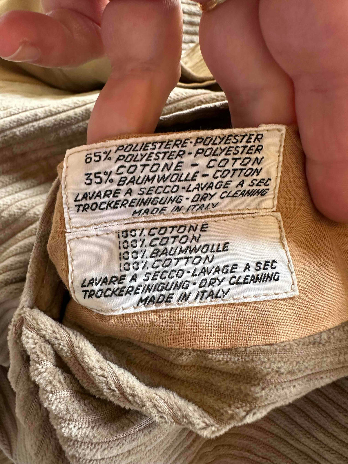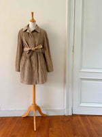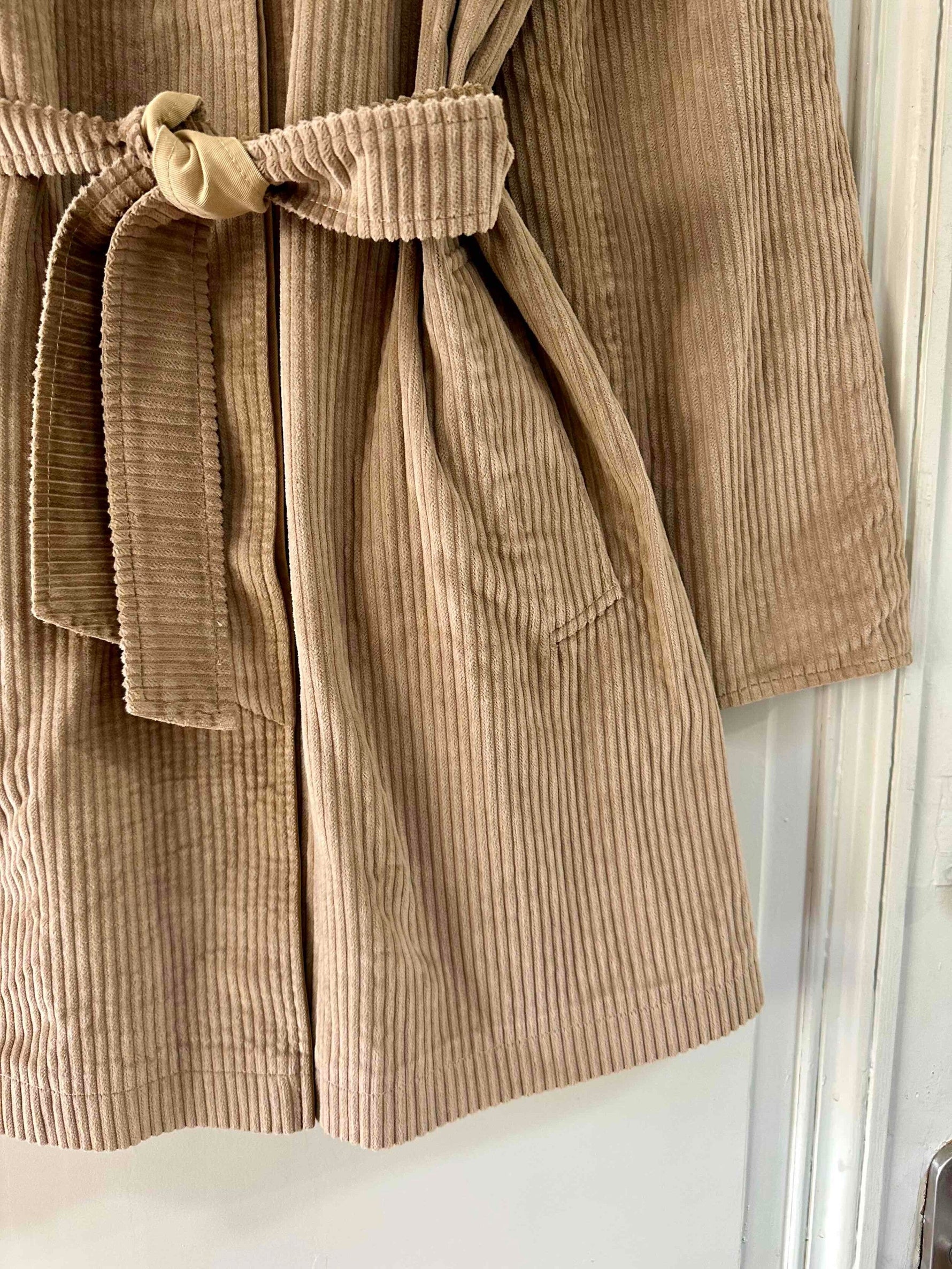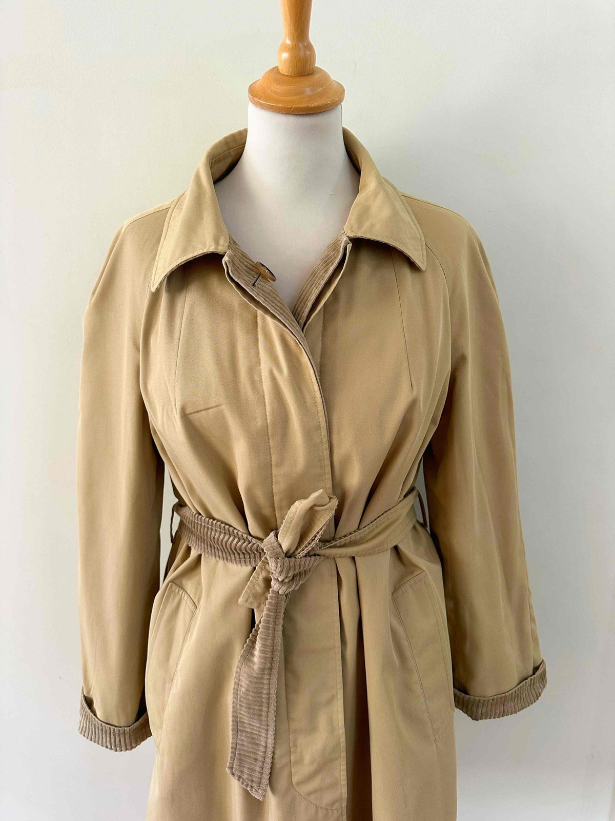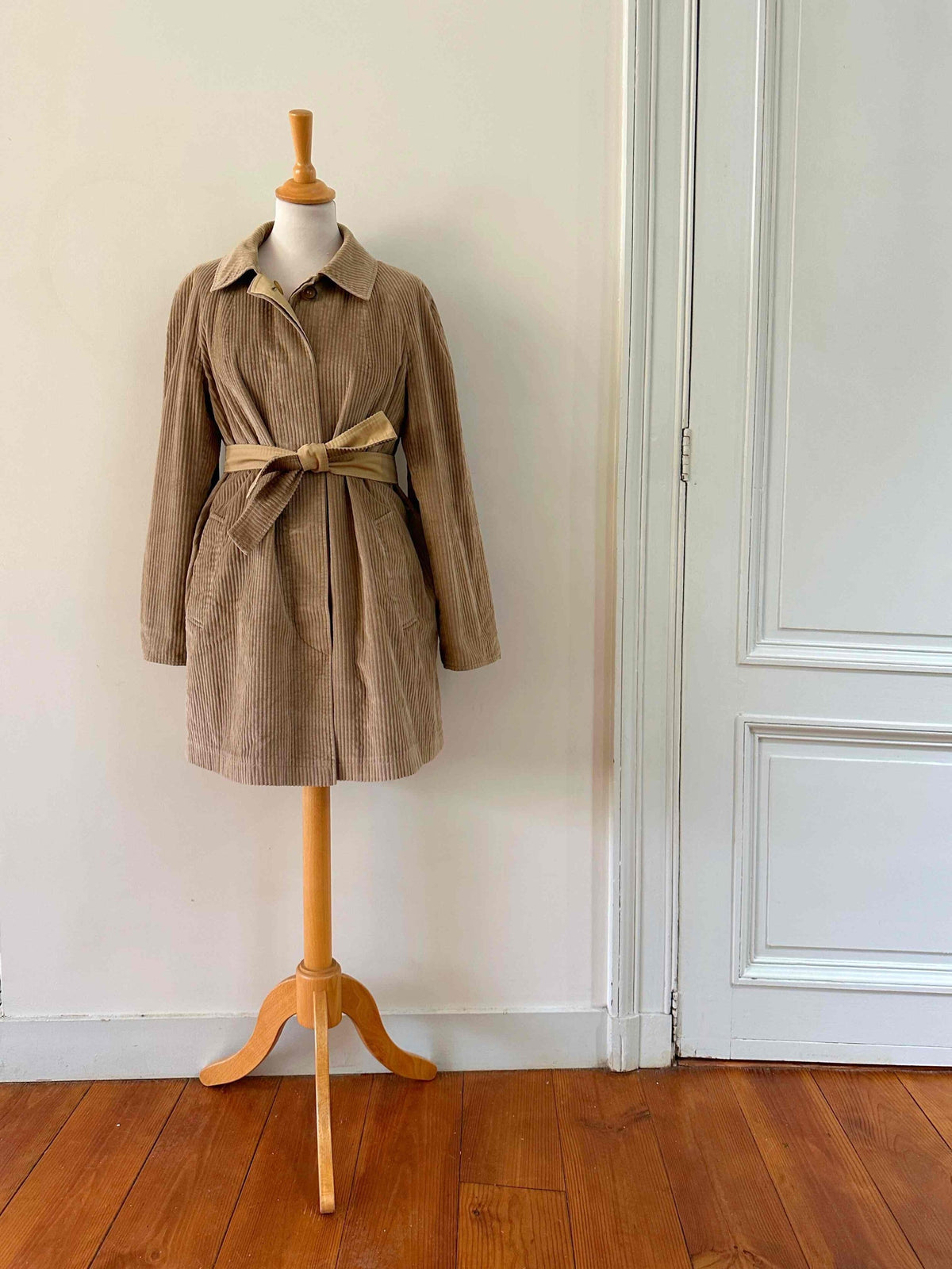 Reversible corduroy trench coat, camel beige gabardine reversible to beige corduroy.