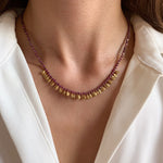Collier en perles en rubis et pendentifs ovales en acier inoxydable.