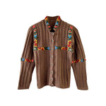 Austrian cardigan in pure camel taupe wool, embroidered with multicolored red, orange, yellow, blue and green flowers, turtleneck, embroidered balloon sleeves, silver-colored rhinestone and black jewel buttons, hand-knitted and embroidered in Austria.