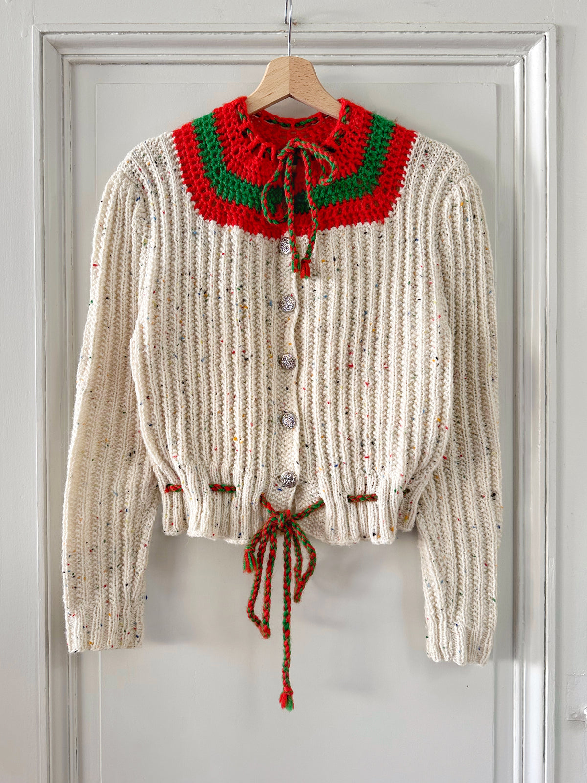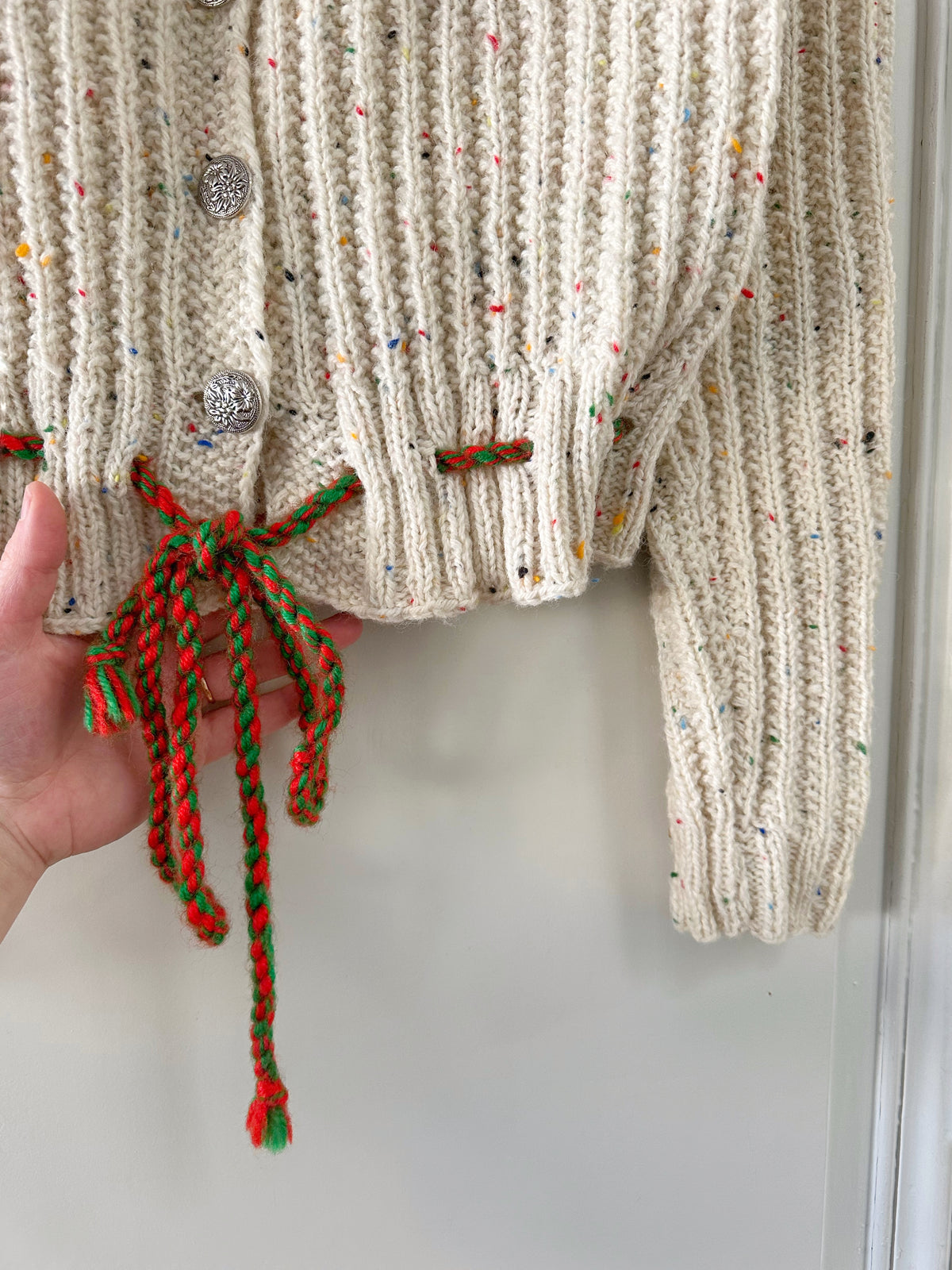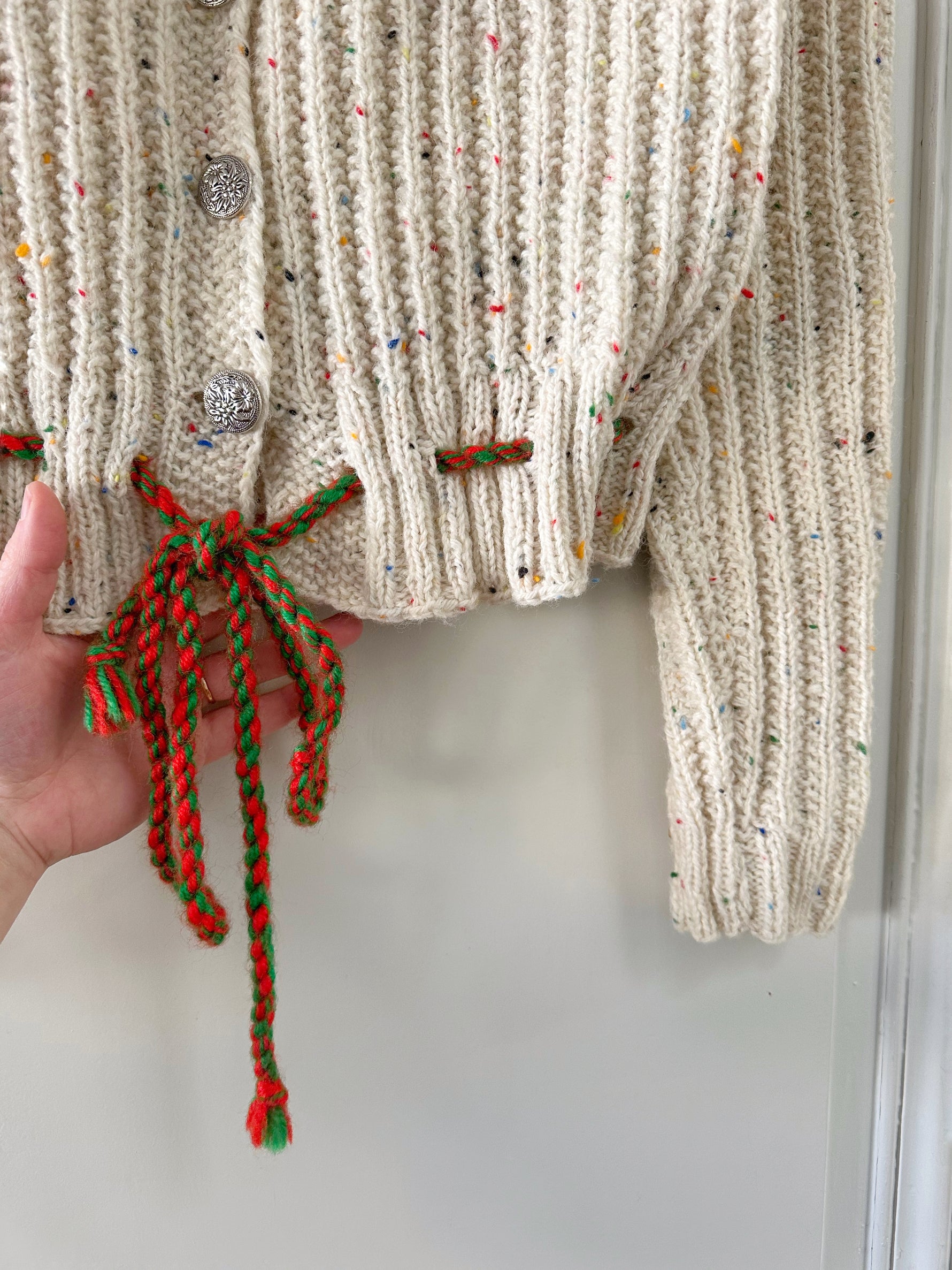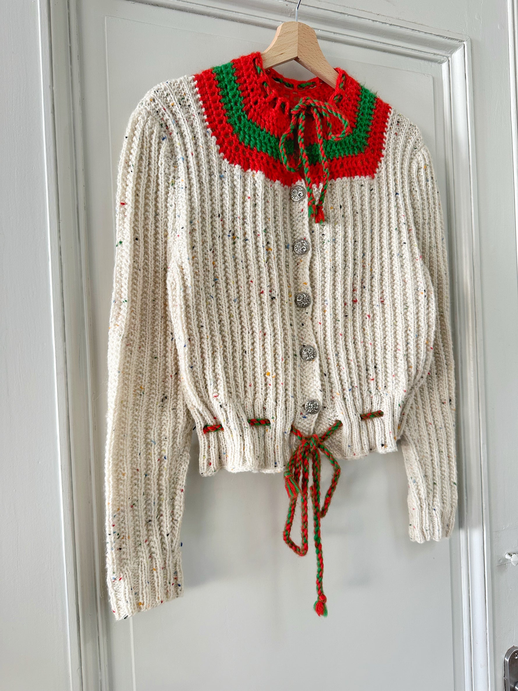 Unit price perCardigan autrichien en laine blanche chinée mouchetée multicolore, maille côtelée, col et cordons à nouer rouges et verts, boutons bijoux argentés fleuris, manches ballons, col et taille à nouer par un cordon torsadé, tricoté mains en Autriche, convient aux taille 36 et 38 porté ici sur un mannequin T36. Epaules 38cm Aisselles 45cm Longueur 60cm