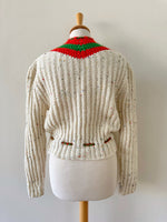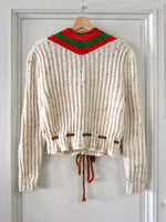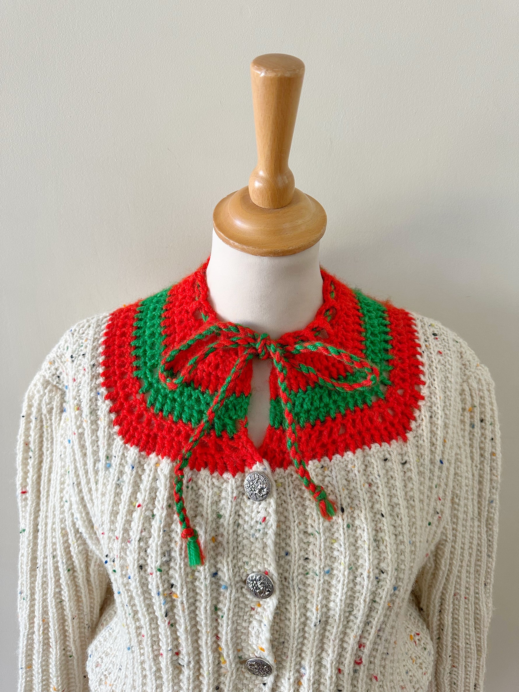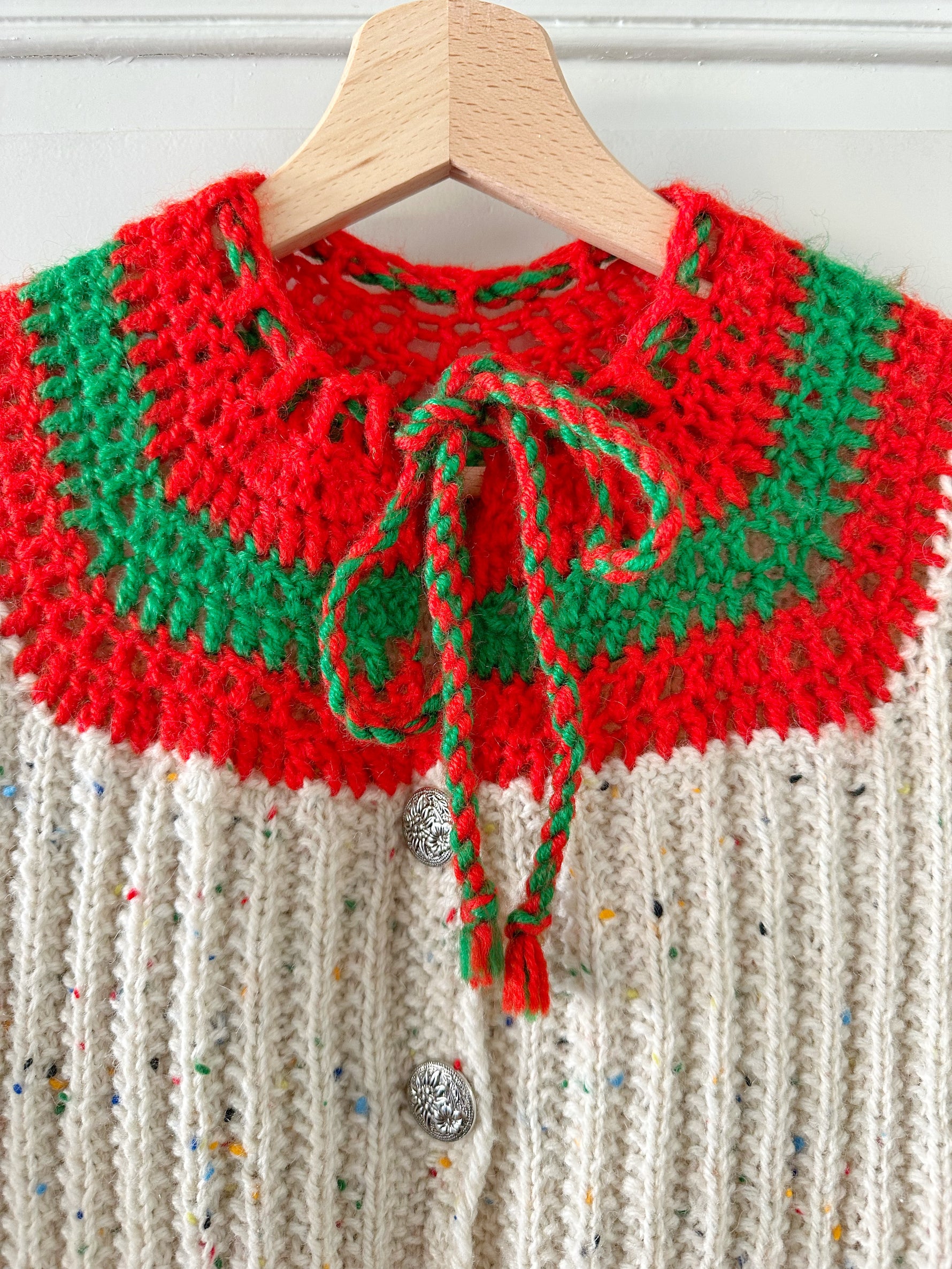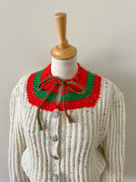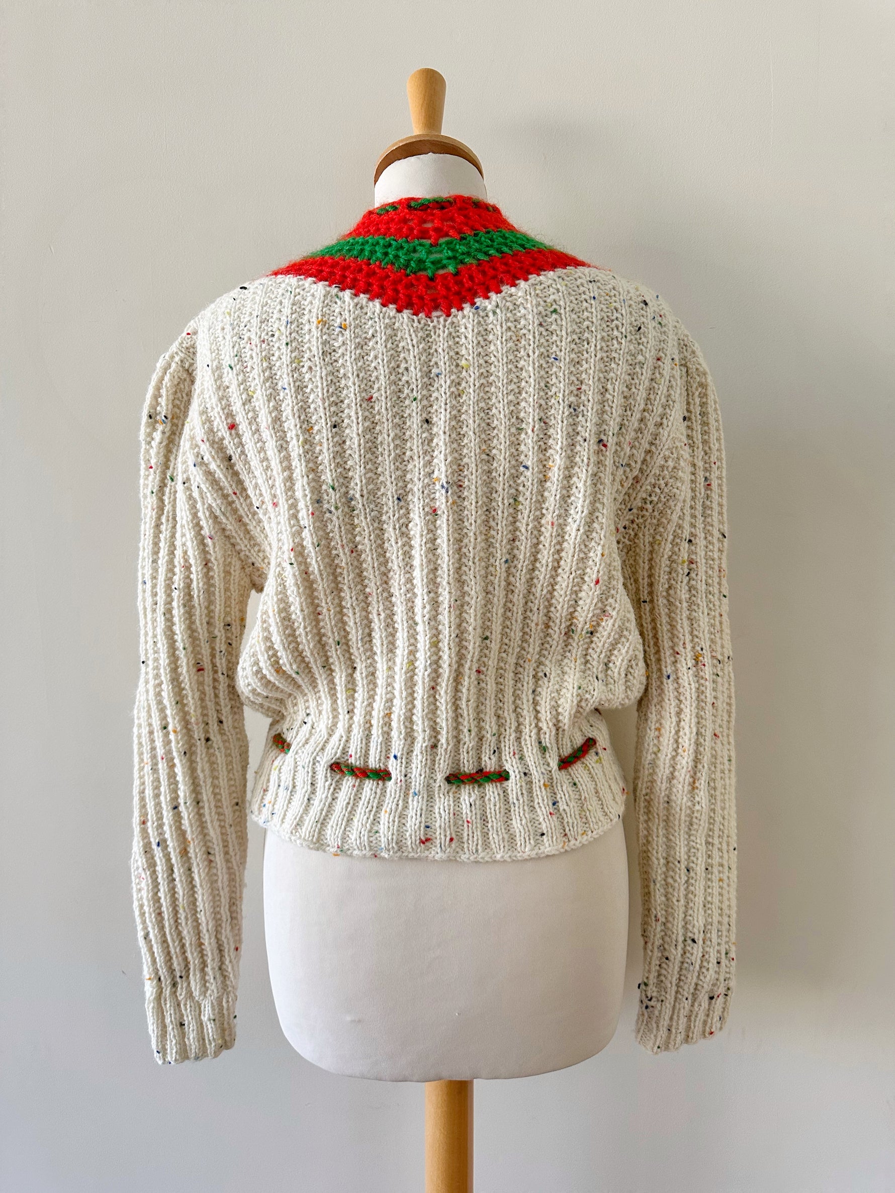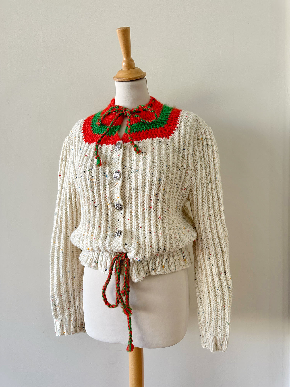 Unit price perCardigan autrichien en laine blanche chinée mouchetée multicolore, maille côtelée, col et cordons à nouer rouges et verts, boutons bijoux argentés fleuris, manches ballons, col et taille à nouer par un cordon torsadé, tricoté mains en Autriche, convient aux taille 36 et 38 porté ici sur un mannequin T36. Epaules 38cm Aisselles 45cm Longueur 60cm