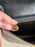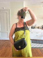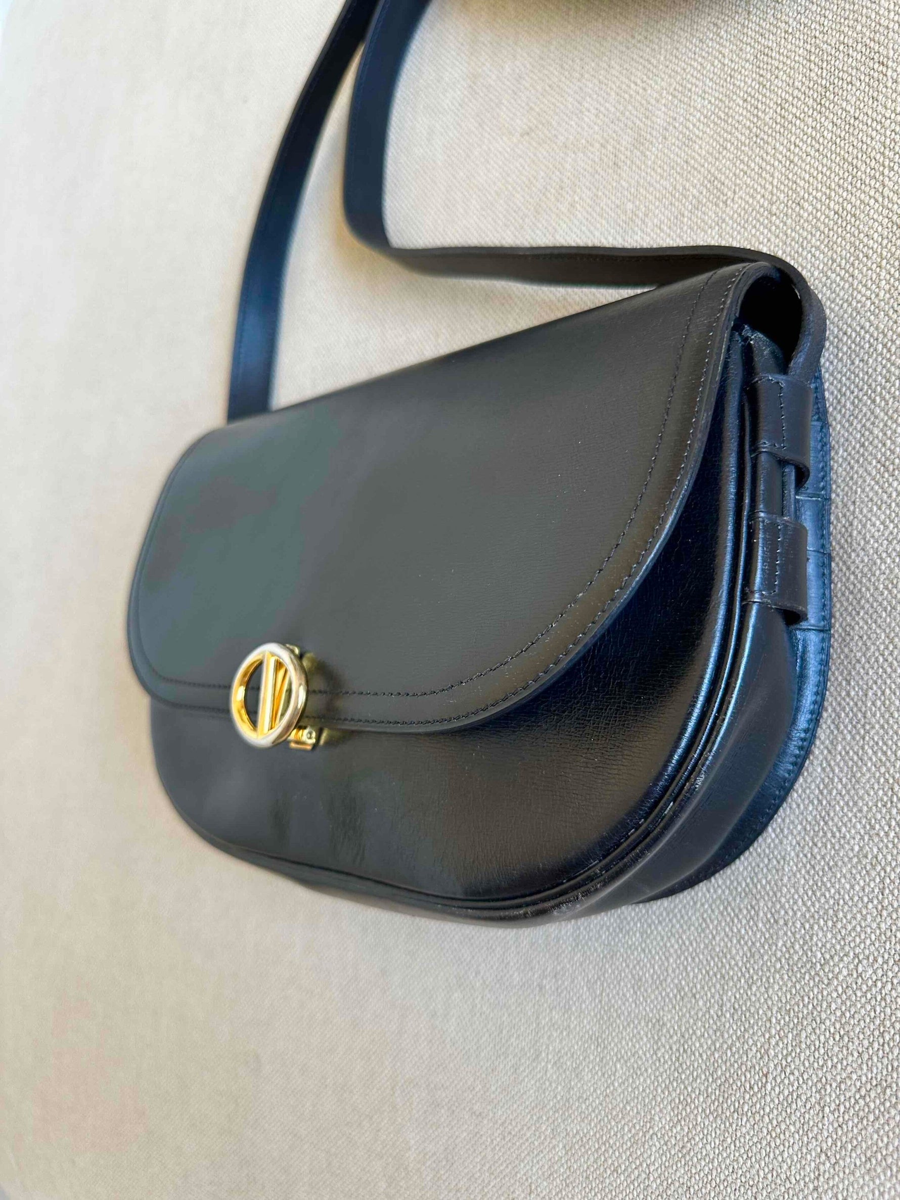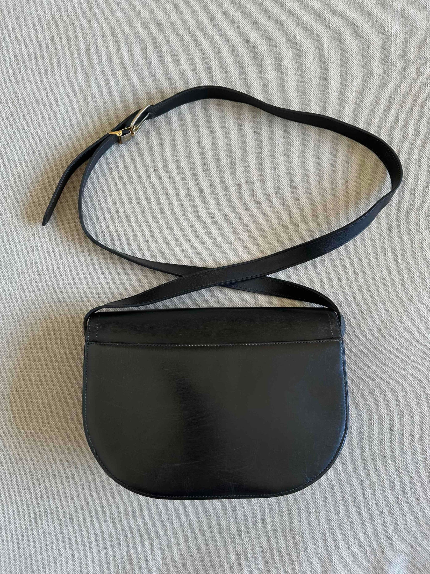 Unit price perChristian Dior Bobby bag, saddle bag shape, 80s Bobby model, in smooth black leather, CD gold-plated saddle buckle, adjustable strap with buckle.