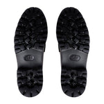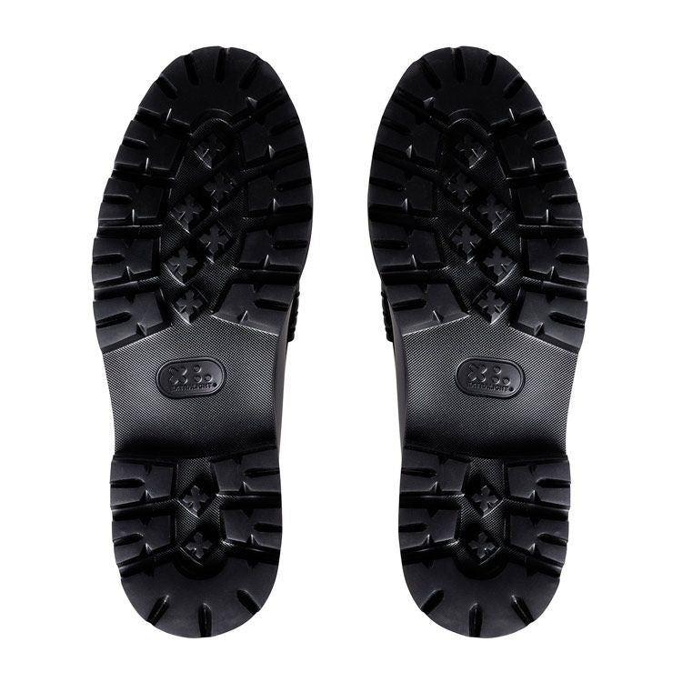 Hand-stitched polished leather moccasins, leather insoles with gold foil marking, rubber outsole.