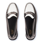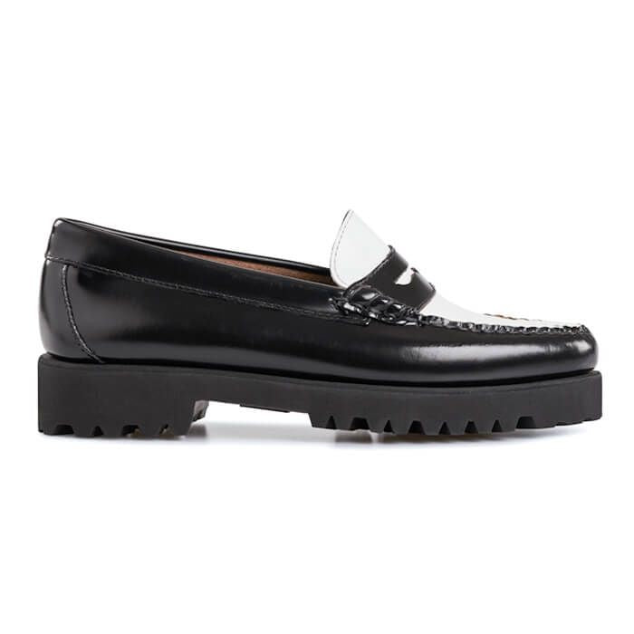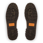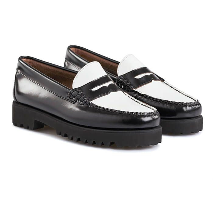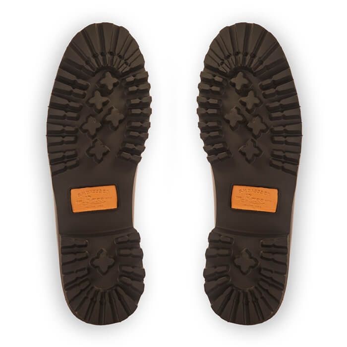 Hand-stitched polished leather moccasins, leather insoles with gold foil marking, rubber outsole.