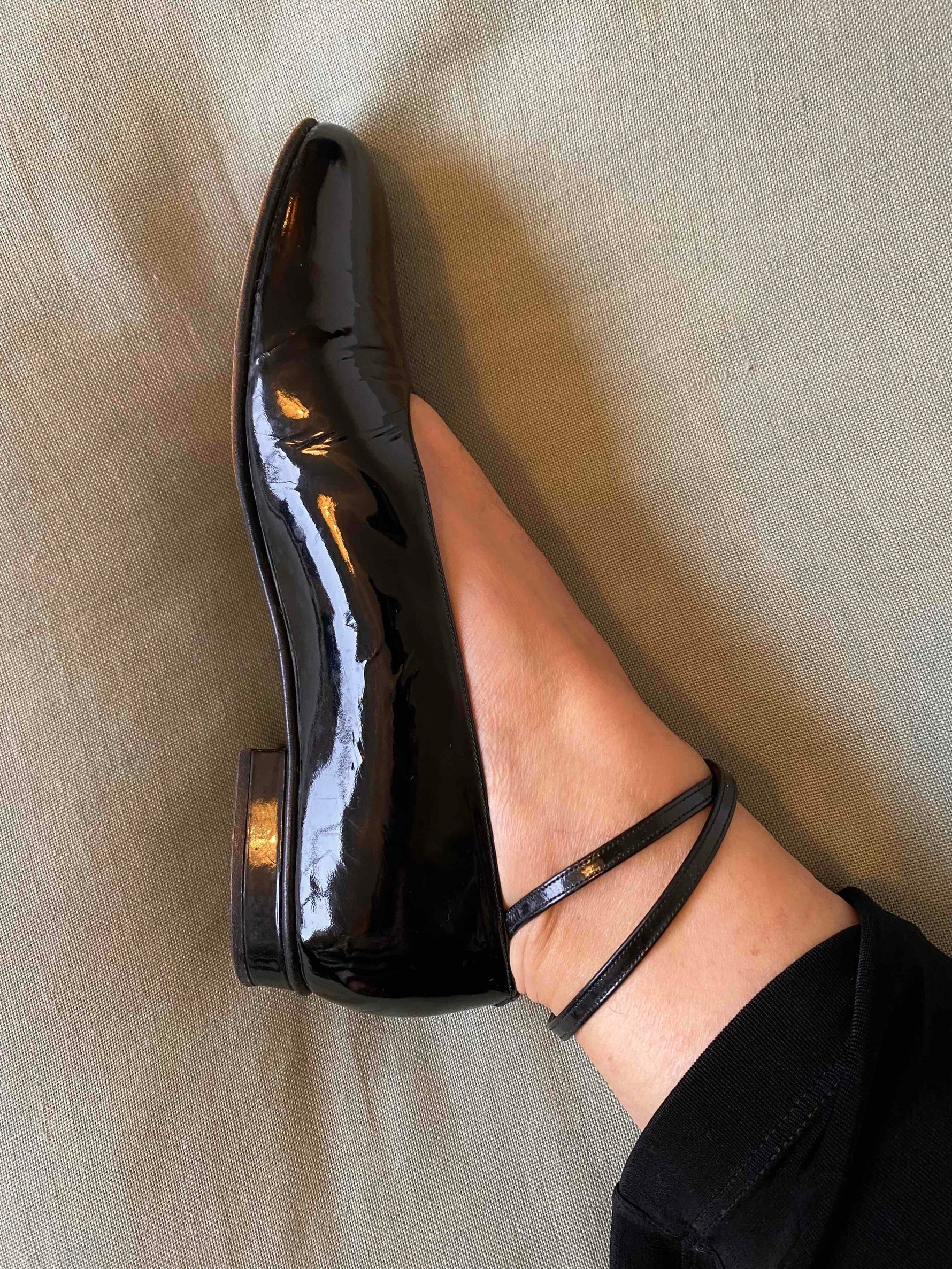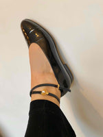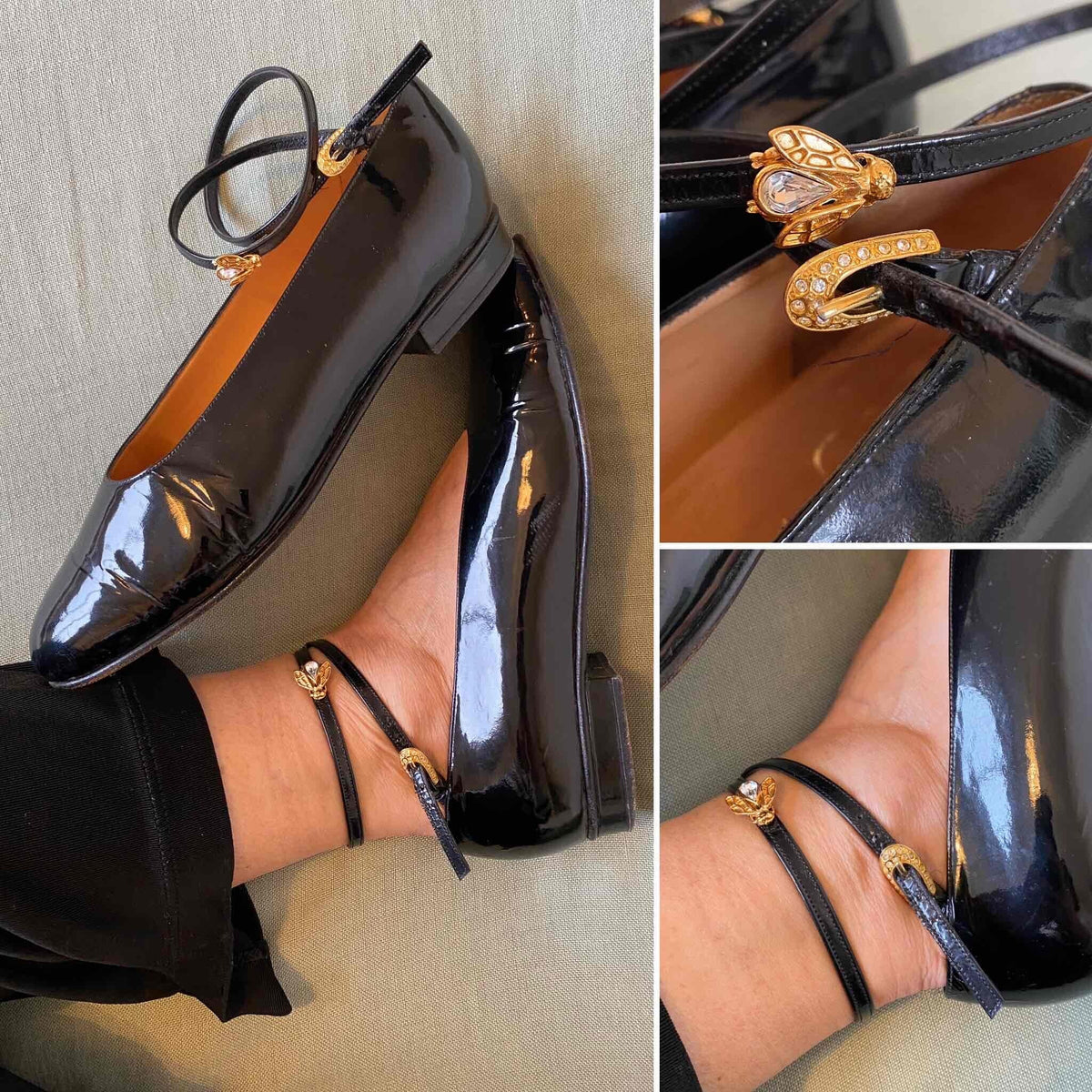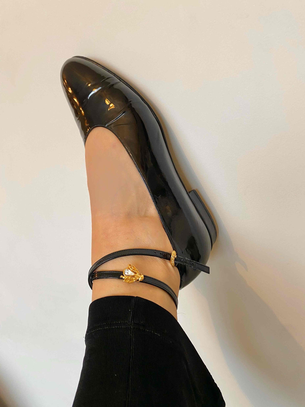 Christian Dior ballet flats, in black patent leather, with double ankle straps to tie, gold-colored buckle with rhinestones and a small gold and rhinestone bee jewel piece, made in France, "cut, assembled and finished by hand", true size 38, sole length 25cm, small 1.5cm heels.