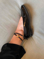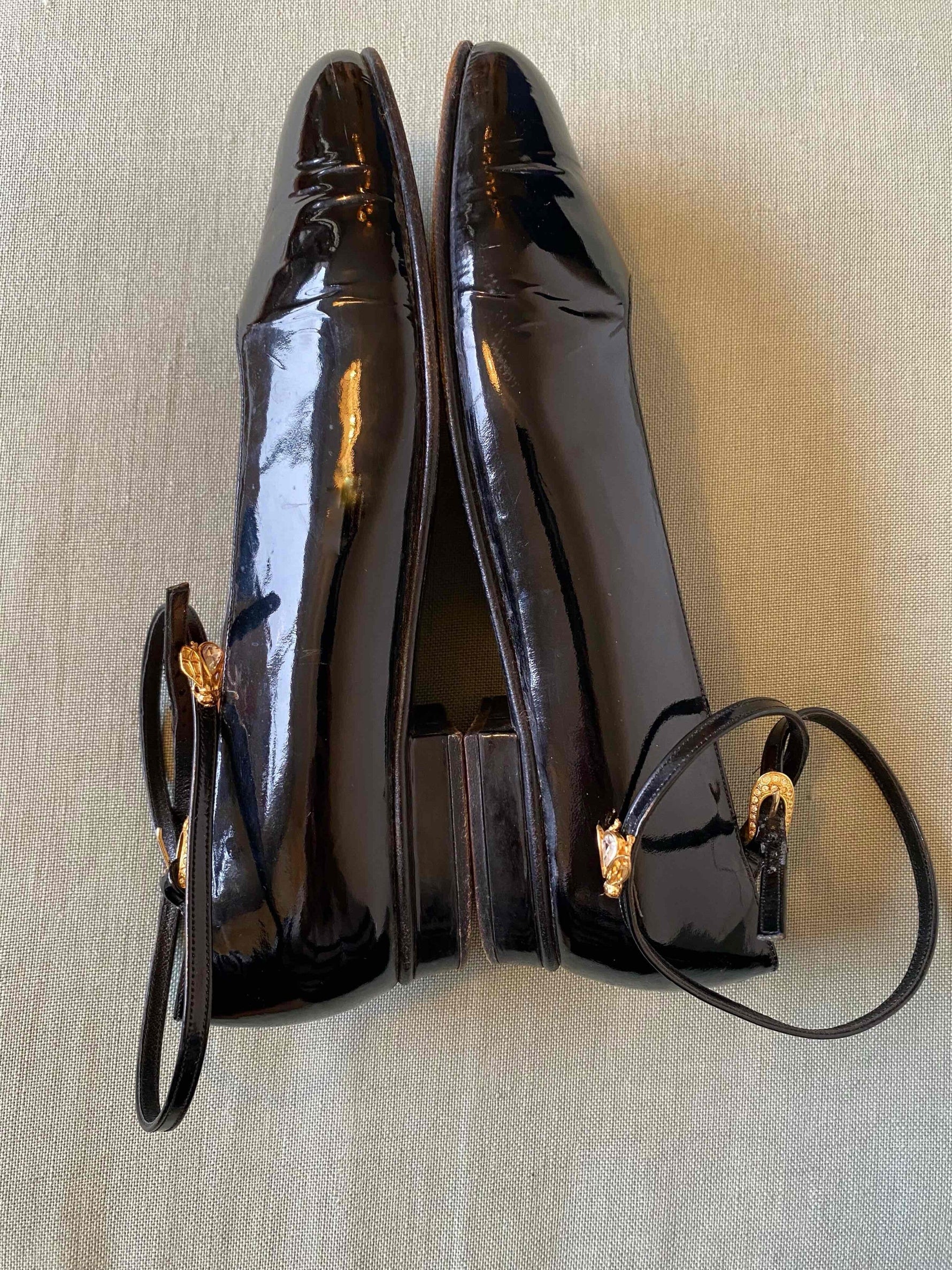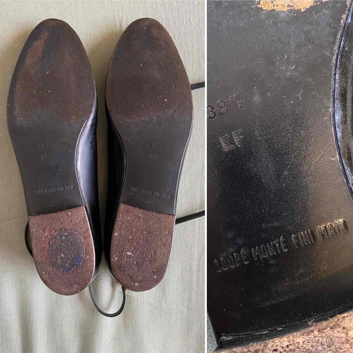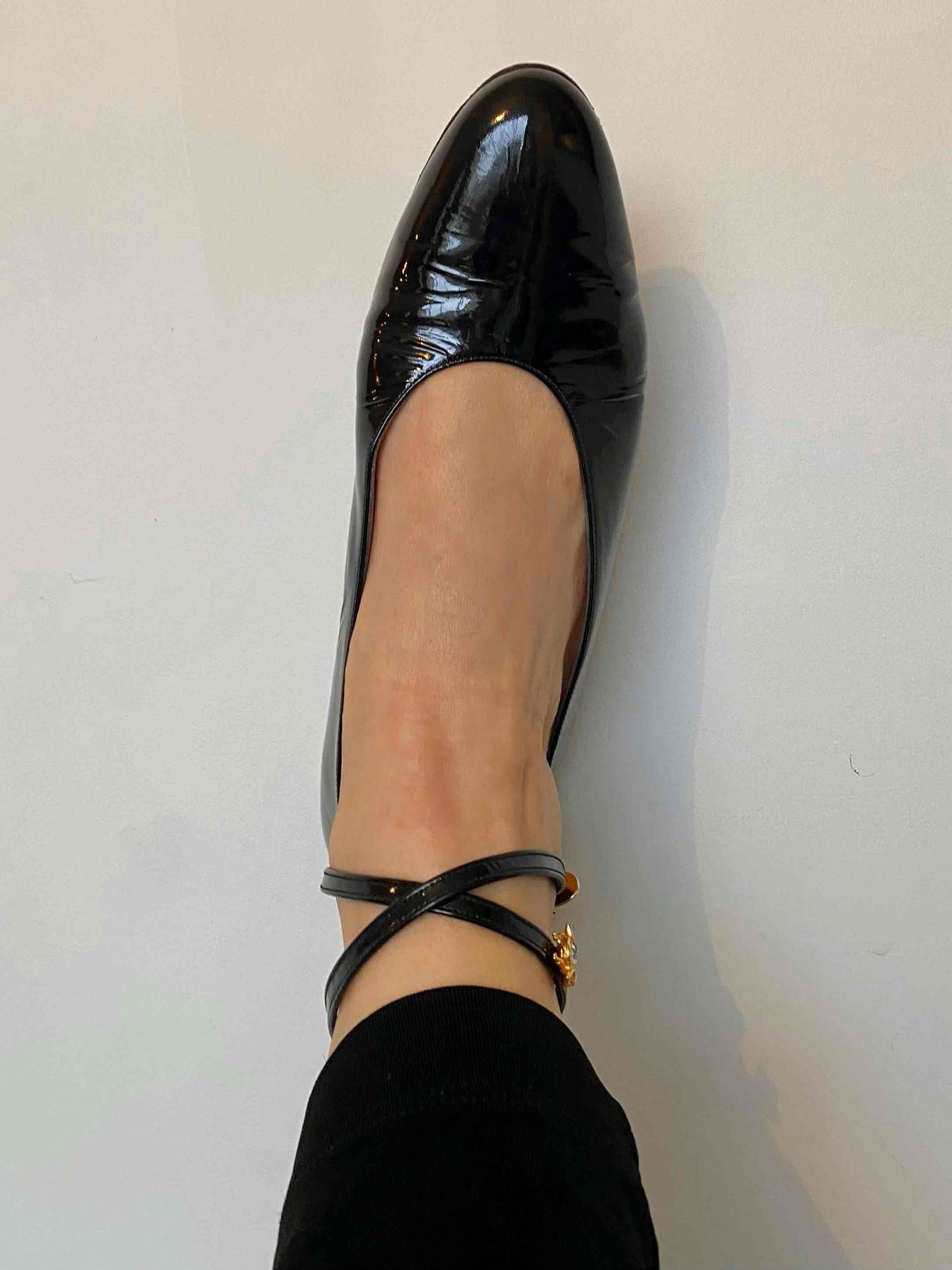 Christian Dior ballet flats, in black patent leather, with double ankle straps to tie, gold-colored buckle with rhinestones and a small gold and rhinestone bee jewel piece, made in France, "cut, assembled and finished by hand", true size 38, sole length 25cm, small 1.5cm heels.