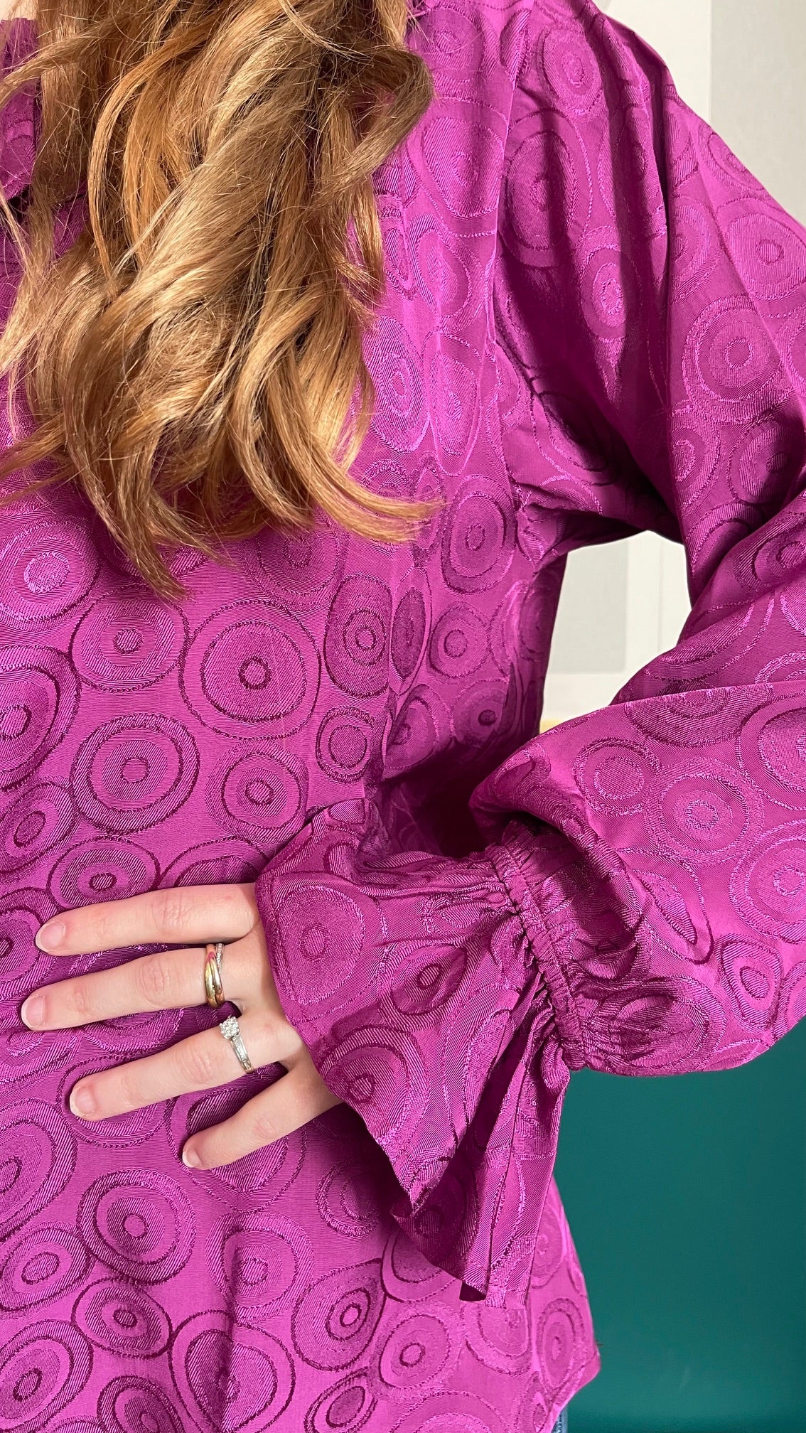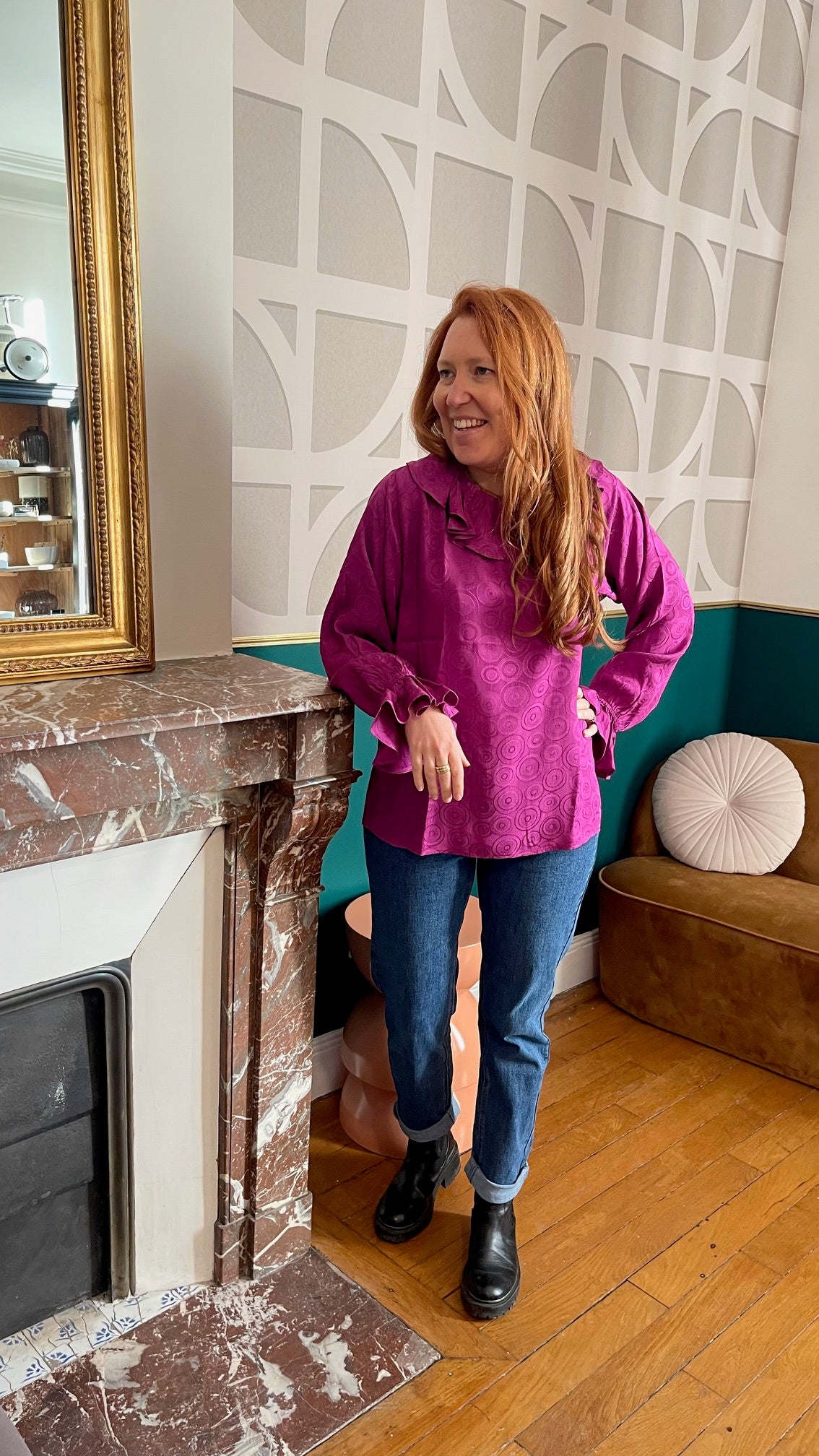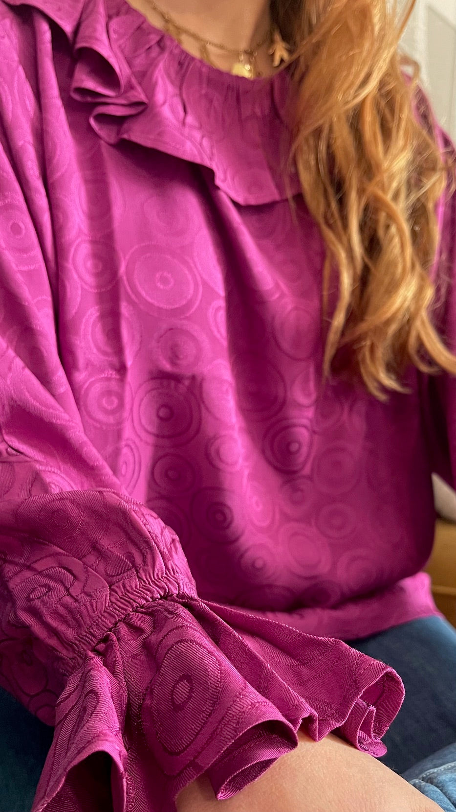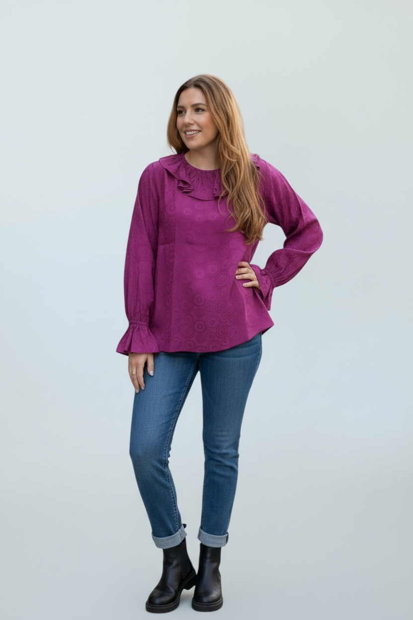 A feminine blouse with a ruffled collar, enhanced by a unique spiral print. The long sleeves end in turned-up cuffs adorned with a delicate ruffle, adding an elegant and refined touch. The round, ruffled neckline opens at the back with a small, discreet button, both practical and feminine. Flowing and comfortable, this colorful blouse pairs easily for a chic everyday look or for a special occasion. Sizes S and M. Made in France. Material: 100% viscose. Care: Machine wash at 20°C on a delicate cycle at 800 rpm.