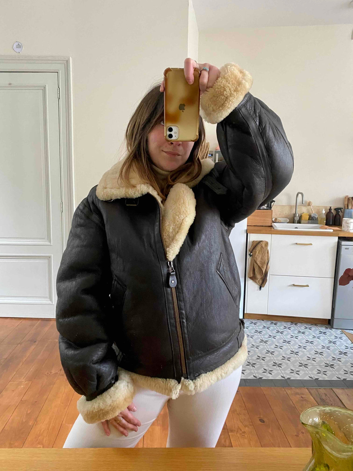 Unit price perSheepskin bomber jacket in reversed sheepskin with black chocolate leather exterior, natural ecru sheepskin interior, B3 type, made in France, size 40 or 38 oversized as worn here on a size 40 person.