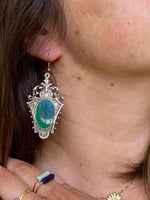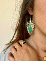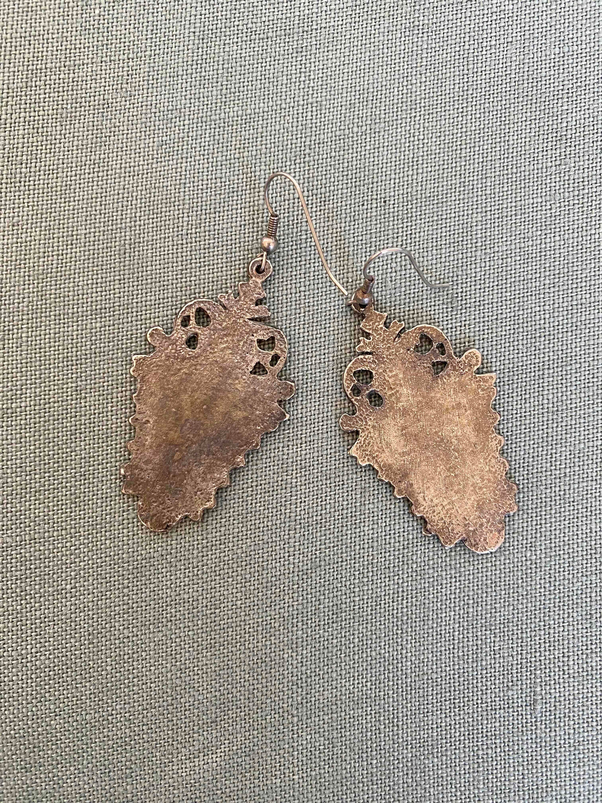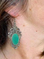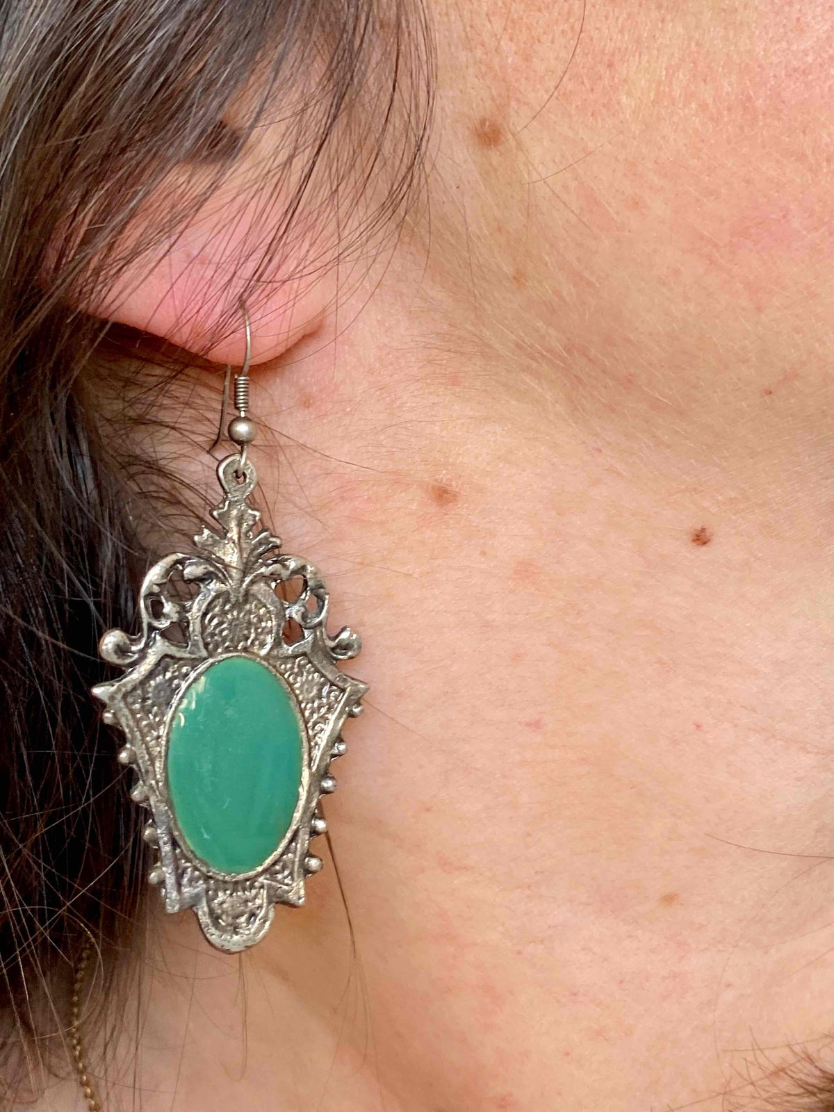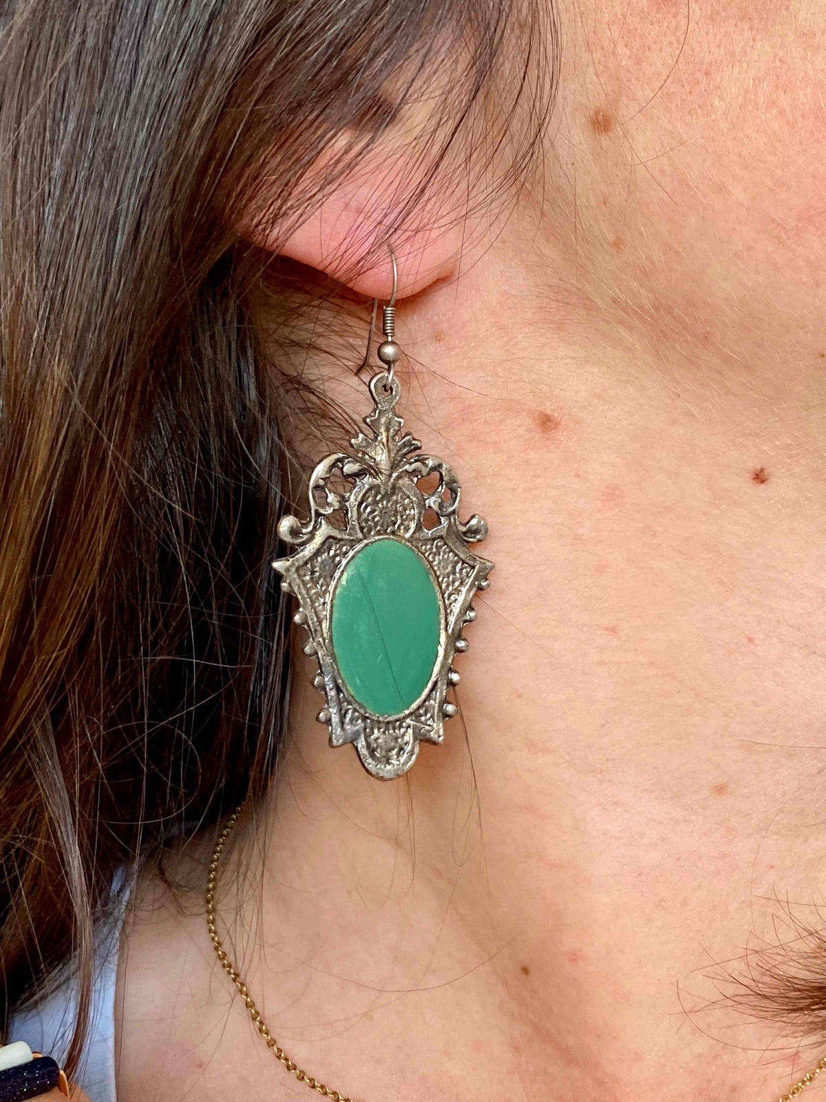 Unit price per70's earrings, in green enamel and silver-plated brass, baroque patterns, height 6.5cm, width 3.5cm.