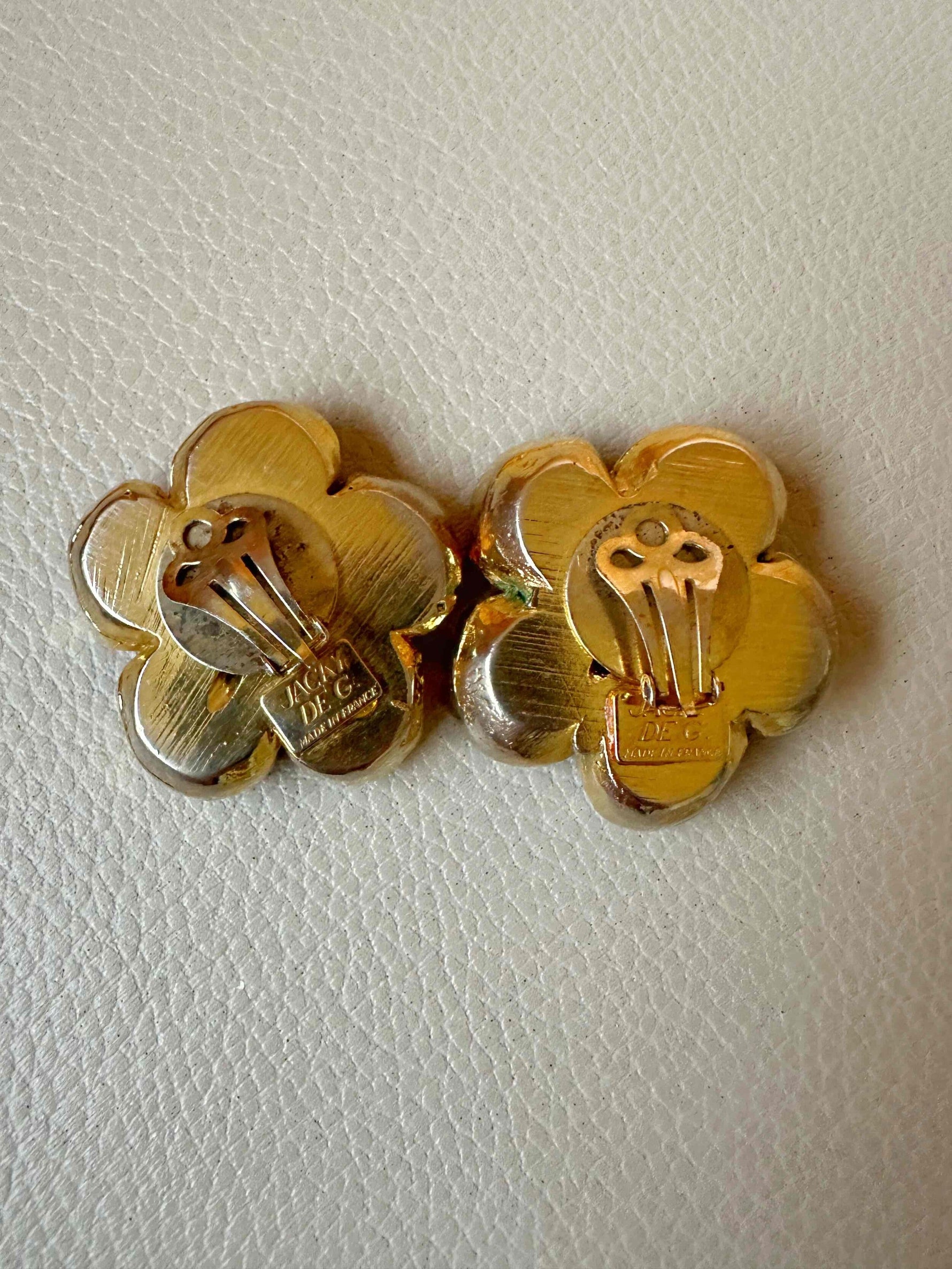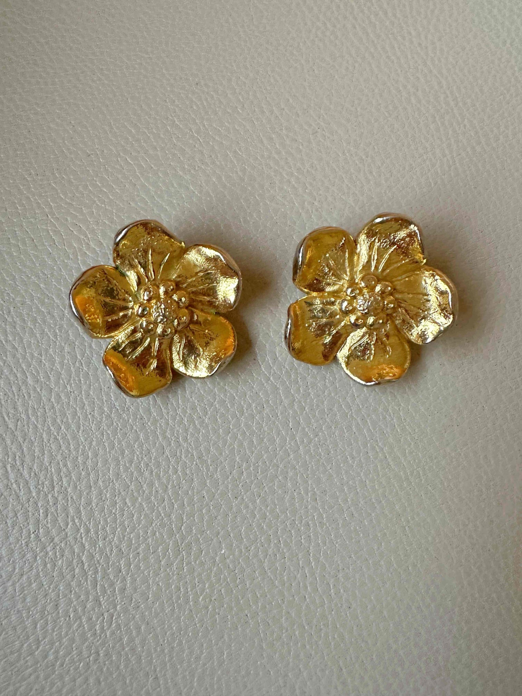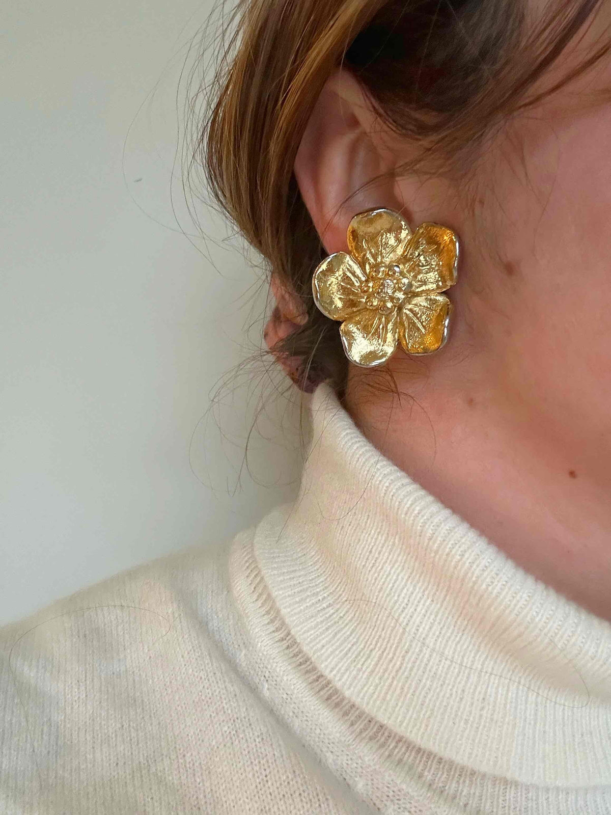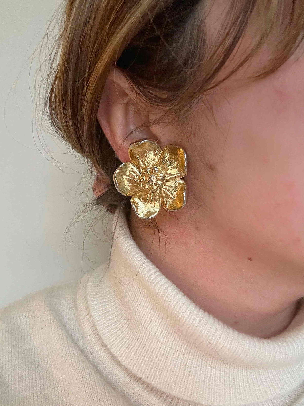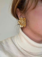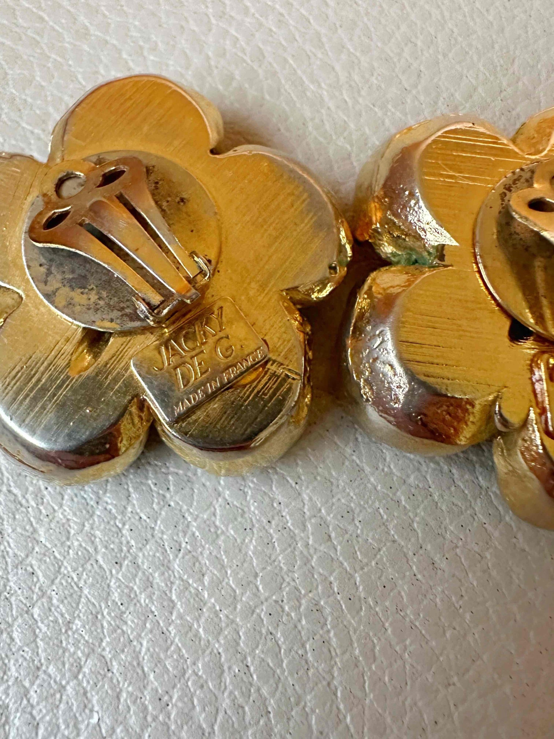 Unit price perClip-on earrings by Jacky de G, gold-plated brass, large camellia flowers, 4cm diameter. Made in France, 1980s.