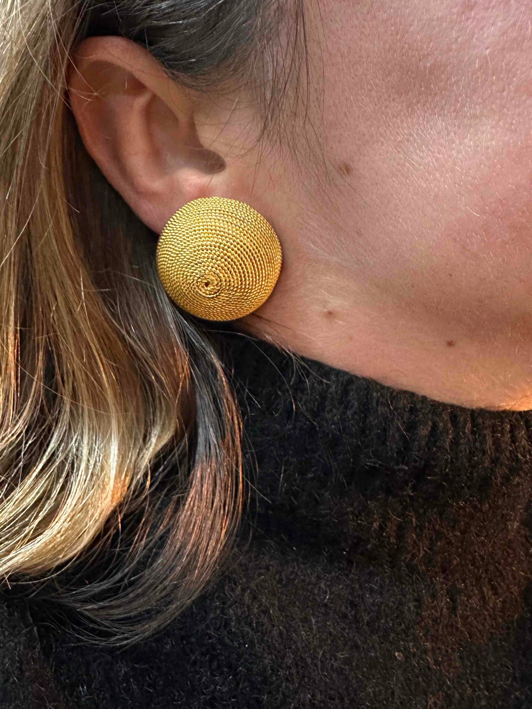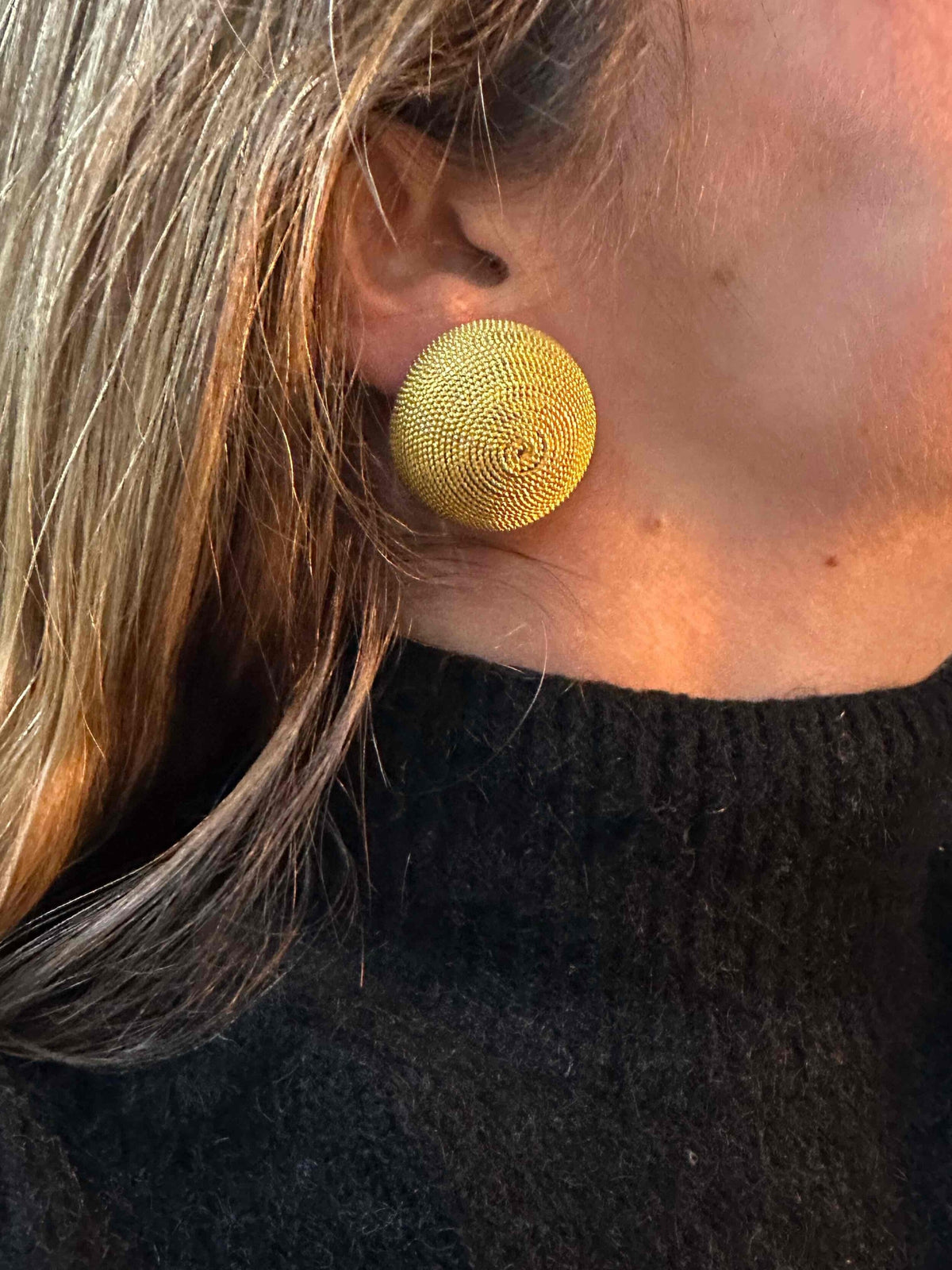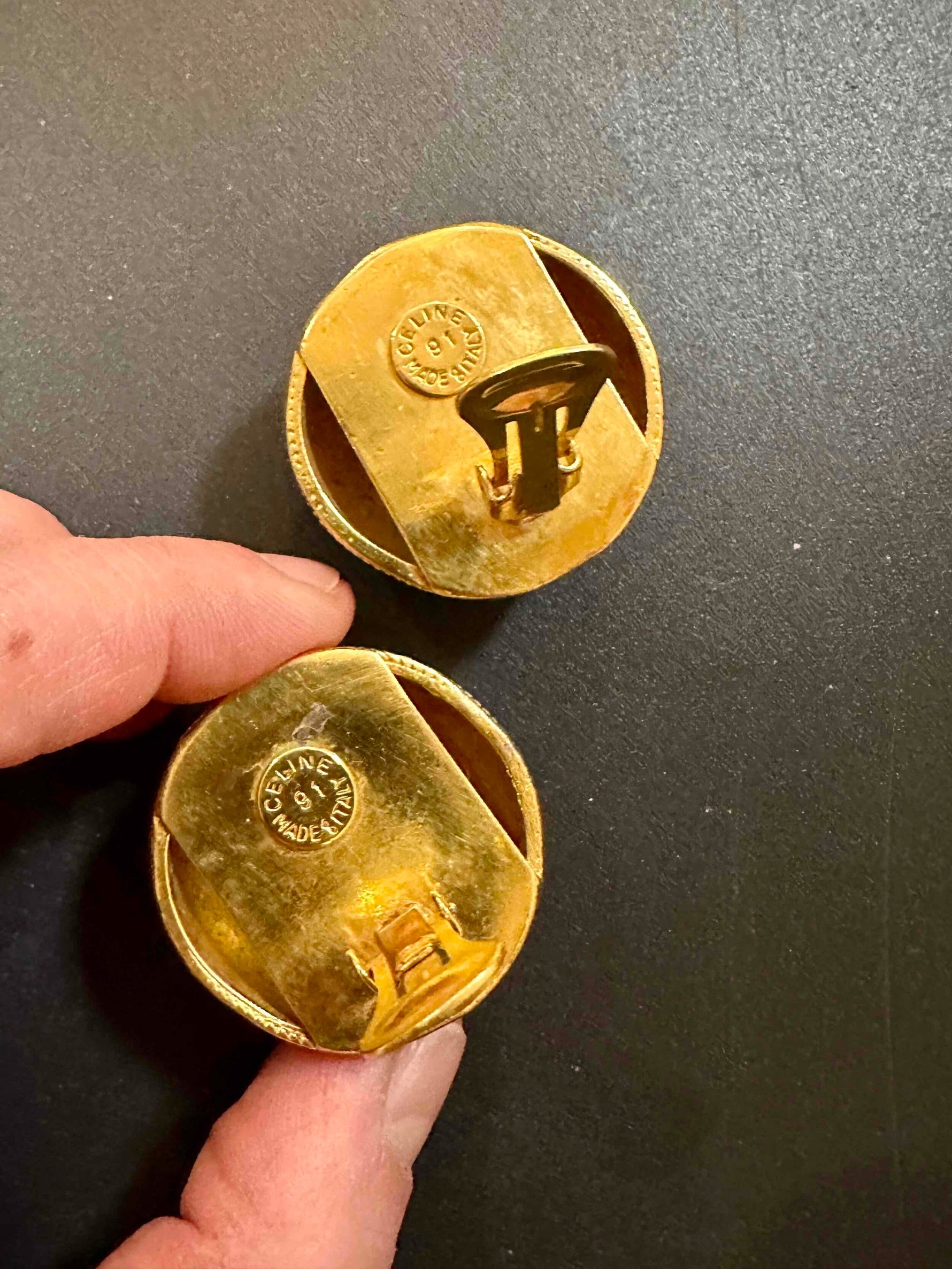 Celine clip-on earrings, in gold-plated brass, with hallmark, dome shape with chainette pattern, 3.5cm in diameter, made in Italy, 1980s.